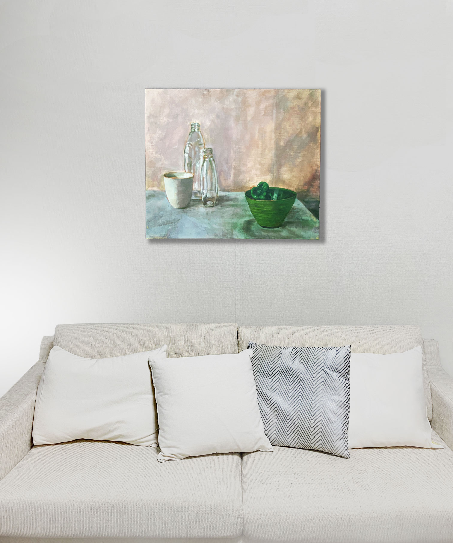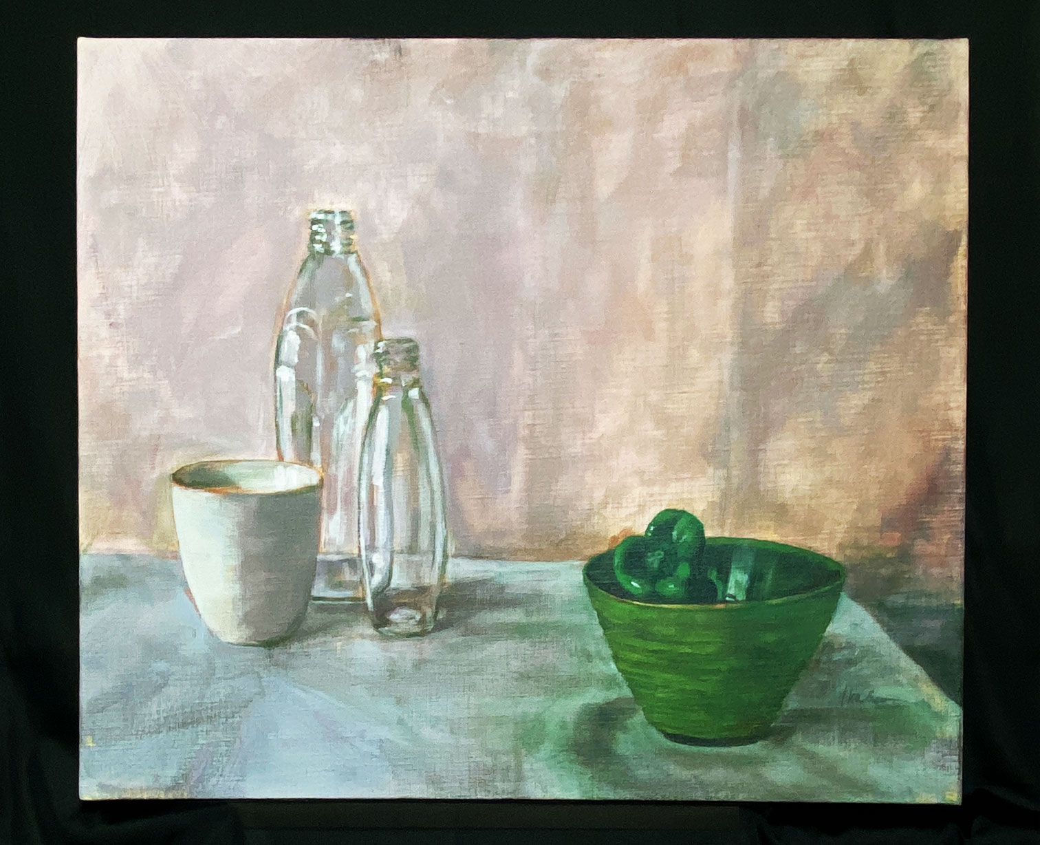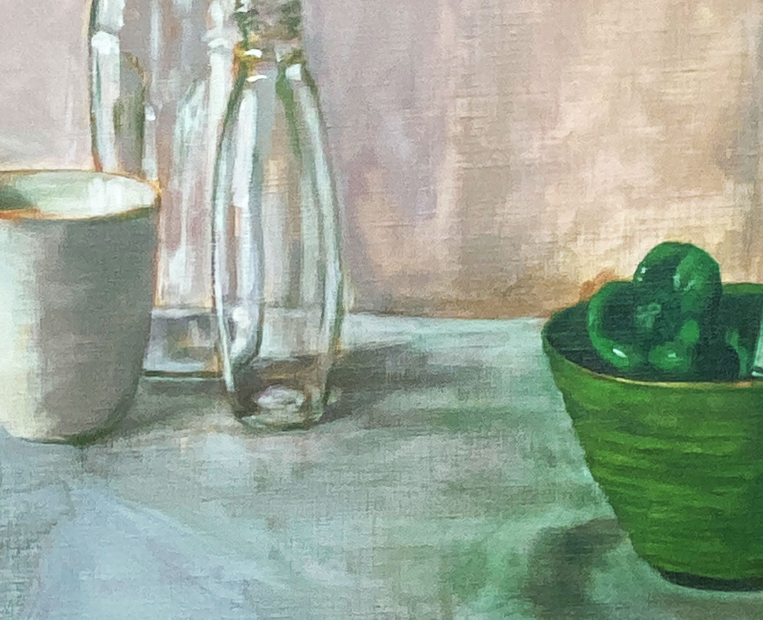 光るガラスの瓶の硬さ、グリーンのピーマンの柔らかさと同色の器とのバランスが面白いと思いました。アクリル画なので、色は落ちません。額縁無しでそのまま飾っていただけます。