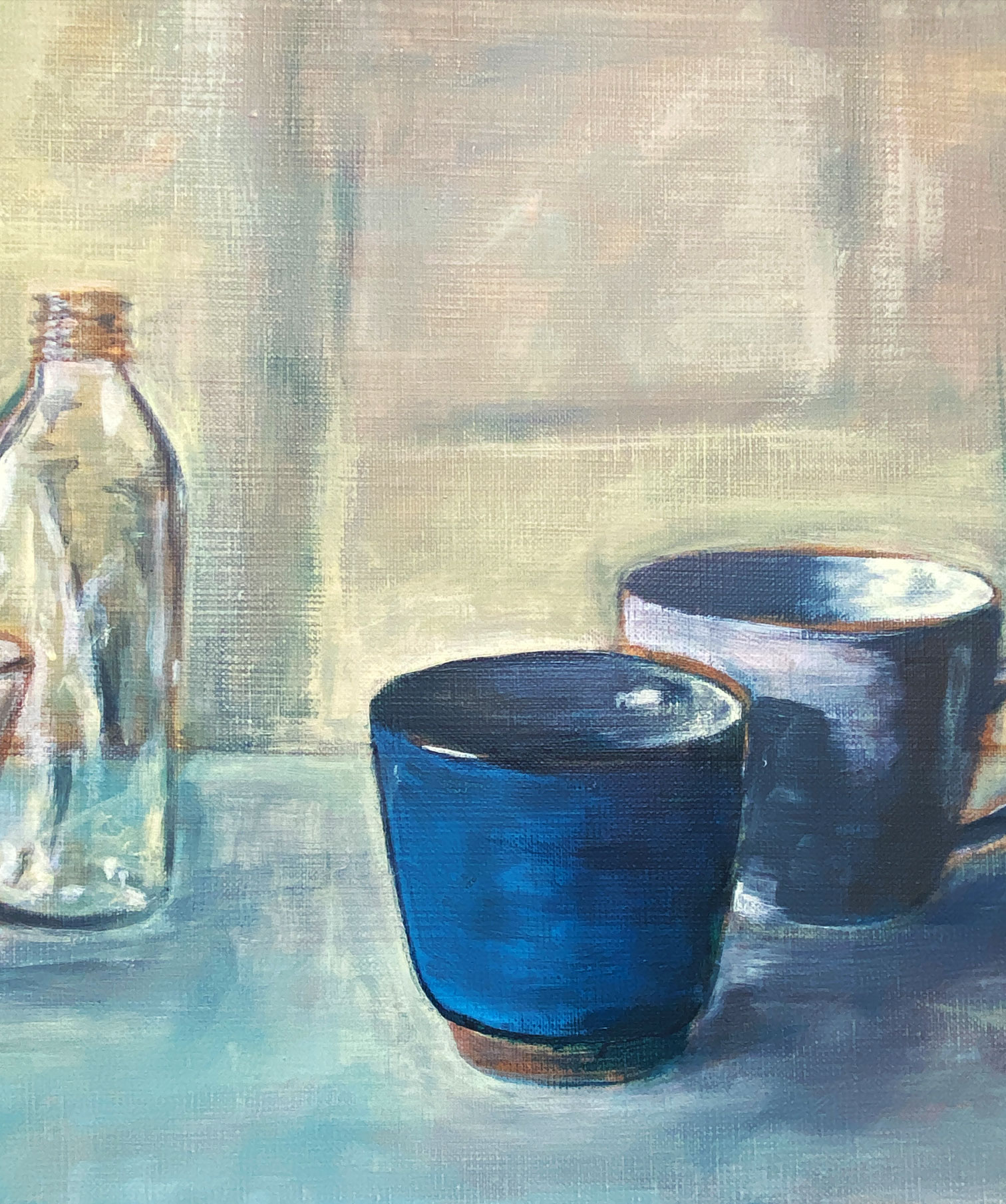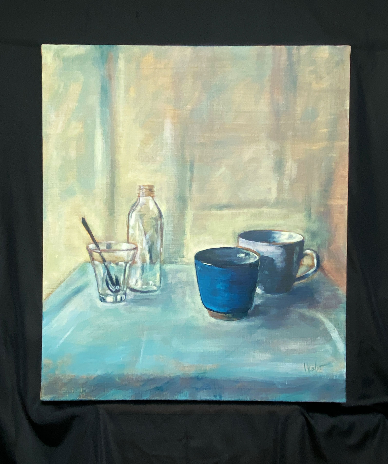背景をやや黄色味を帯びた色、そこへ青い器を対比させて引き立てました。反対色どうしのバランスを取るよう工夫して描きました。アクリル画なので、色落ちしません。額縁無しで、そのまま飾っていただけます。