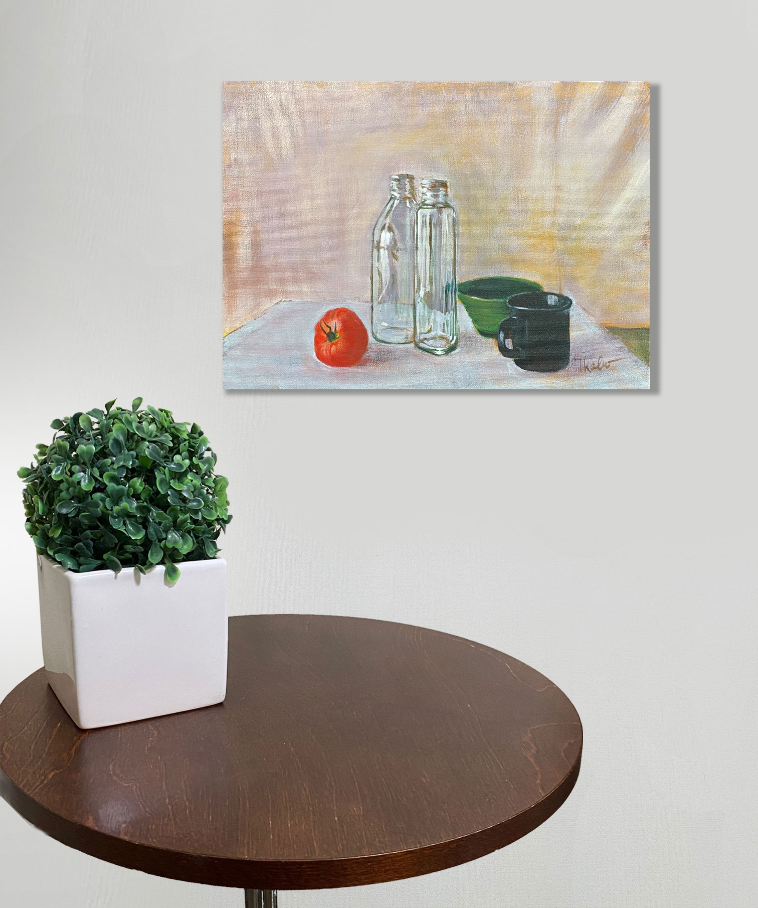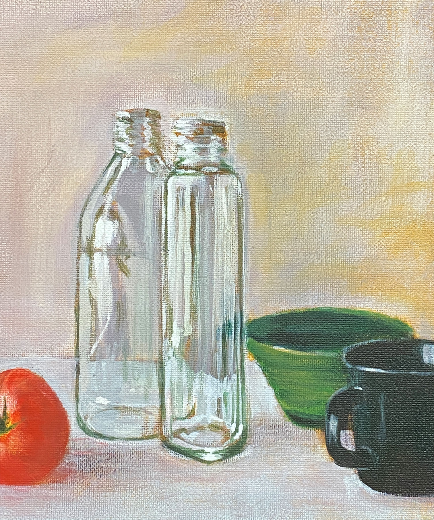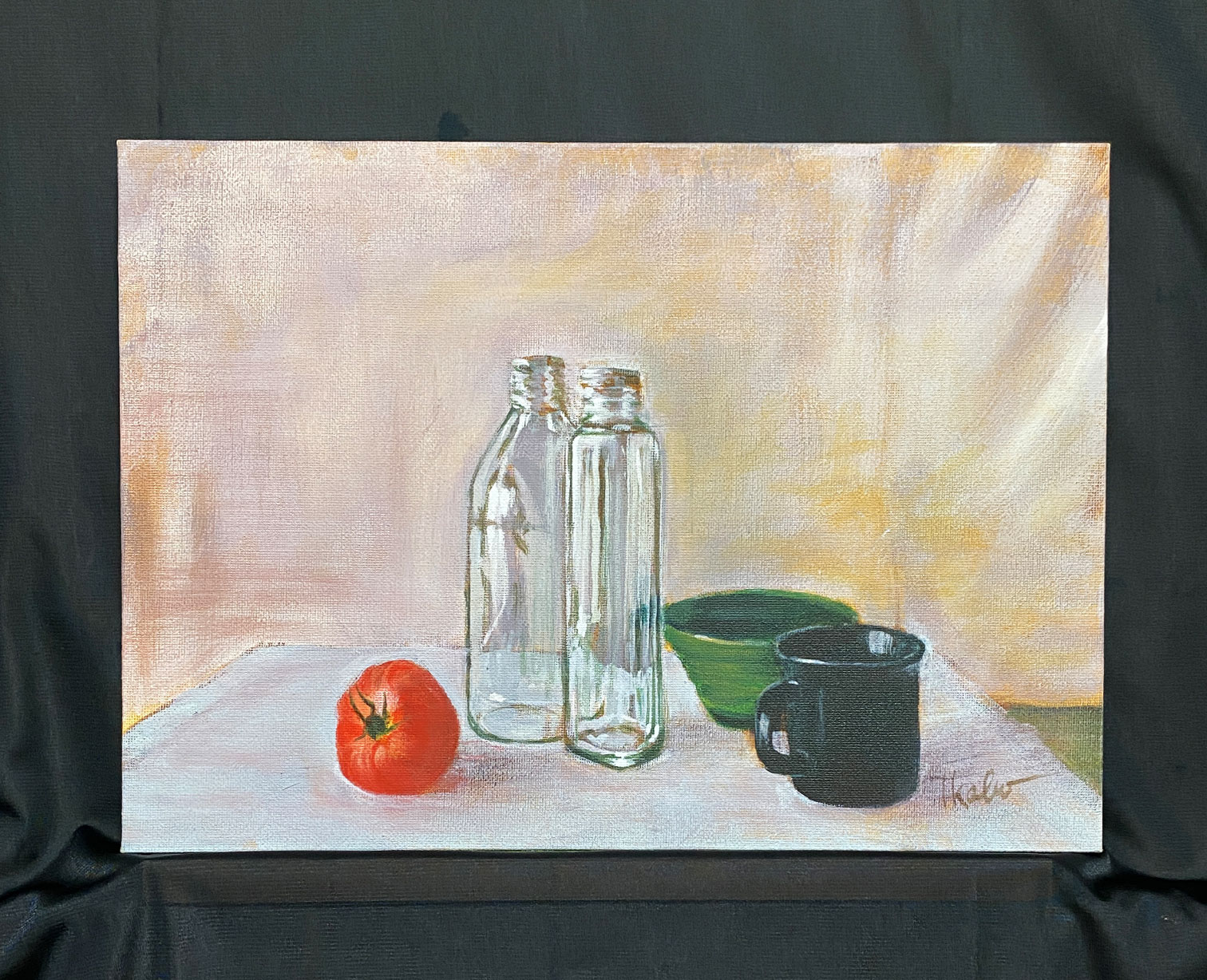2本のガラス瓶が主人公ですが、トマトの赤や陶器の器とも仲良く鎮座して面白い画面になりました。F4の小作品です。アクリル画なので色落ちせず、額縁無しでそのまま飾っていただけます。