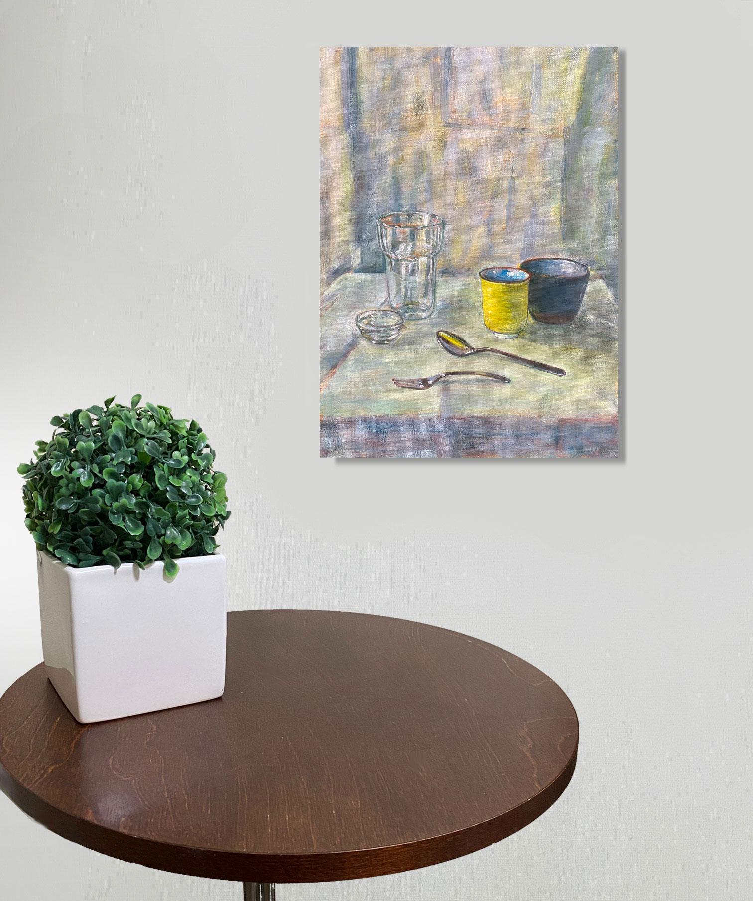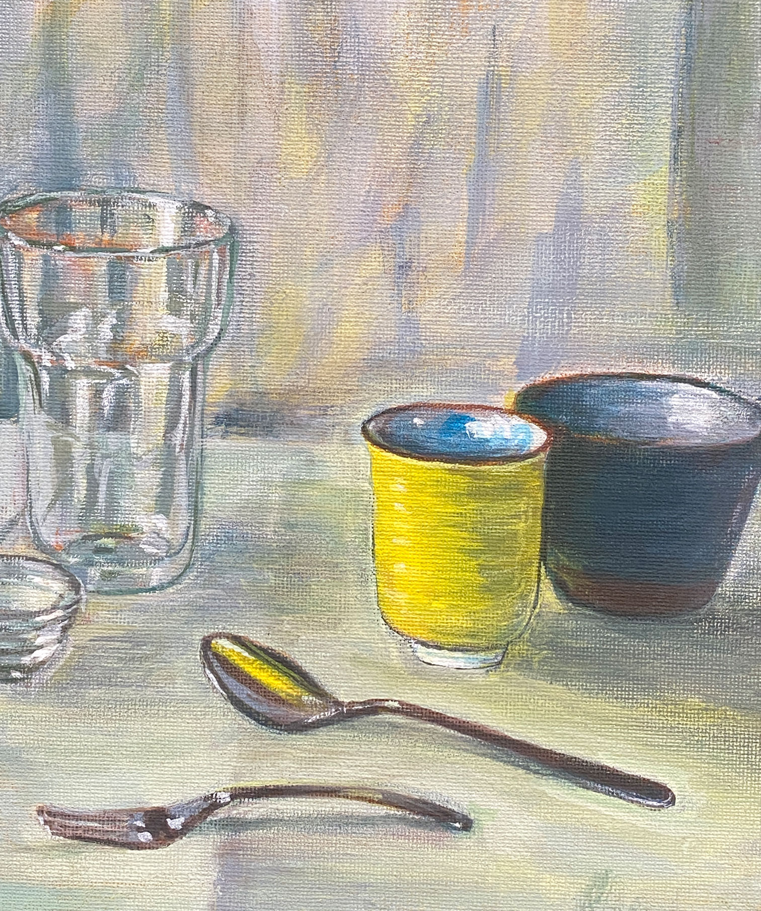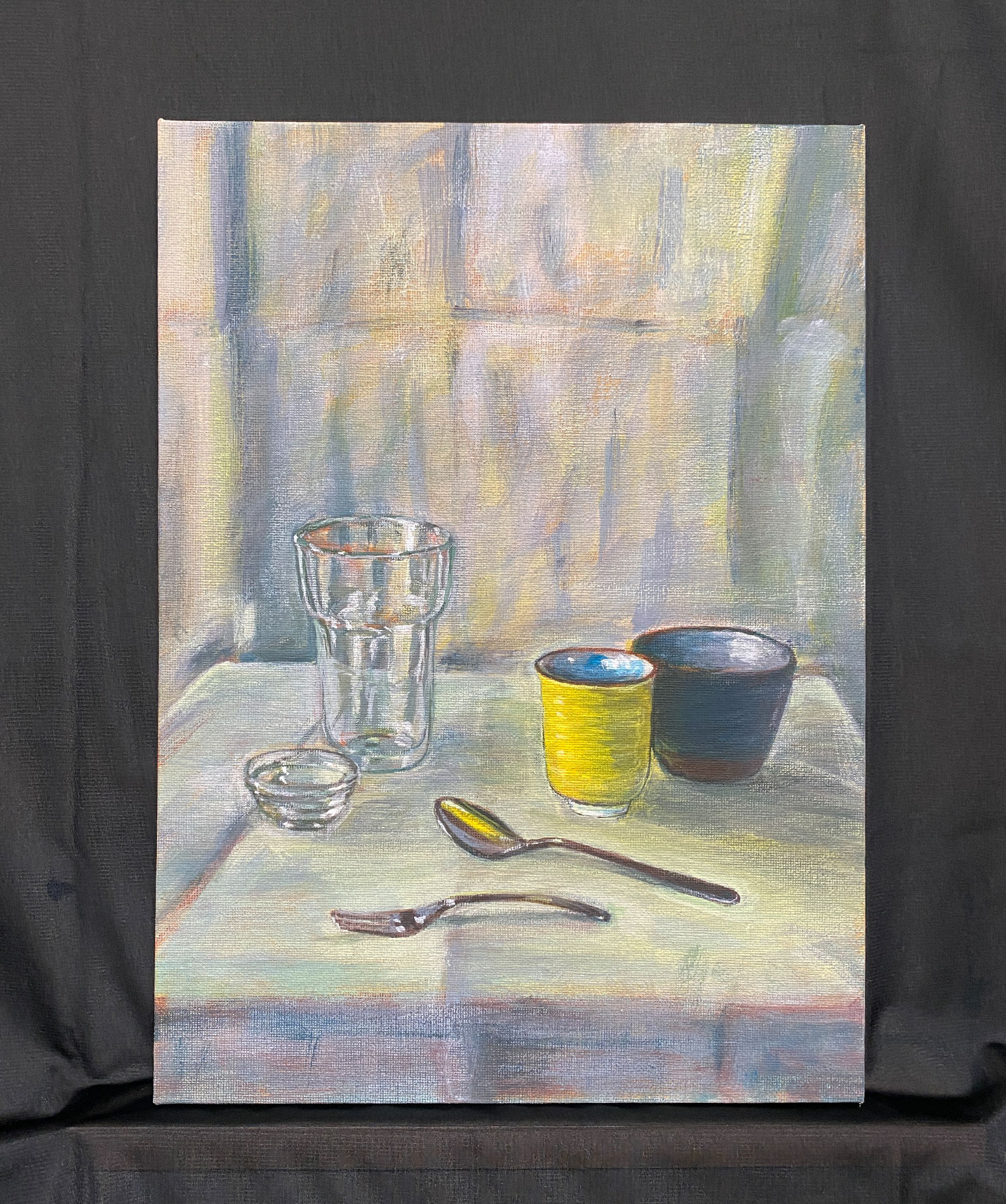 黄色と青の反対色の器を隣同士に置いて、互いを引き立てました。全体にもその2色を反射させて色のバランスを取りました。F4の小作品です。アクリル画なので色落ちせず、額縁無しでそのまま飾っていただけます。