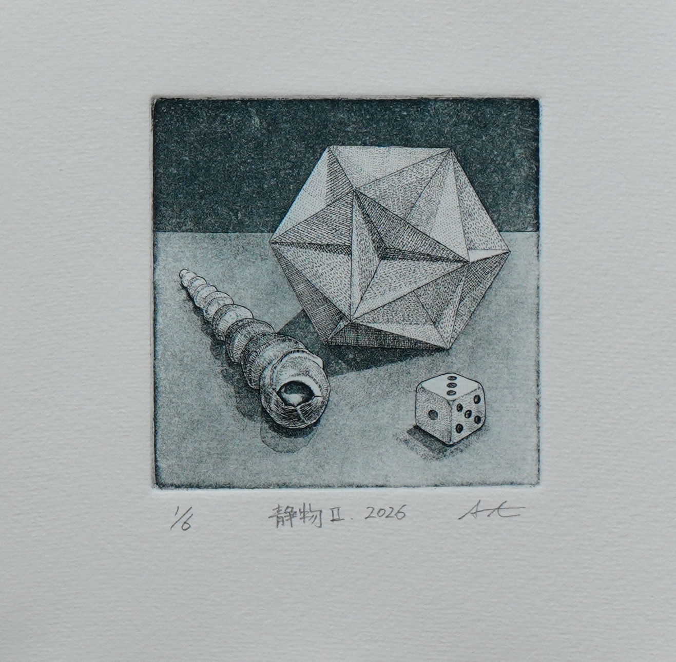 多面体のある静物画です.多面体や巻き貝には共通して数学的な美しさがあり,それぞれが干渉し合って,物語を作り出しているようで,時に思想を巡らせたり,癒やしの時間になれば嬉しいです.
