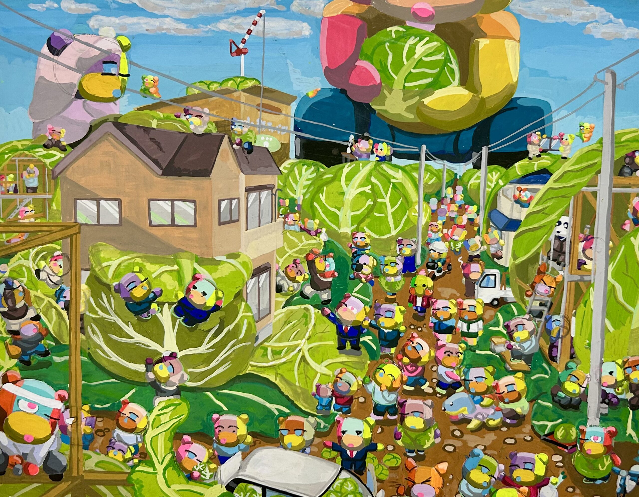 キャベツの葉を一枚剥くと新築住宅が現れ、施主一家に引き渡されています。