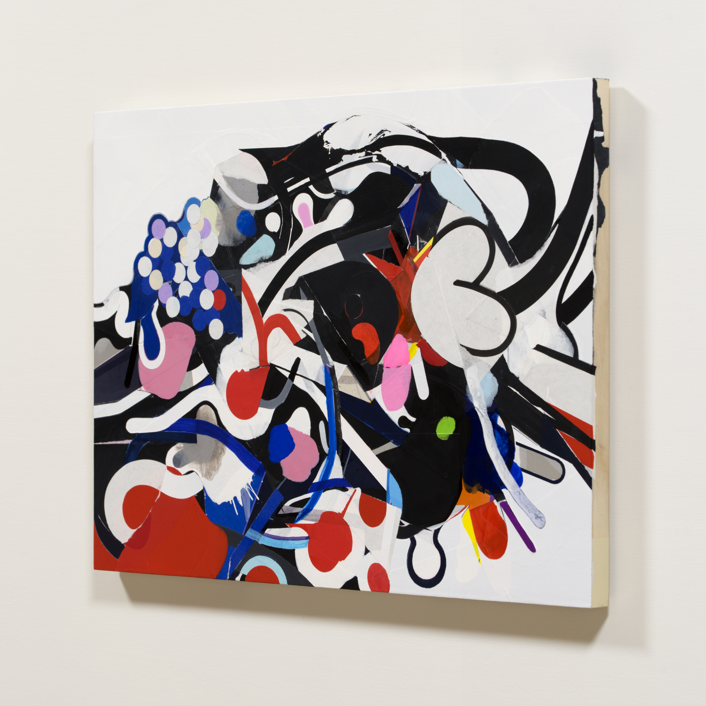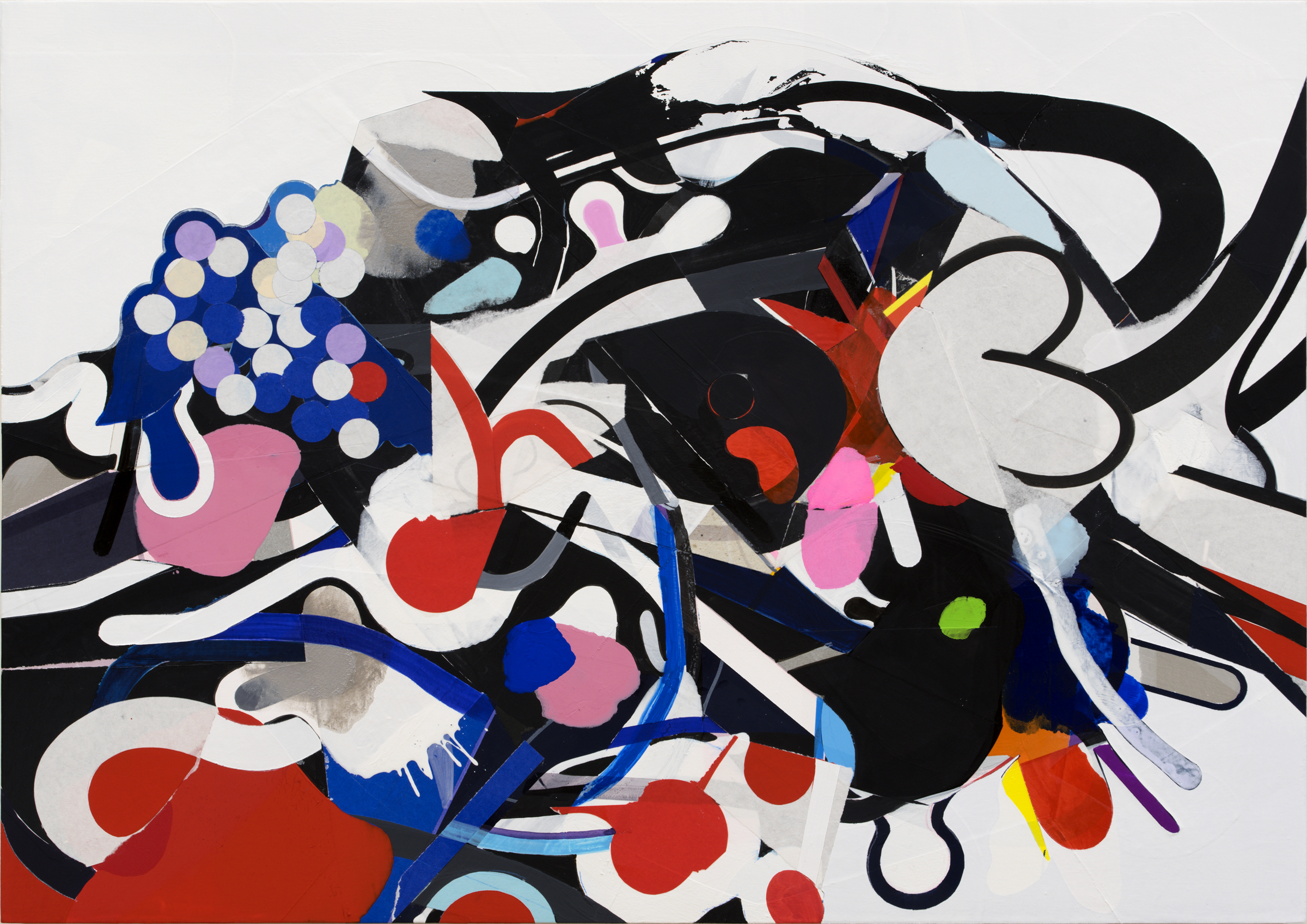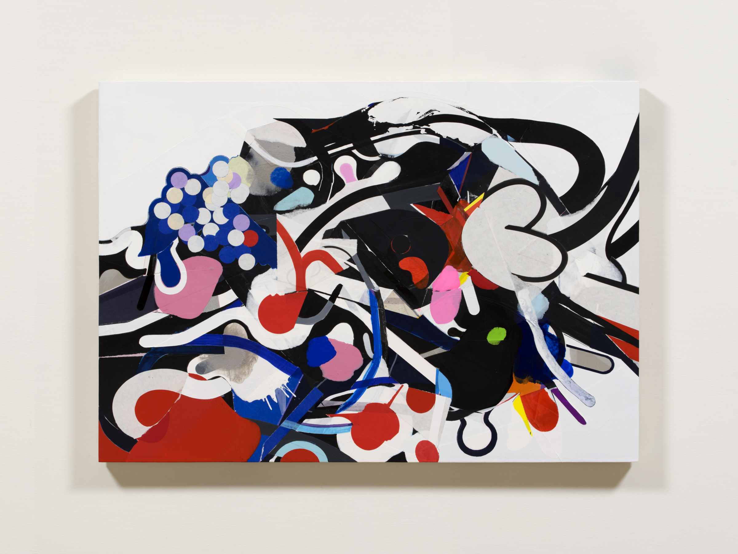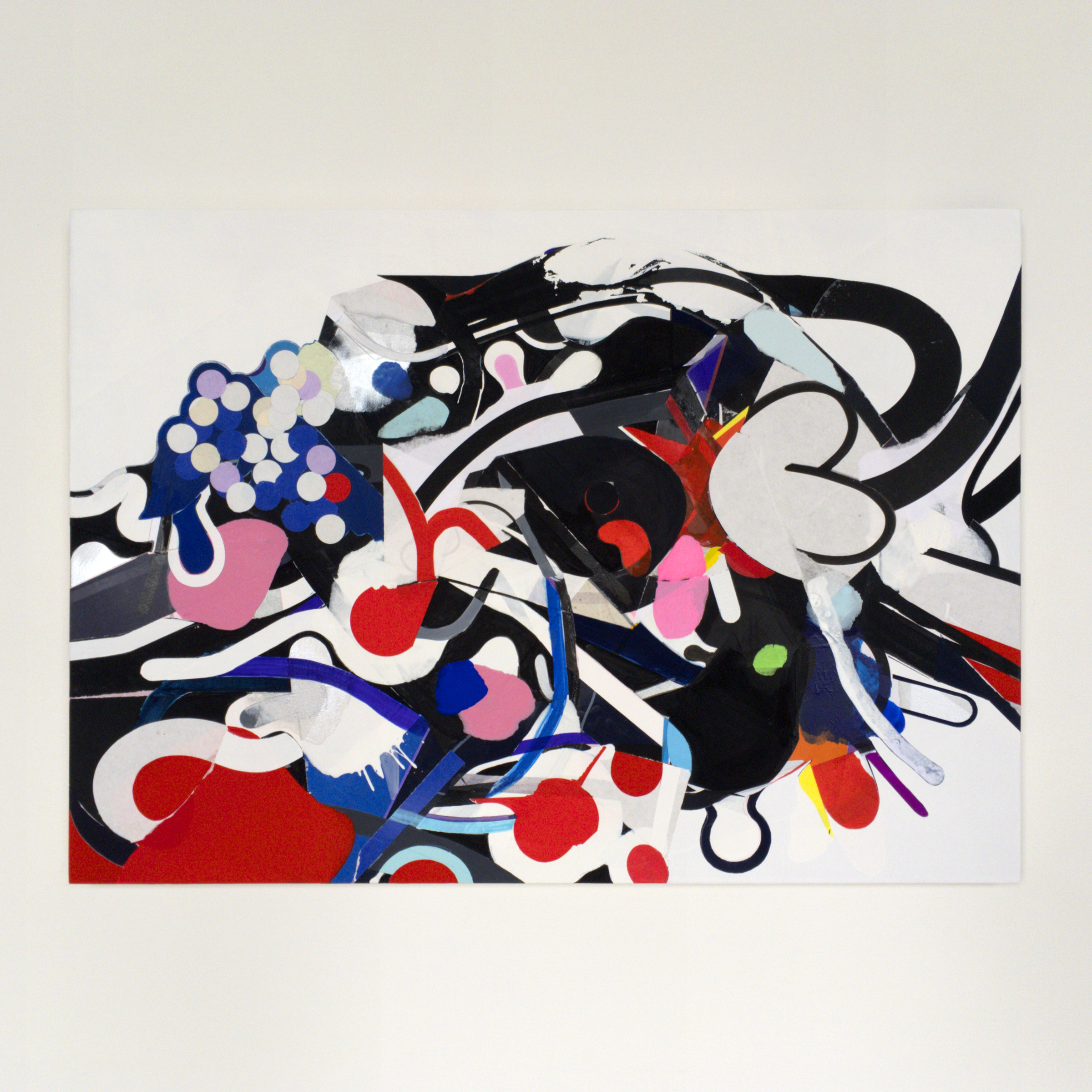 アクリル絵具、マーカー、紙と印刷された紙のコラージュで制作された作品です。