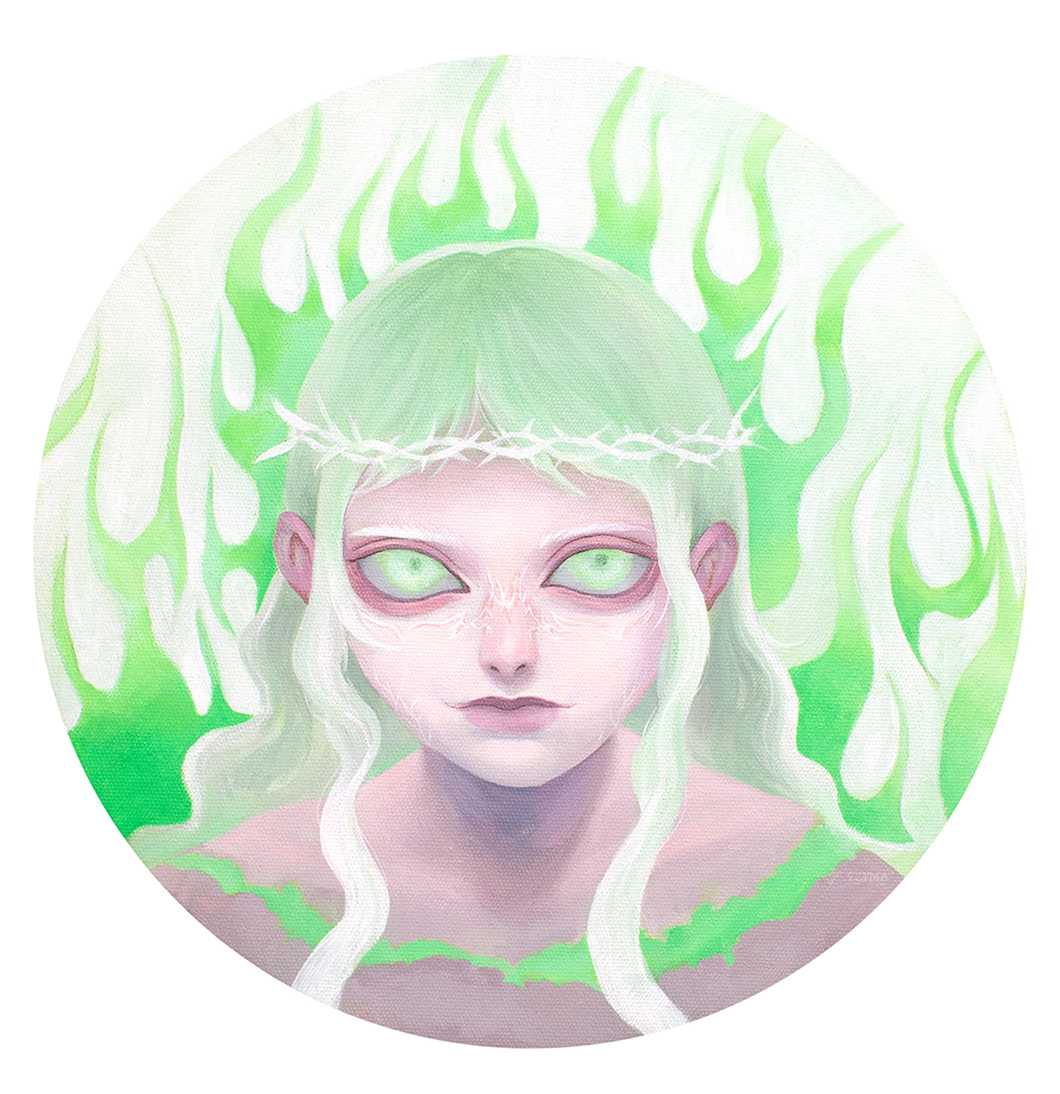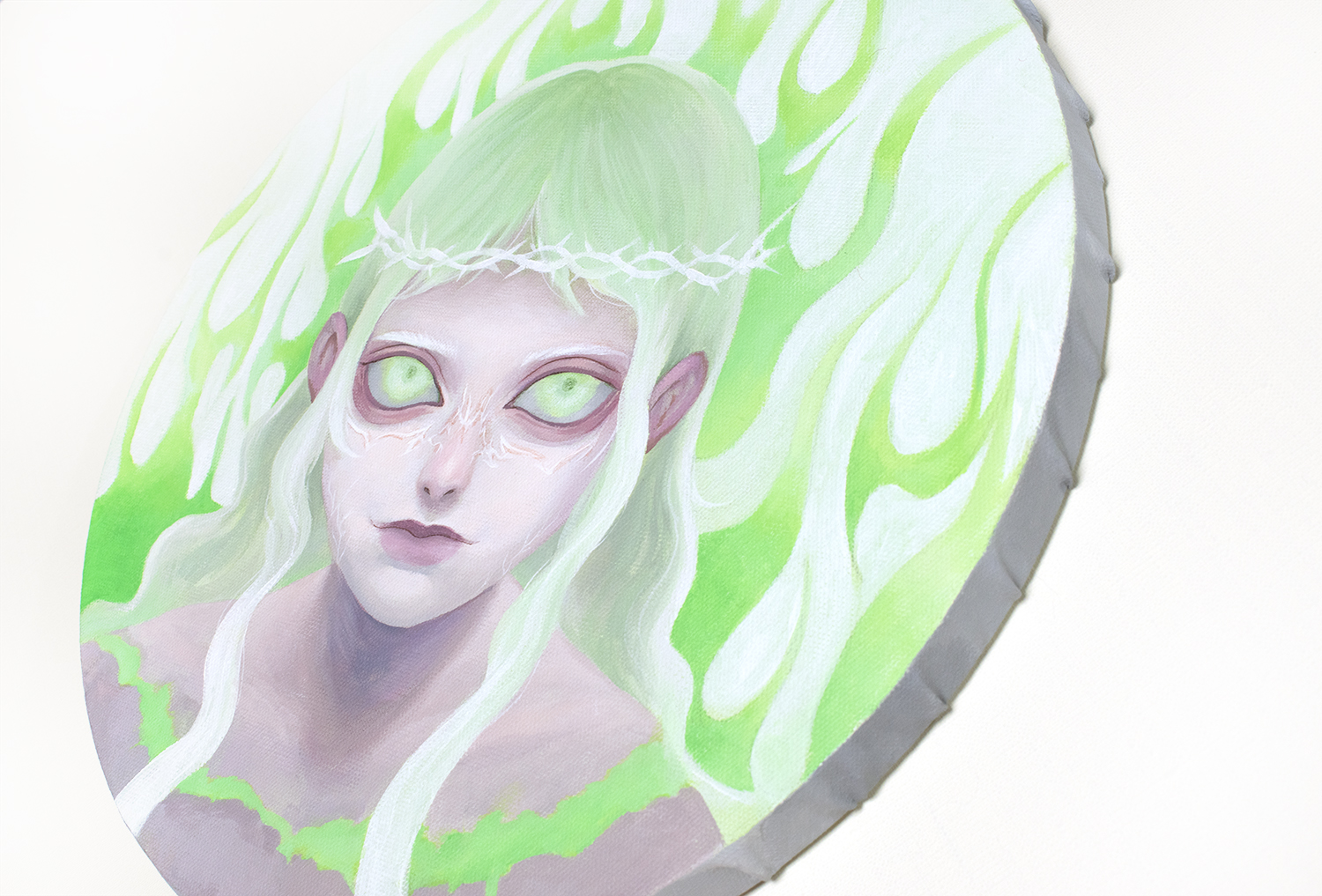 モンスターを比喩するグリーンの配色に、ファイヤーパターンの装飾など、現代におけるキリストの偶像崇拝信仰のアイコンを制作した。