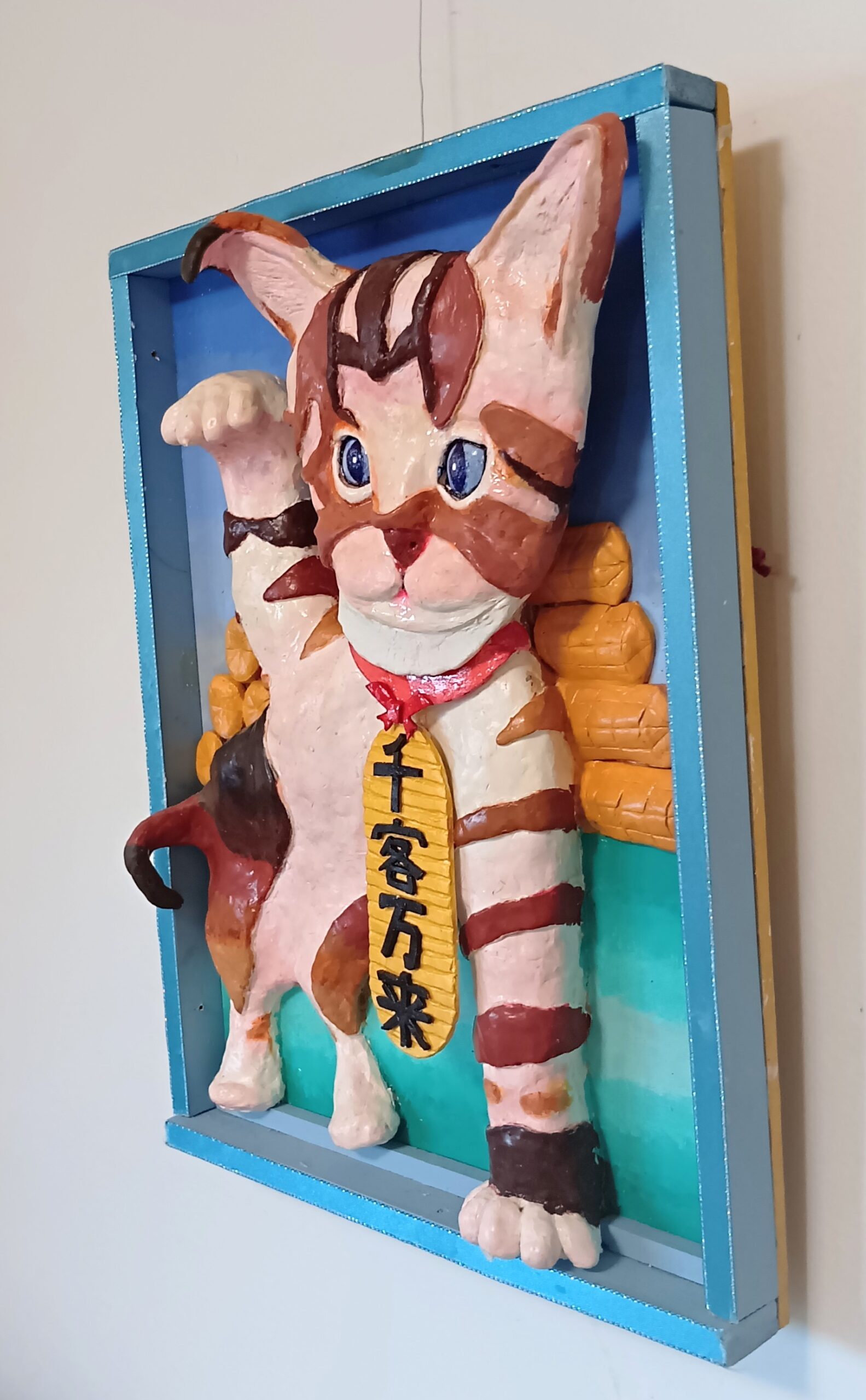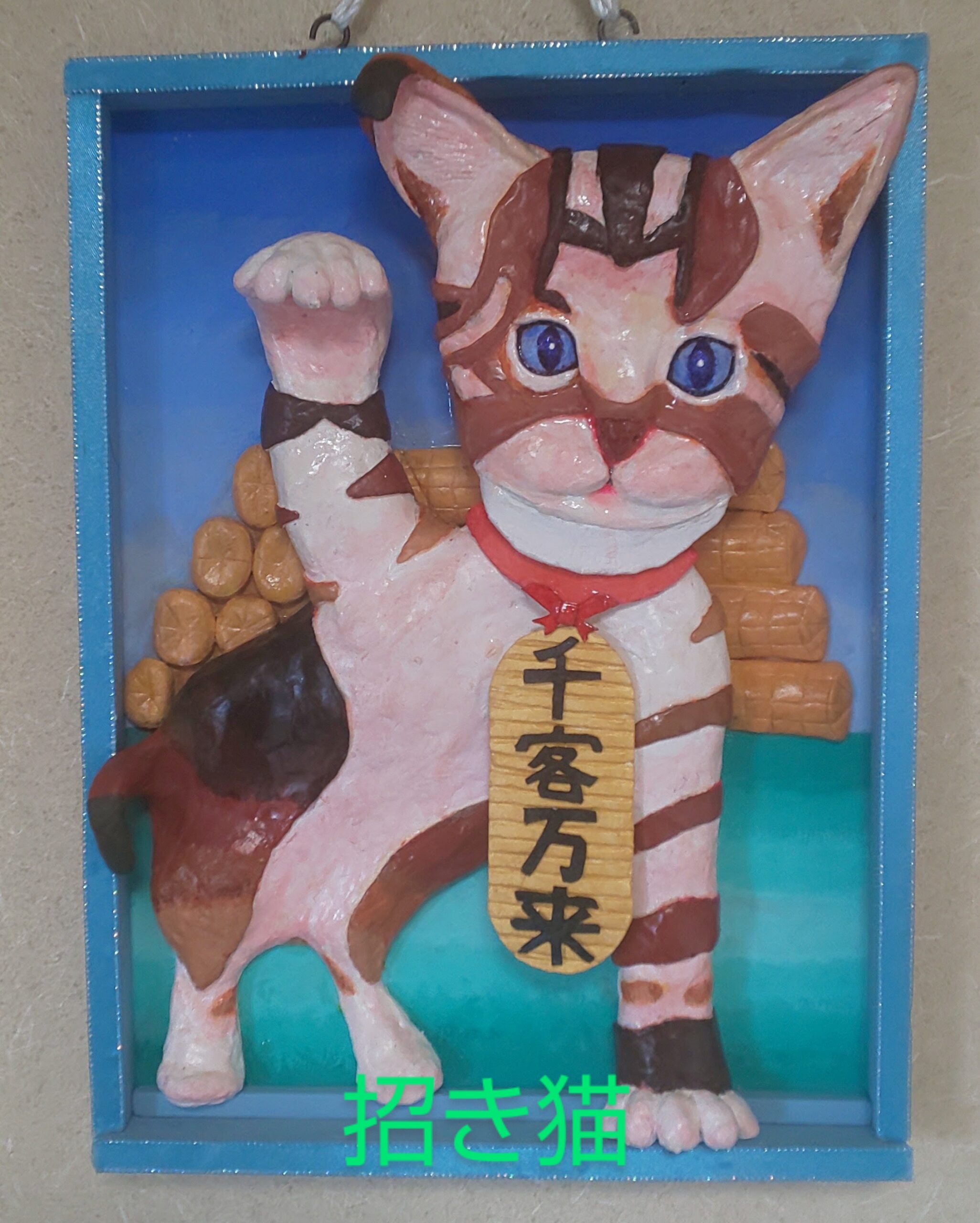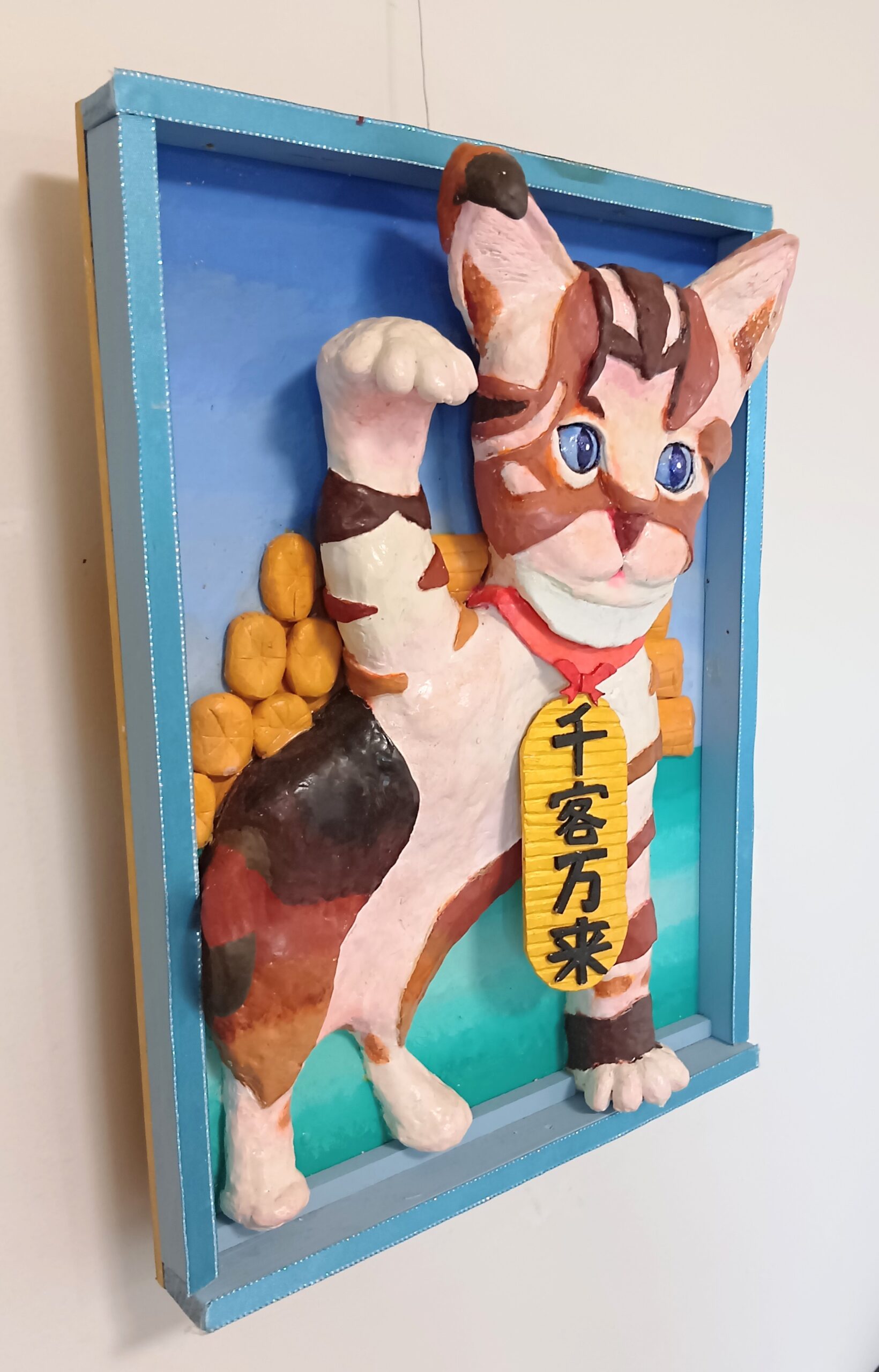 作品は、招き猫を壁掛け用の立体絵画にした「千客万来の招き猫」。