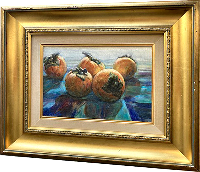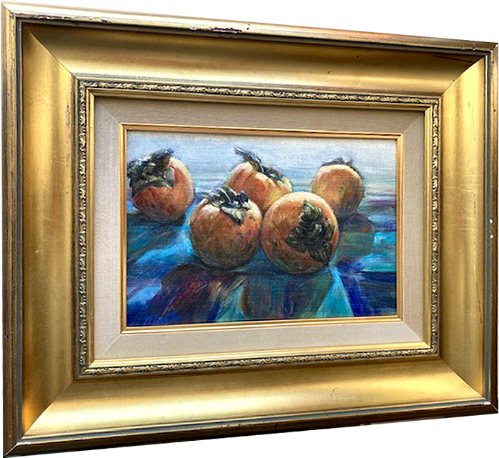 季節感のある作品を考え秋の記憶として柿を描きました。美味しい柿もさほど食べずに季節を過ごしてしまうので絵に留めておきました。鮮やかで艶のあるオレンジ色に青味の床を合わせて綺麗な色彩と思います。逆光の演出と油絵具と筆致を活かした表現でモチーフがしっかり描かれた作品です。秋に入れ替えて飾って頂いても良いかと思います。壁掛けフックをつけていますのでこのまま飾って頂けます。