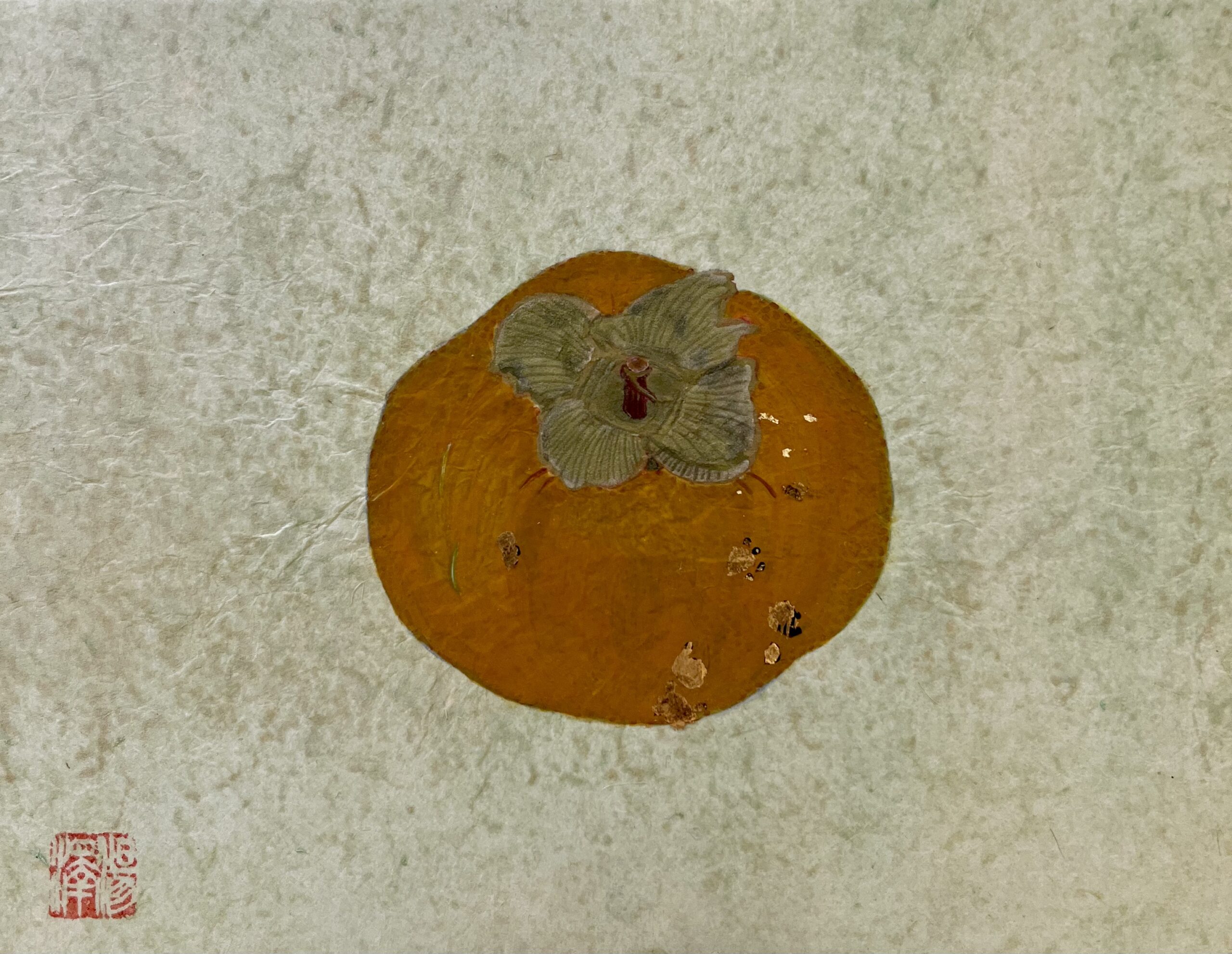 近所から貰った柿を描きました。市販とはまた違い所々傷んだ部分もあり洋金箔で表現しました。
