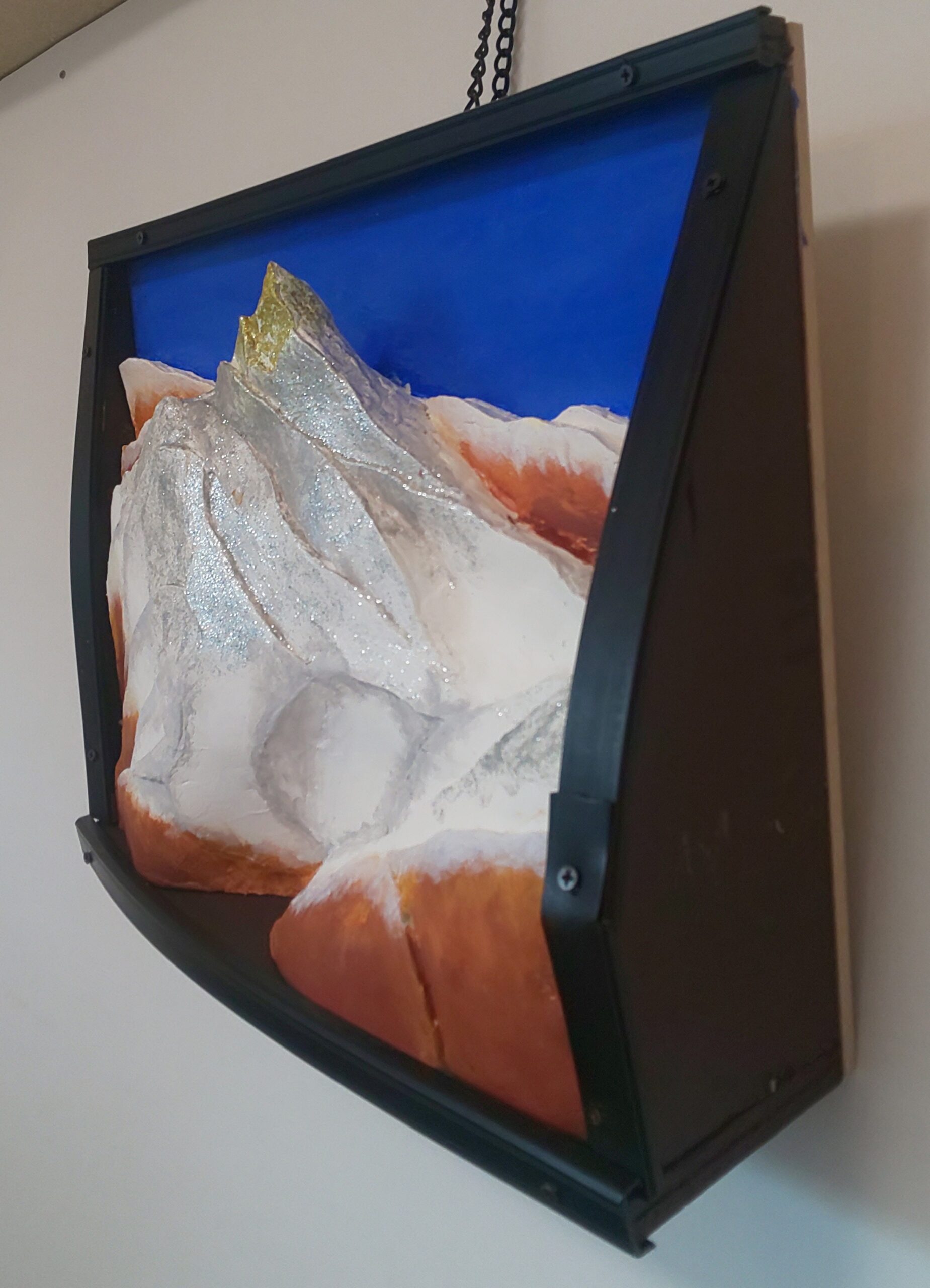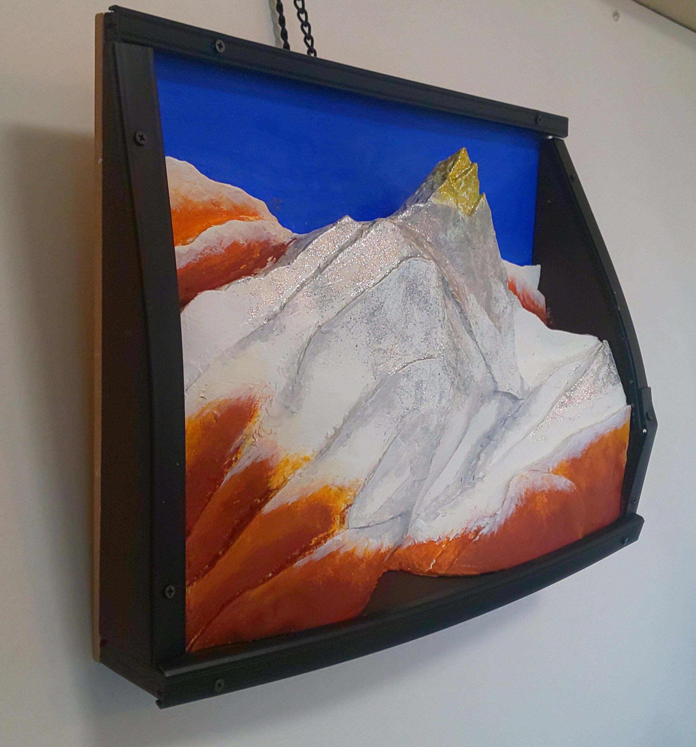 作品は、雪で覆われた立川連峰の、金銀に輝く「冬の槍ヶ岳」の立体絵画。
