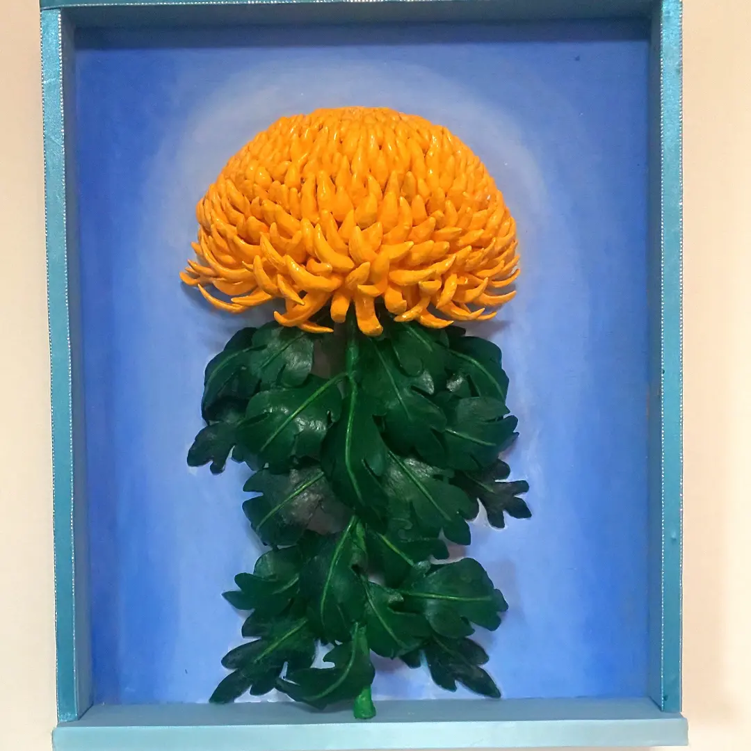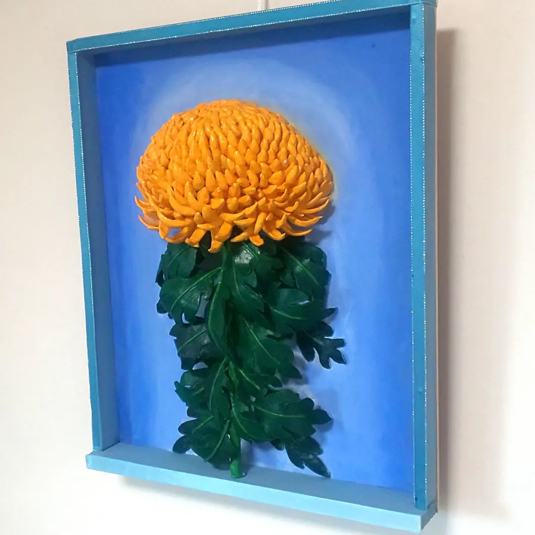 作品は鑑賞菊を、壁掛け用の立体絵画にした「壁掛け縁起の一輪の菊」。