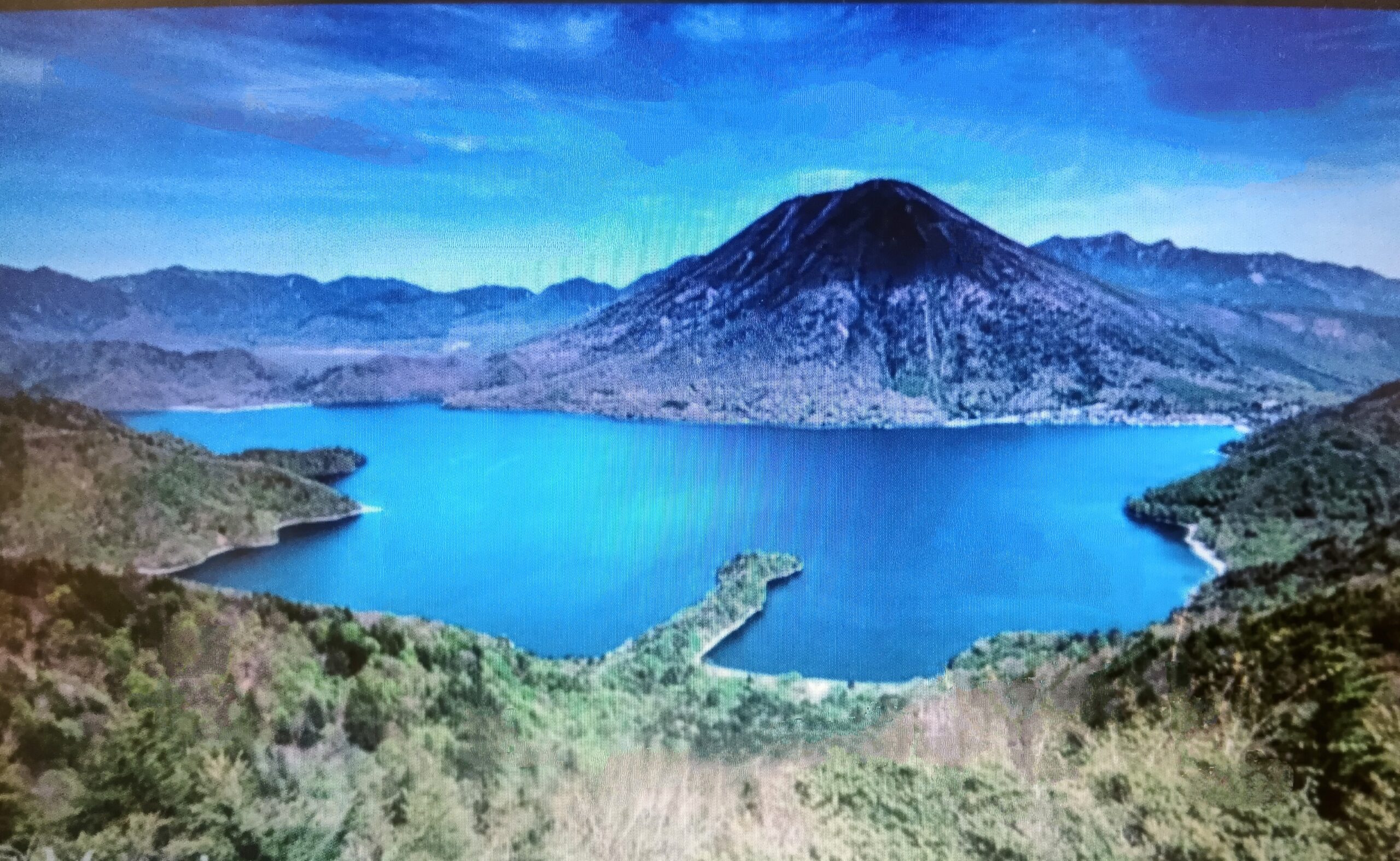 作品は、中禅寺湖の北岸と南岸に望む「男体山と八丁出島」立体絵画。