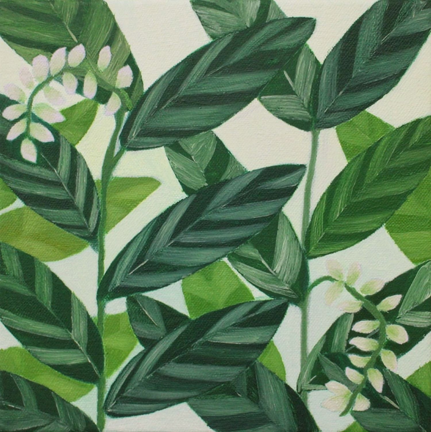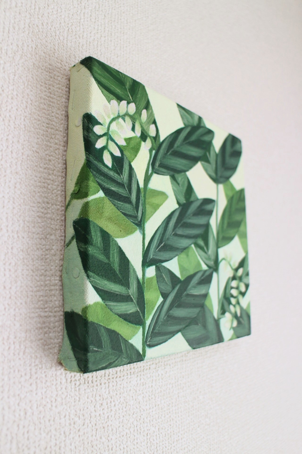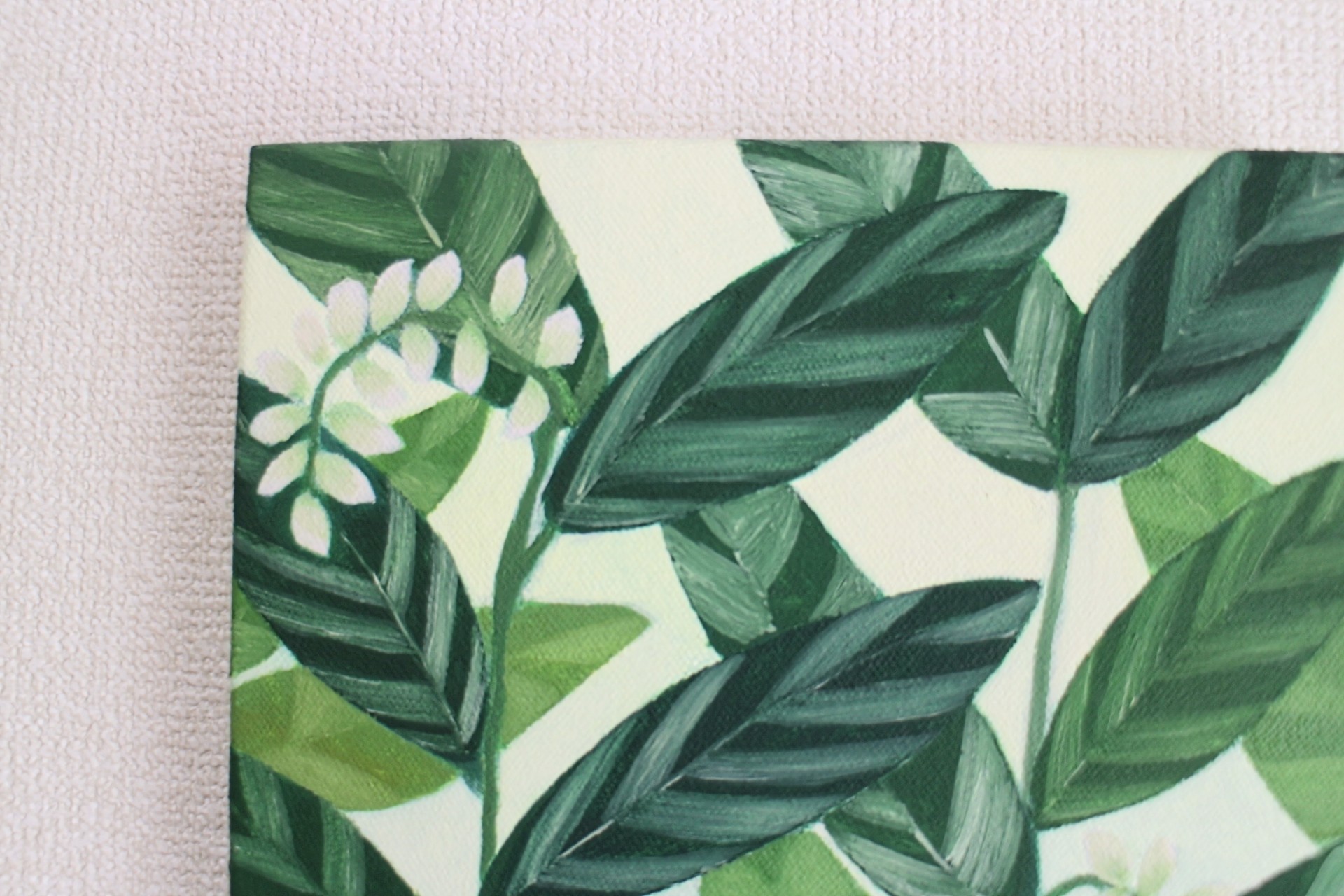 植物の幾何学模様がもつ凛とした整然さと、夏の強い光に当たる緑と大きい葉が美しく魅力的で制作しました。
