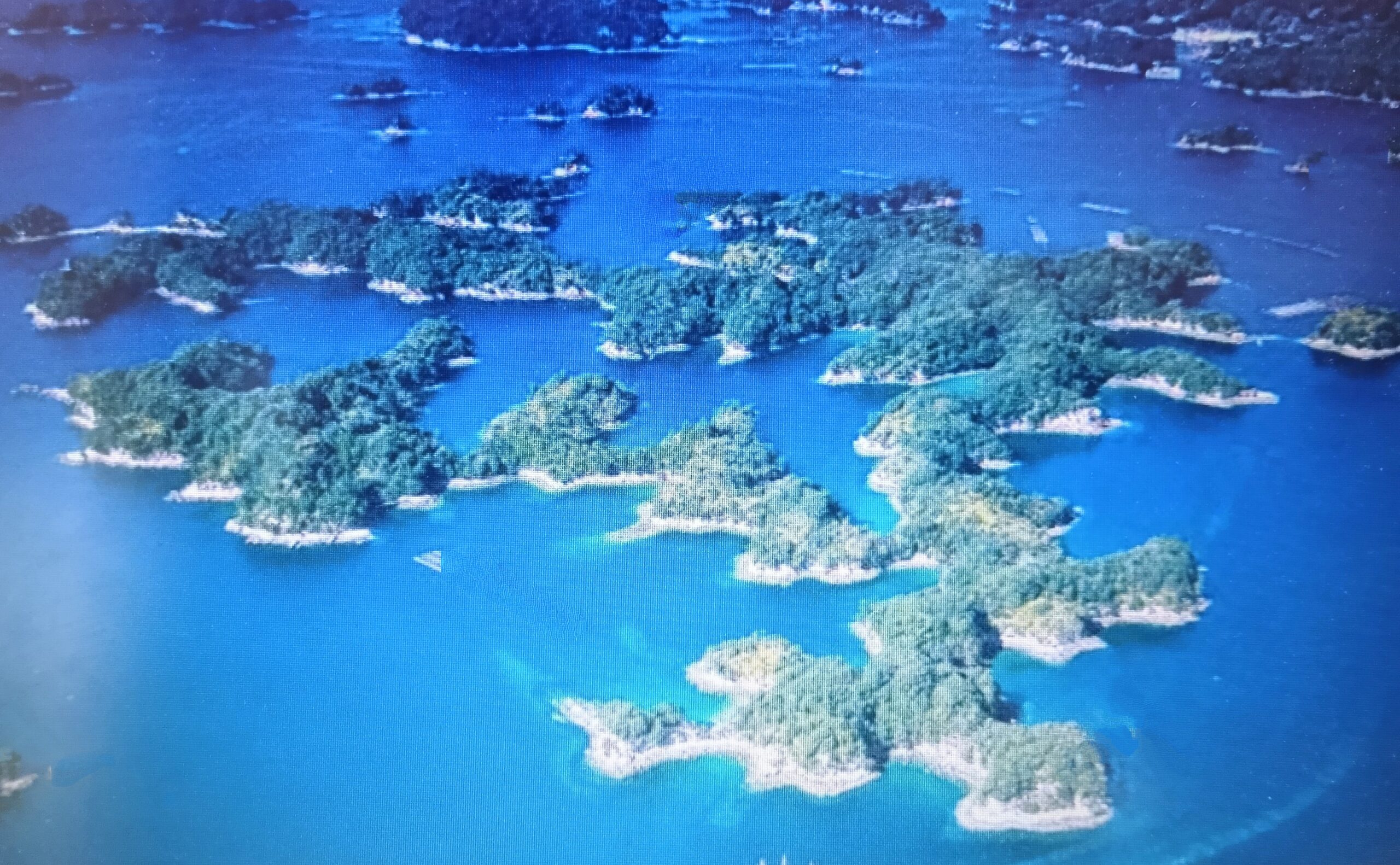 作品は、斜め上空から見る松浦島の景色で、リアス式海岸の地形と入り江が織りなす美しい自然景観が広がっています。