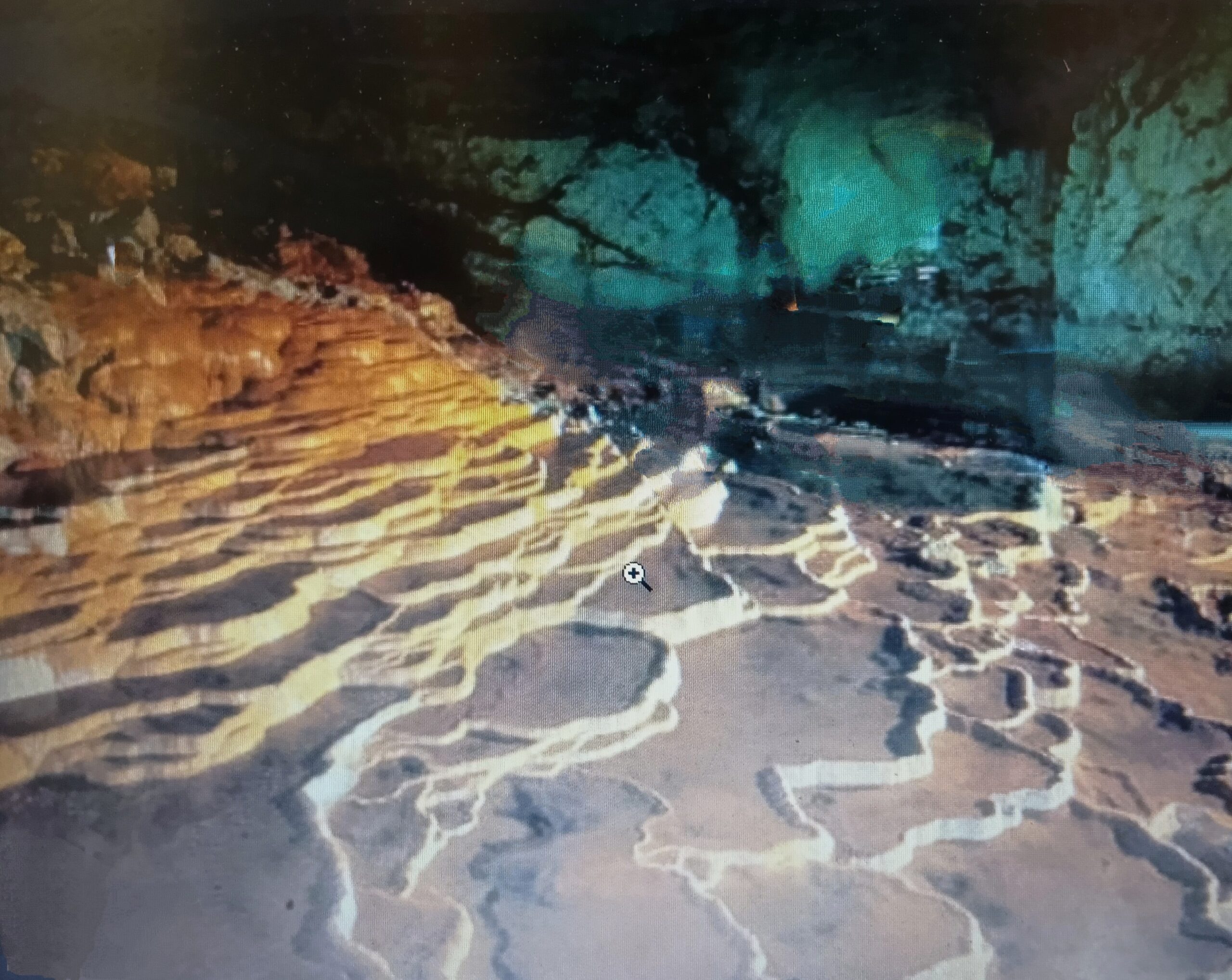 作品は、山口県のカラスト地形で有名な「秋芳洞百枚皿のライトアップ」の立体絵画。