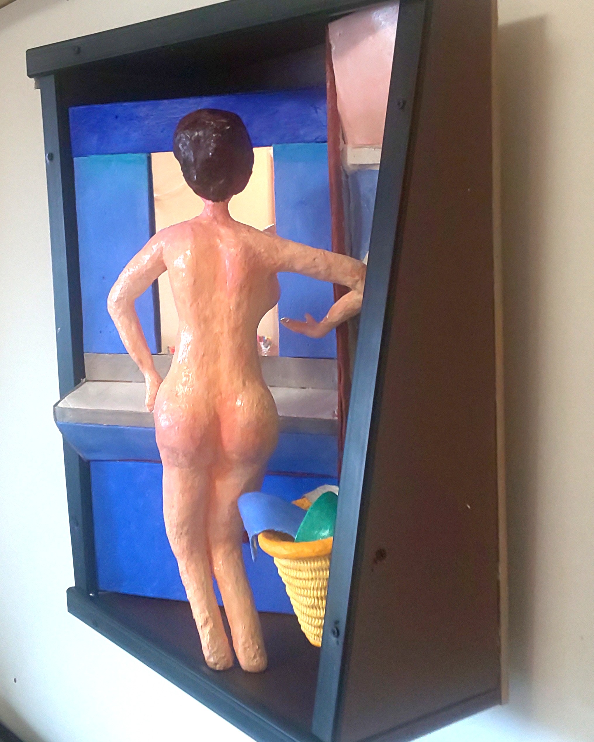 作品は、婦人が洗面所で後ろ向きに脱衣してますが「鏡に前姿が映る、入浴したく」の立体絵画。