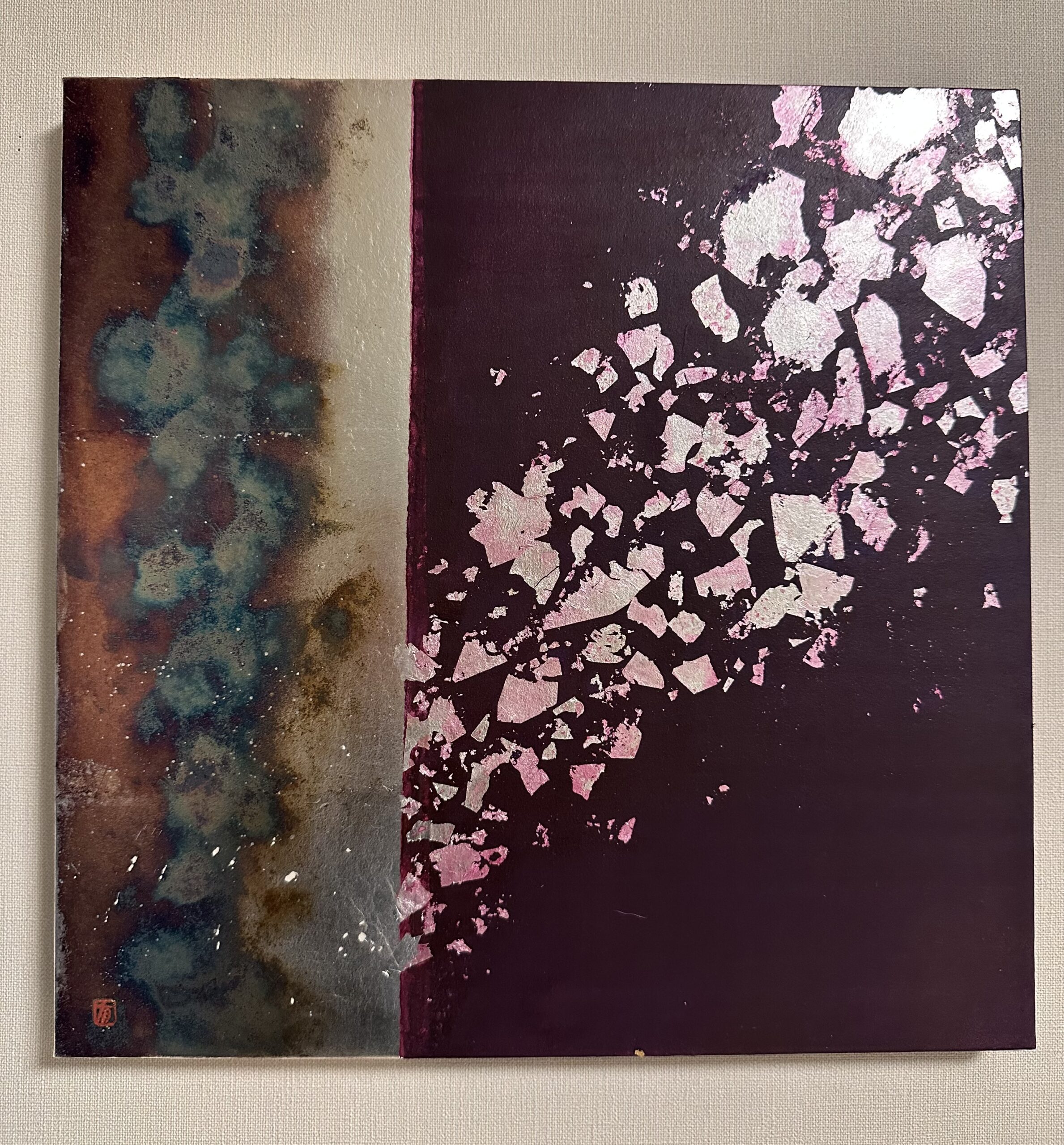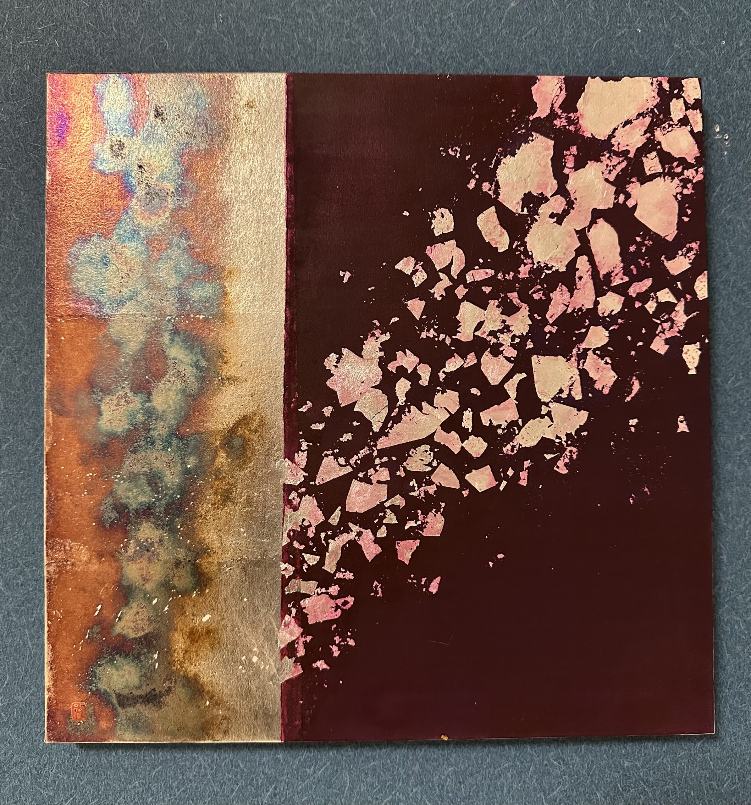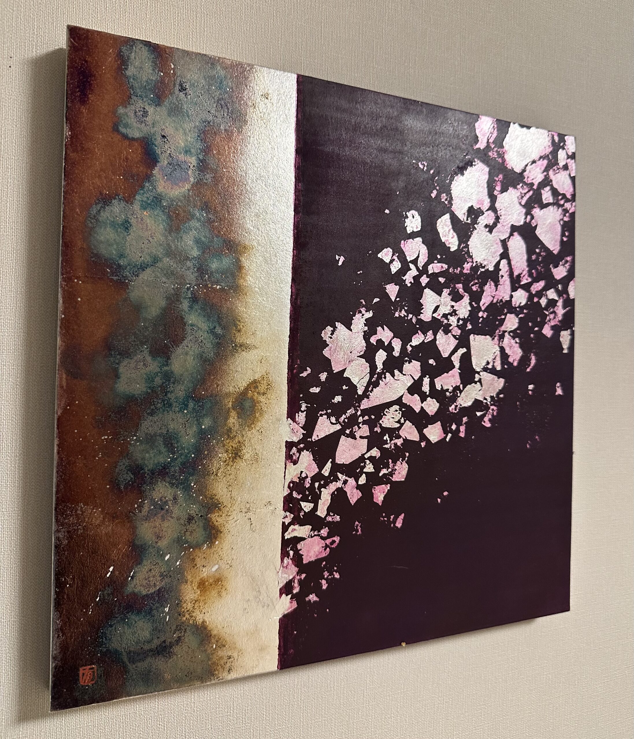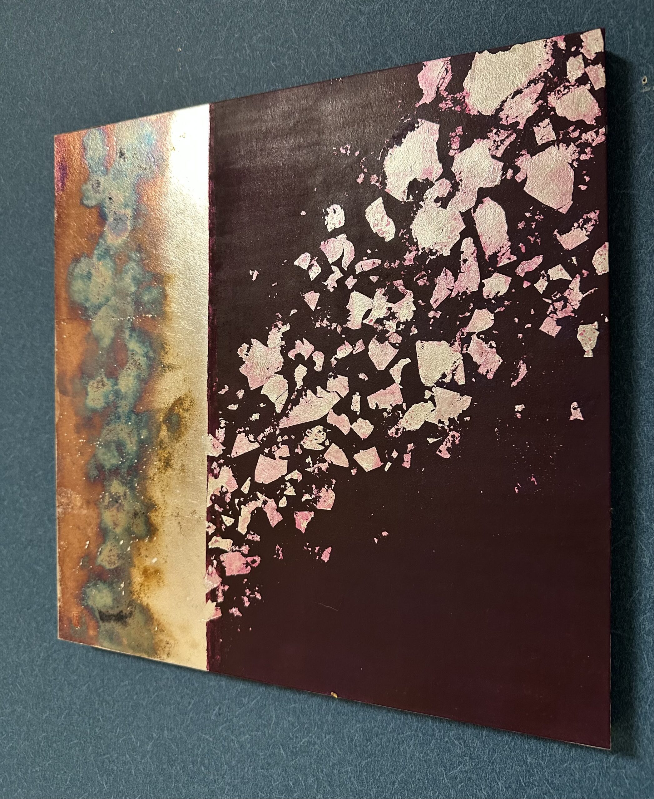 箔を使用した作品は、光のあたり方によって輝き方が変わります。日中の窓から入る自然光、夜の照明の光など、光の違いにより表情がかなり変わります。また、箔の変色を抑えるためのコーティングをしておりますが、時間経過とともに少しずつ色味が変化します。その変化もお楽しみいただけますと幸いです。