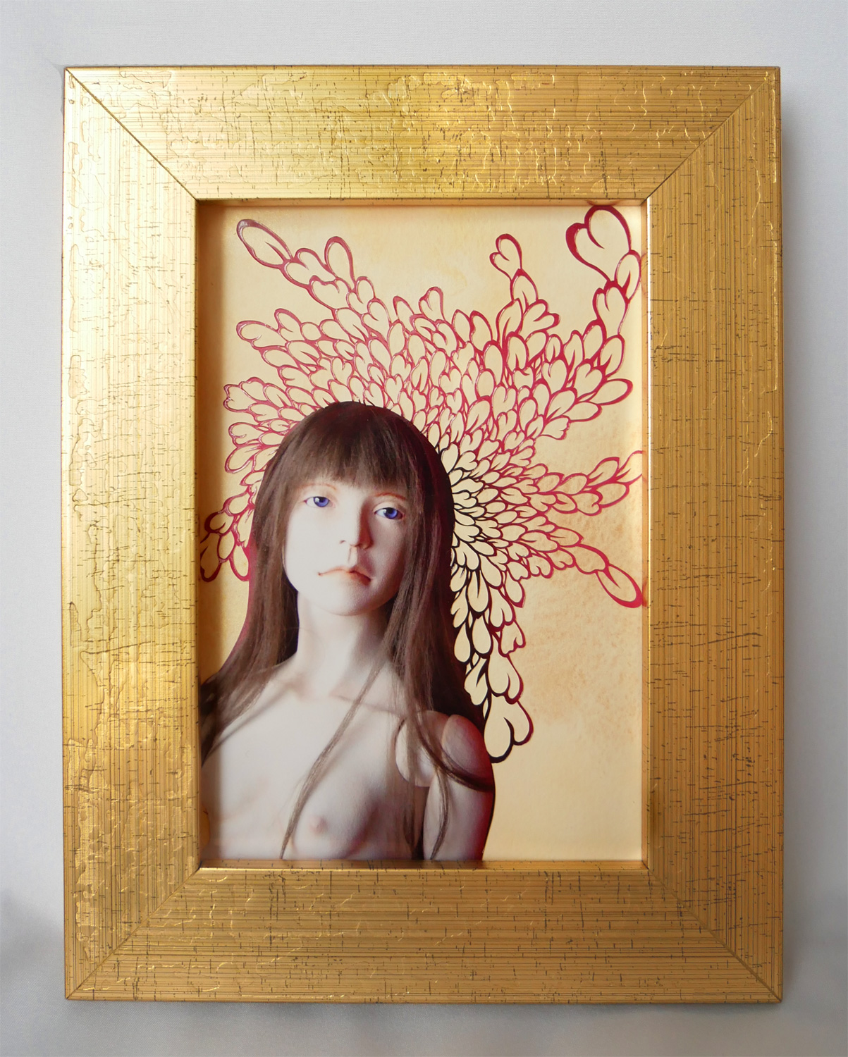自作の球体関節人形を自ら撮影し、プリントした写真を切り絵の素材としました。