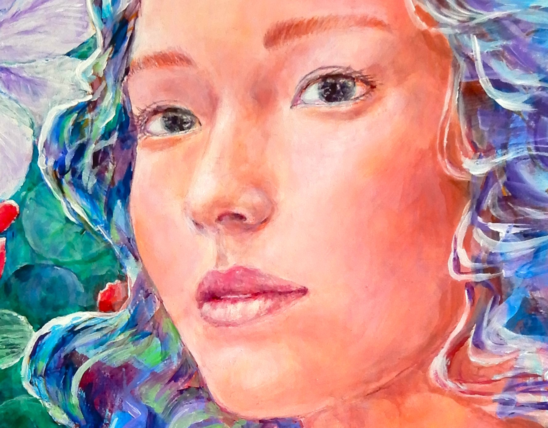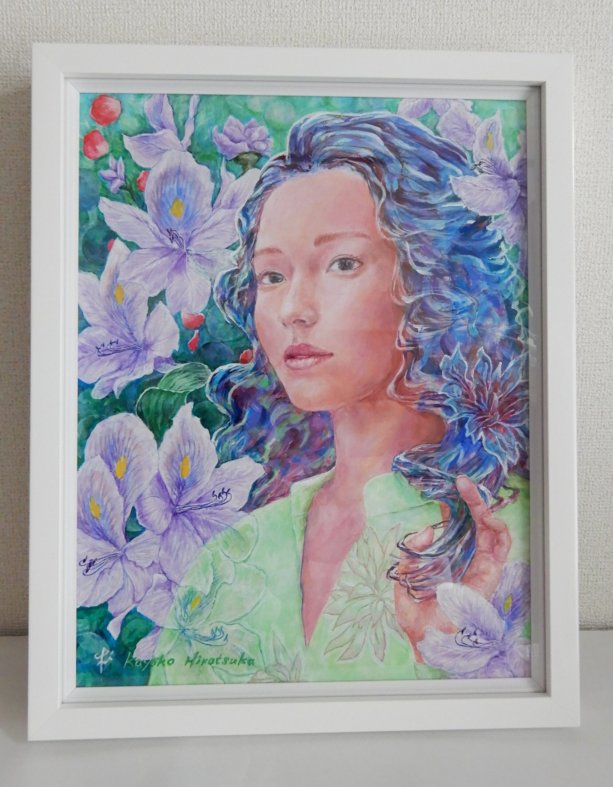 この花は、水草のホテイアオイの花です。こんなにきれいな花が咲くなんて、ちょっと想像できませんでした。1本の茎に複数の花が四方八方に咲いて、品があるのにボリューム感もあります。髪の周りを白い線で囲う事によって花との境界線を作り、お互いの存在をはっきりさせました。主な色は淡いパープルと明るいミントグリーンの組み合わせで、赤いバラの花びらでアクセントをつけました。女性の目は優しい目で描きたいといつも思っています。 この作品は、外枠はバーチ材を使用し反りや湿度に強い強固なMDF板に描かれています。絵の明るい雰囲気を壊さないように白い額を選びました。壁用フック(2本針)ついています。