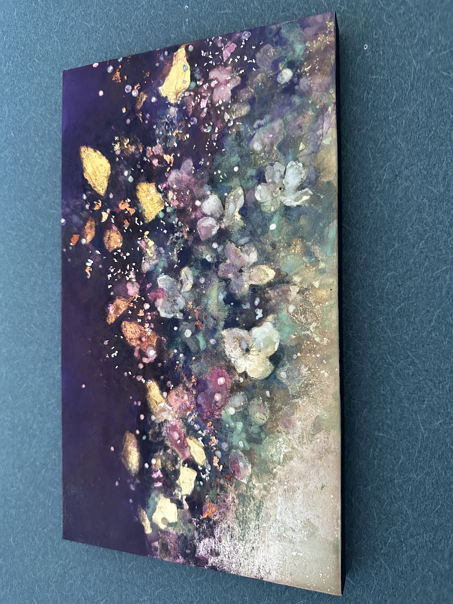 箔を使用した作品は、光のあたり方によって輝き方が変わります。日中の窓から入る自然光、夜の照明の光など、光の違いにより表情がかなり変わります。また、箔の変色を抑えるためのコーティングをしておりますが、時間経過とともに少しずつ色味が変化します。その変化もお楽しみいただけますと幸いです。