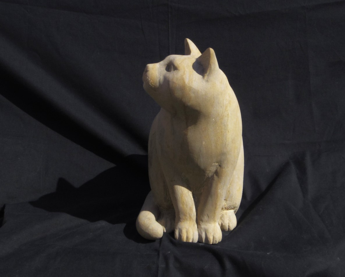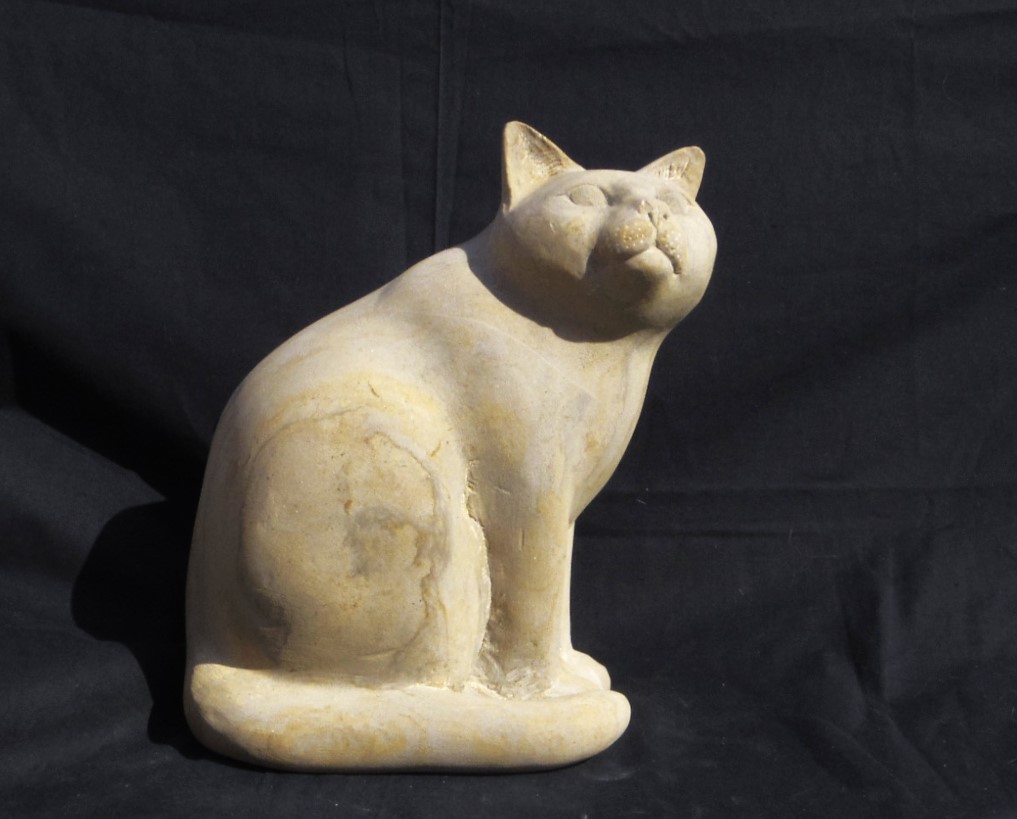 インド砂岩で作られた猫の彫刻。様々な表情を持つ猫、飼い主の顔を見あげて何かを訴えようとする姿が可愛らしくて作った作品です。玄関先やお部屋の床上に直接置かれると猫に話しかけられているような気持ちになるかもしれません。癒やしのひとときを感じて頂きたいです。