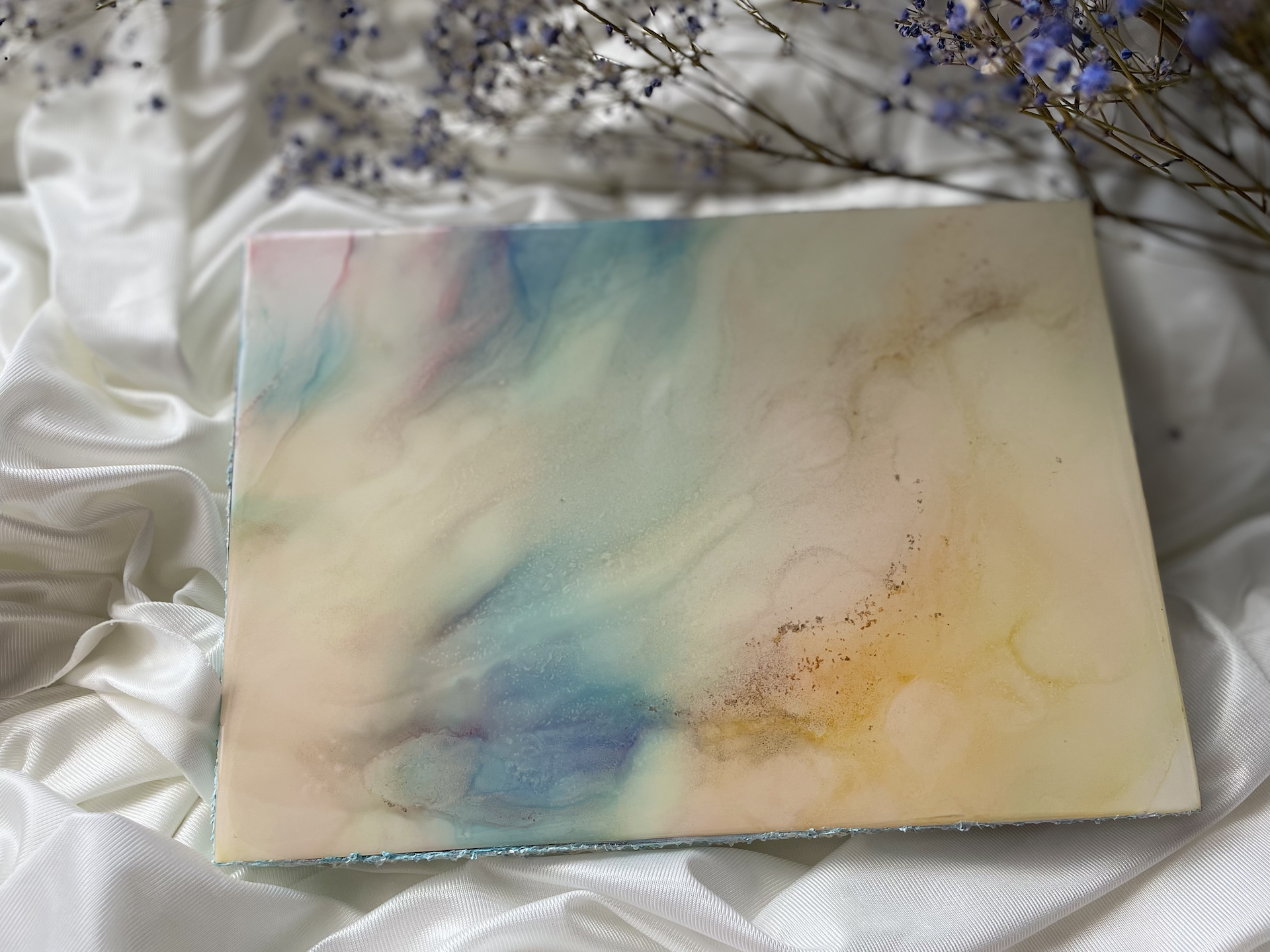 ペールオレンジと青みがかったパープルのカラーリングが淡く混ざり合う穏やかな作品です。