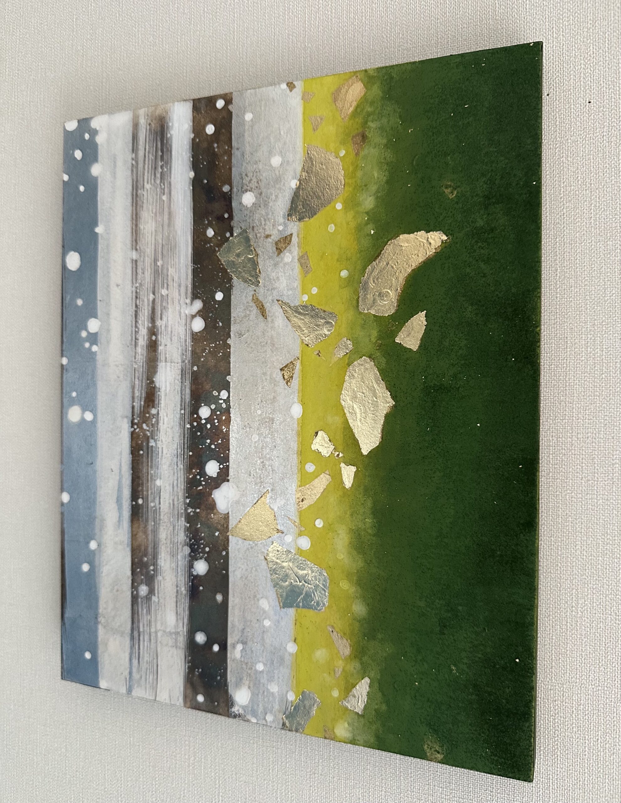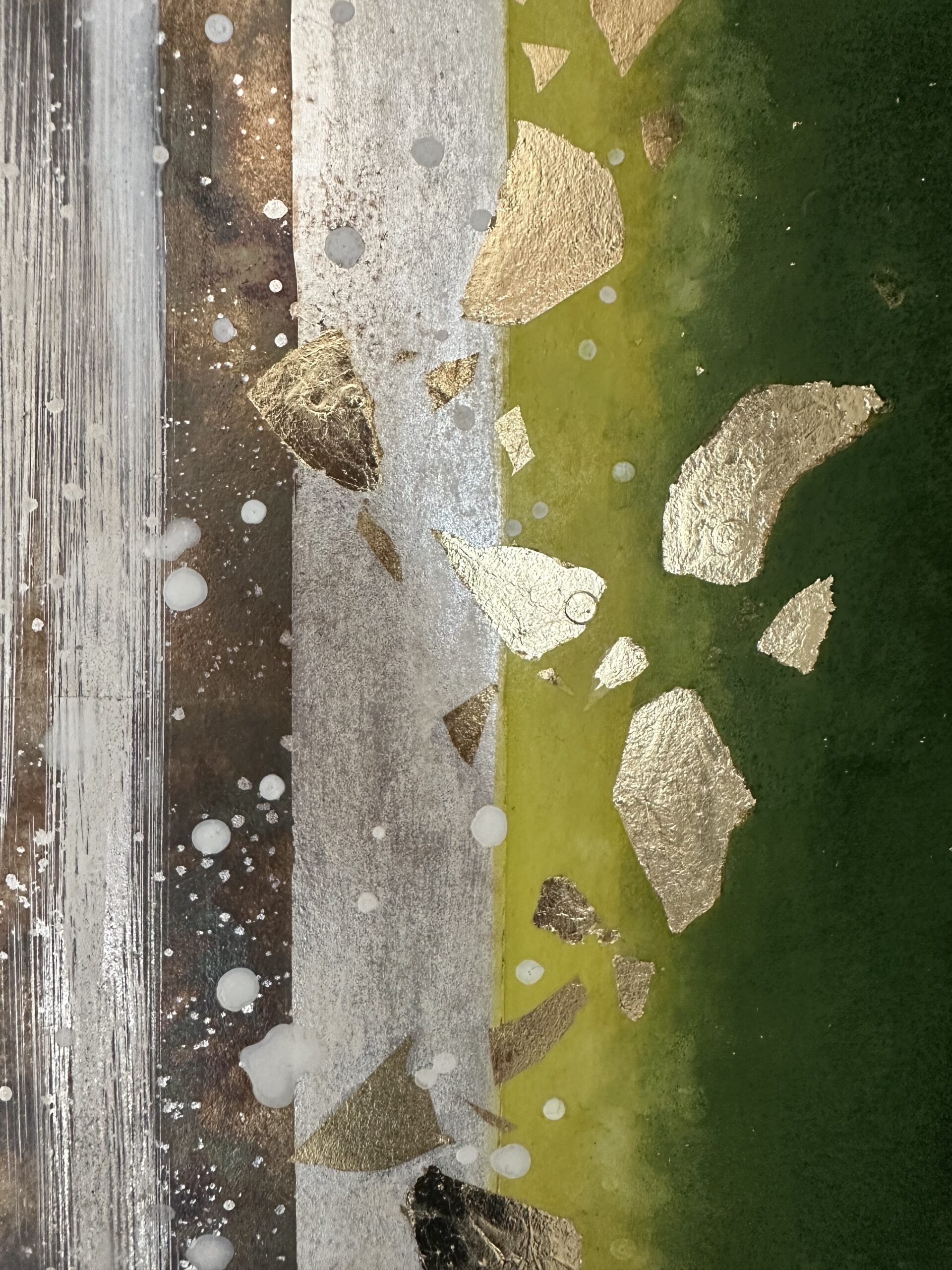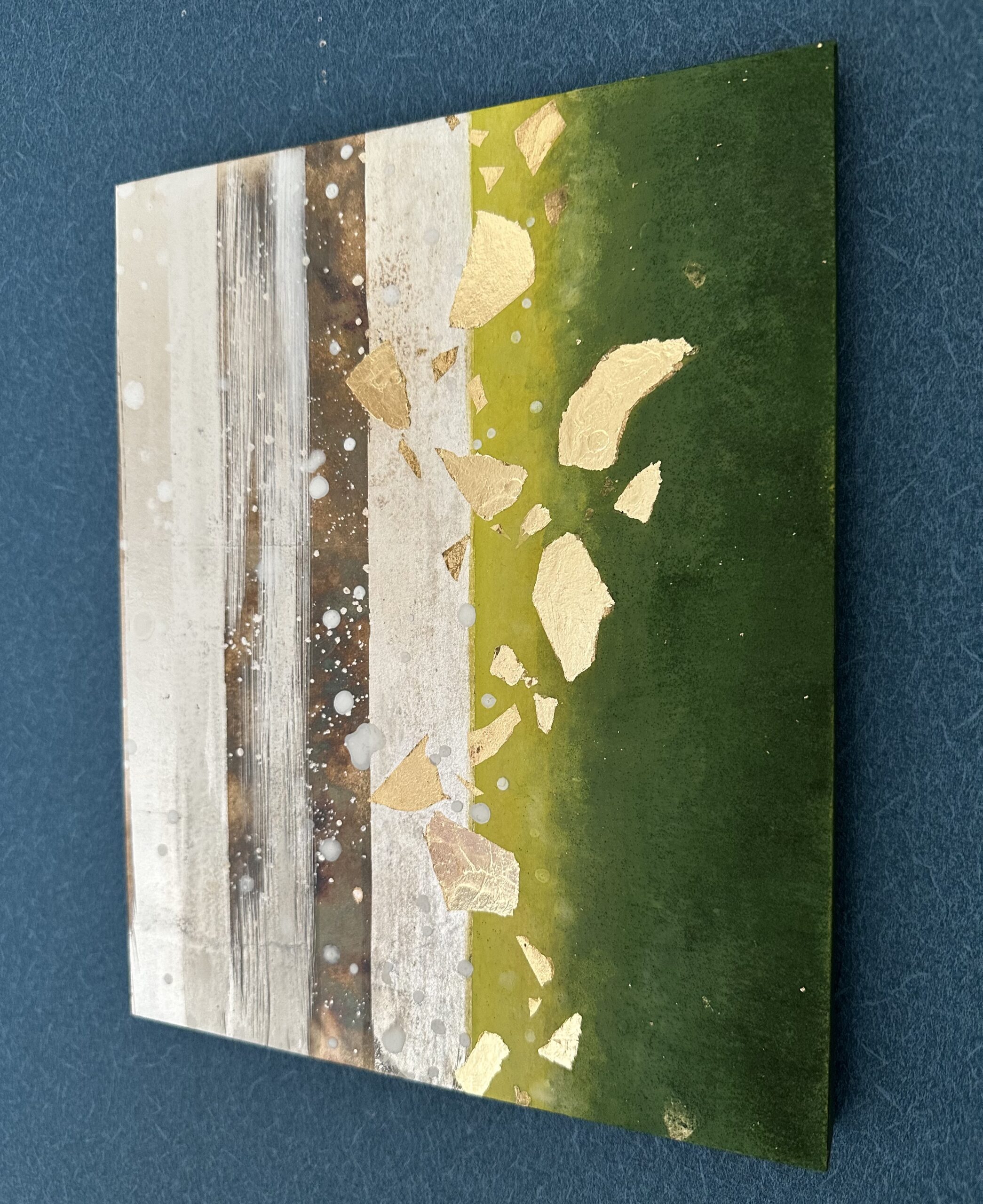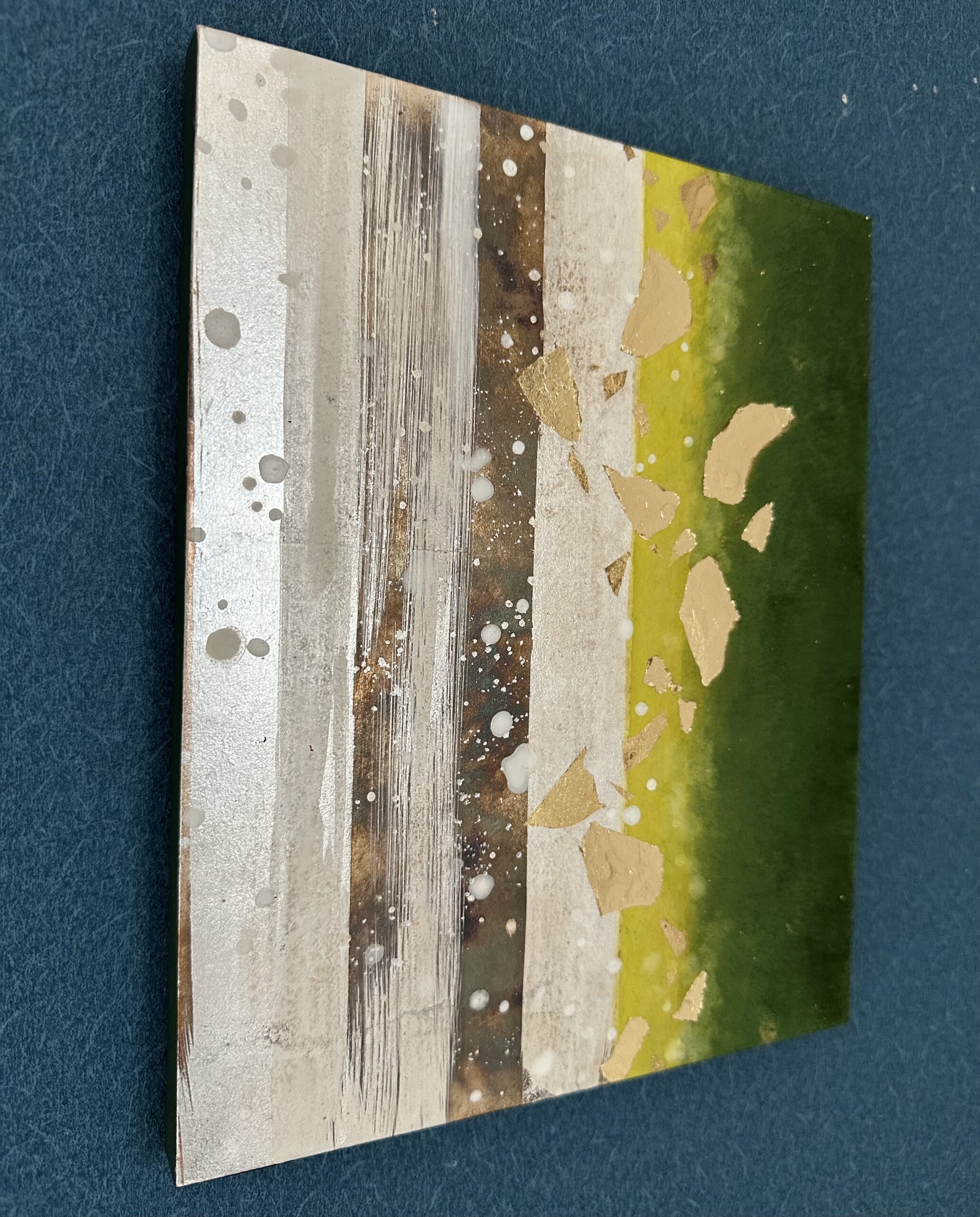 箔を使用した作品は、光のあたり方によって輝き方が変わります。日中の窓から入る自然光、夜の照明の光など、光の違いにより表情がかなり変わります。また、箔の変色を抑えるためのコーティングをしておりますが、時間経過とともに少しずつ色味が変化します。その変化もお楽しみいただけますと幸いです。