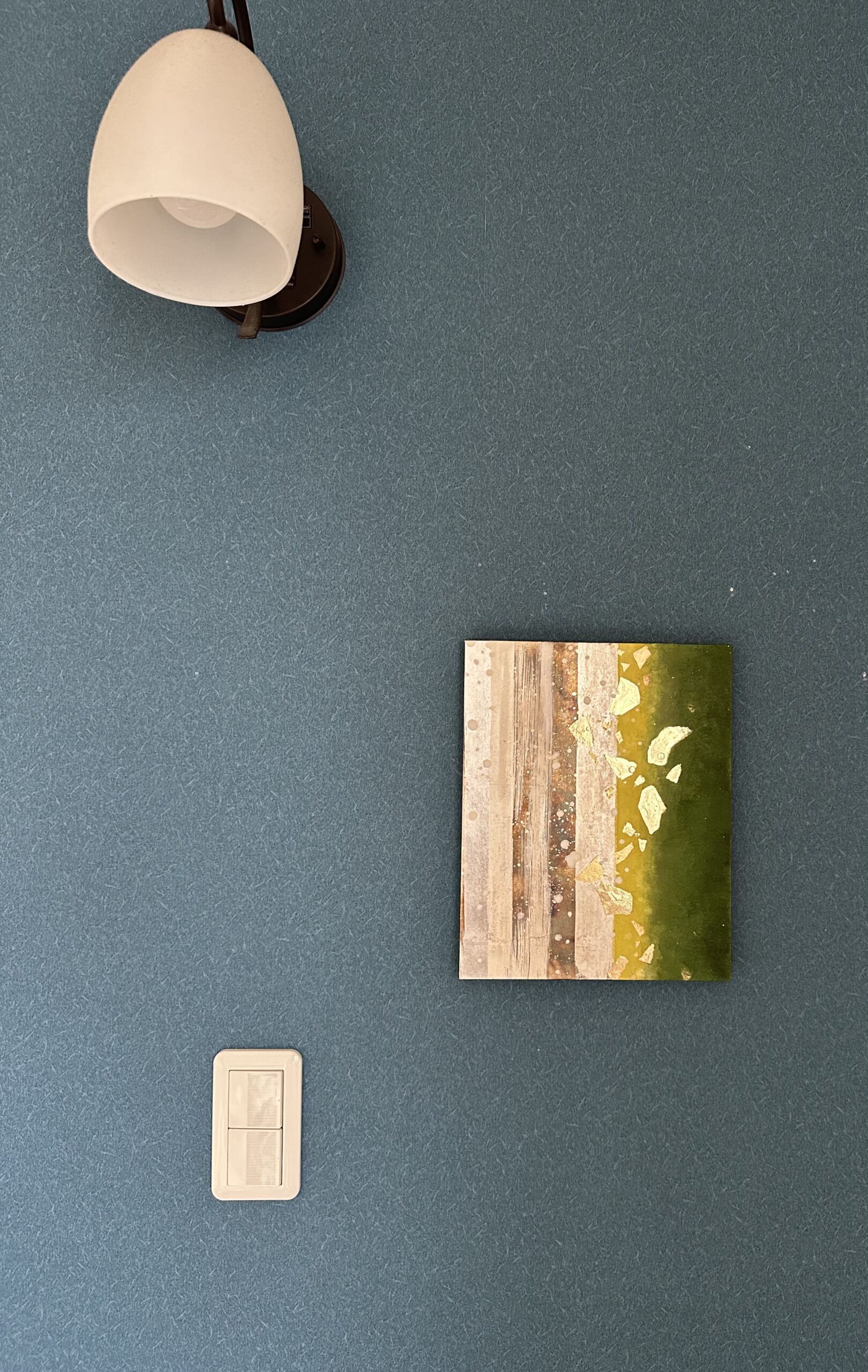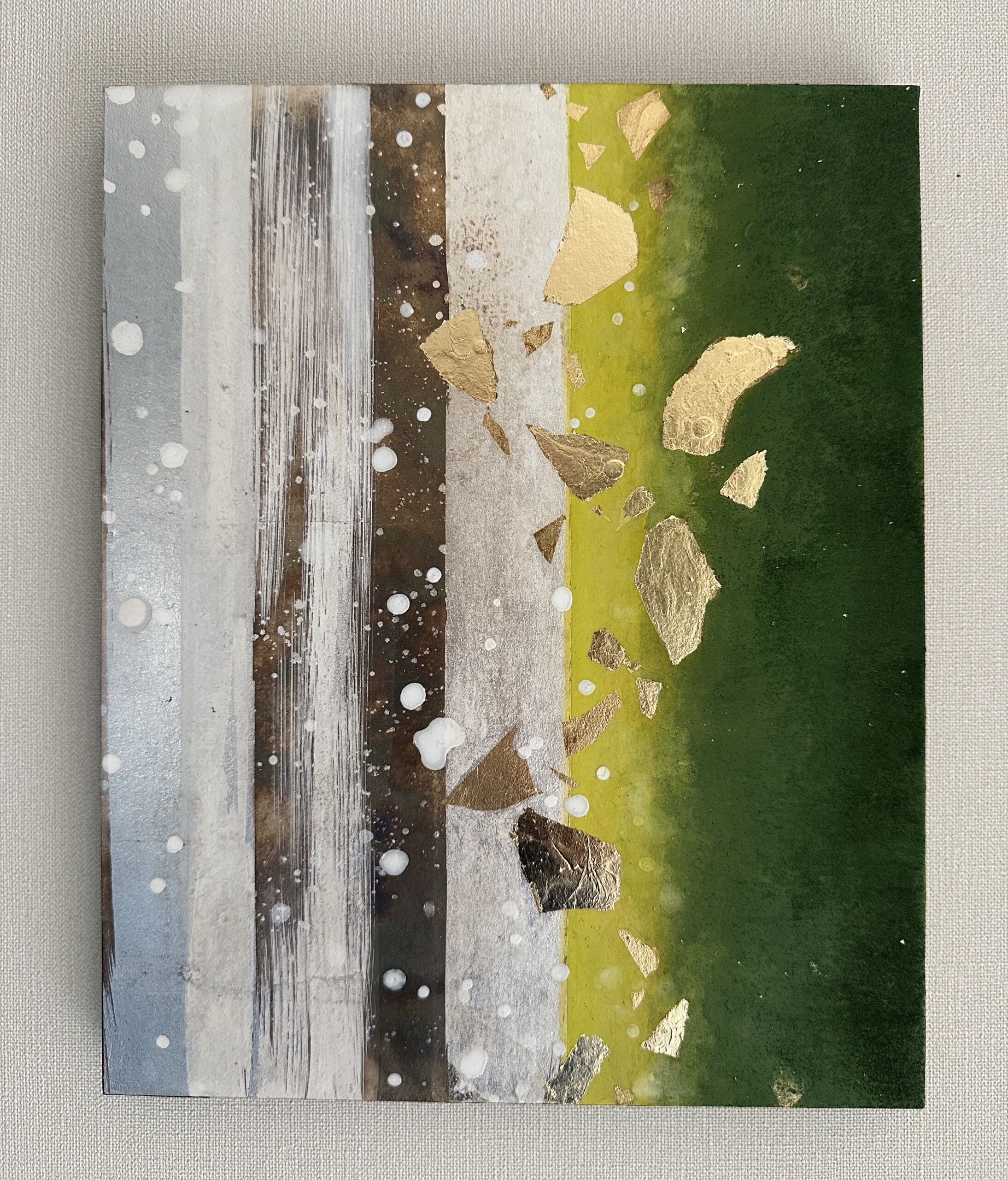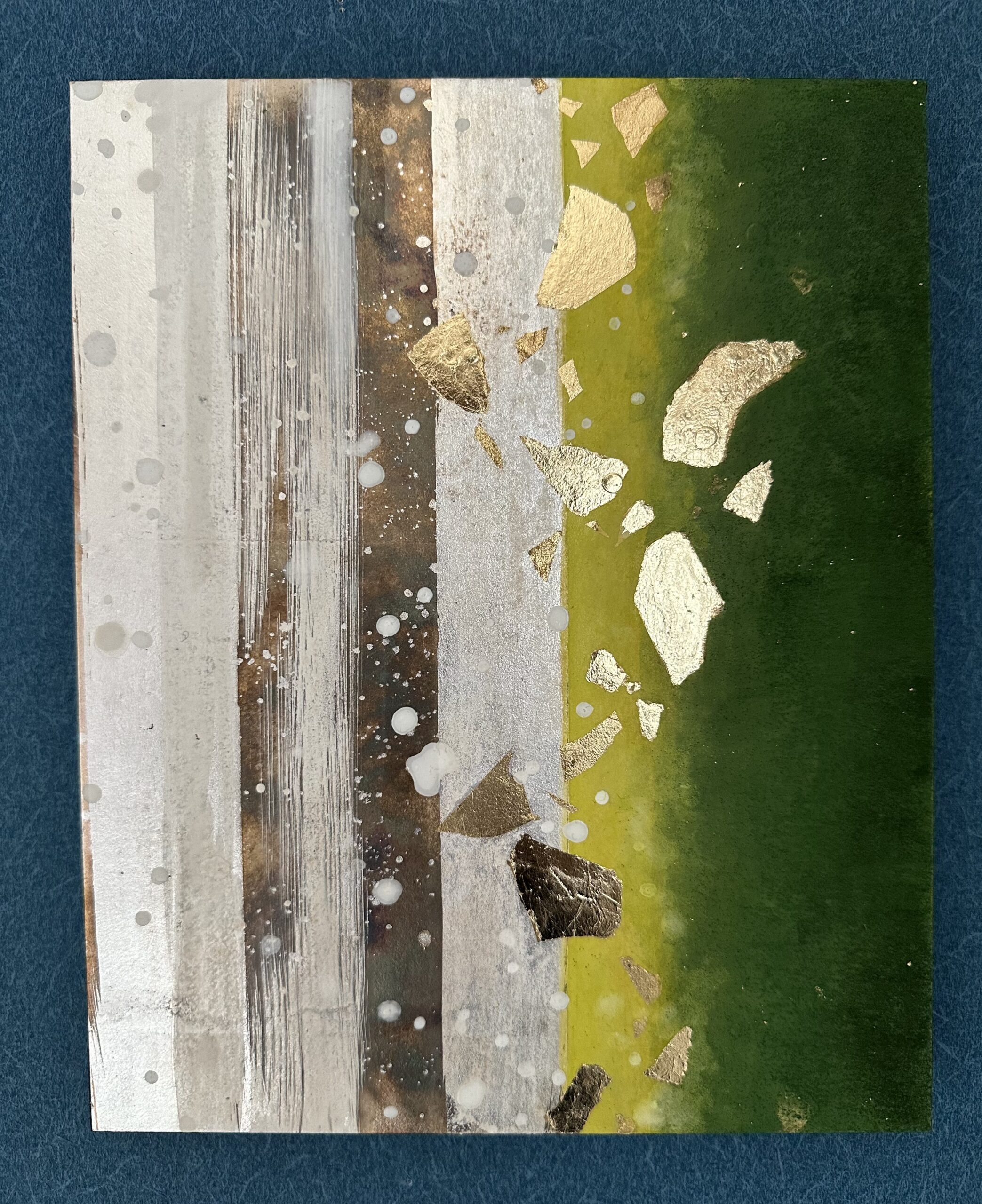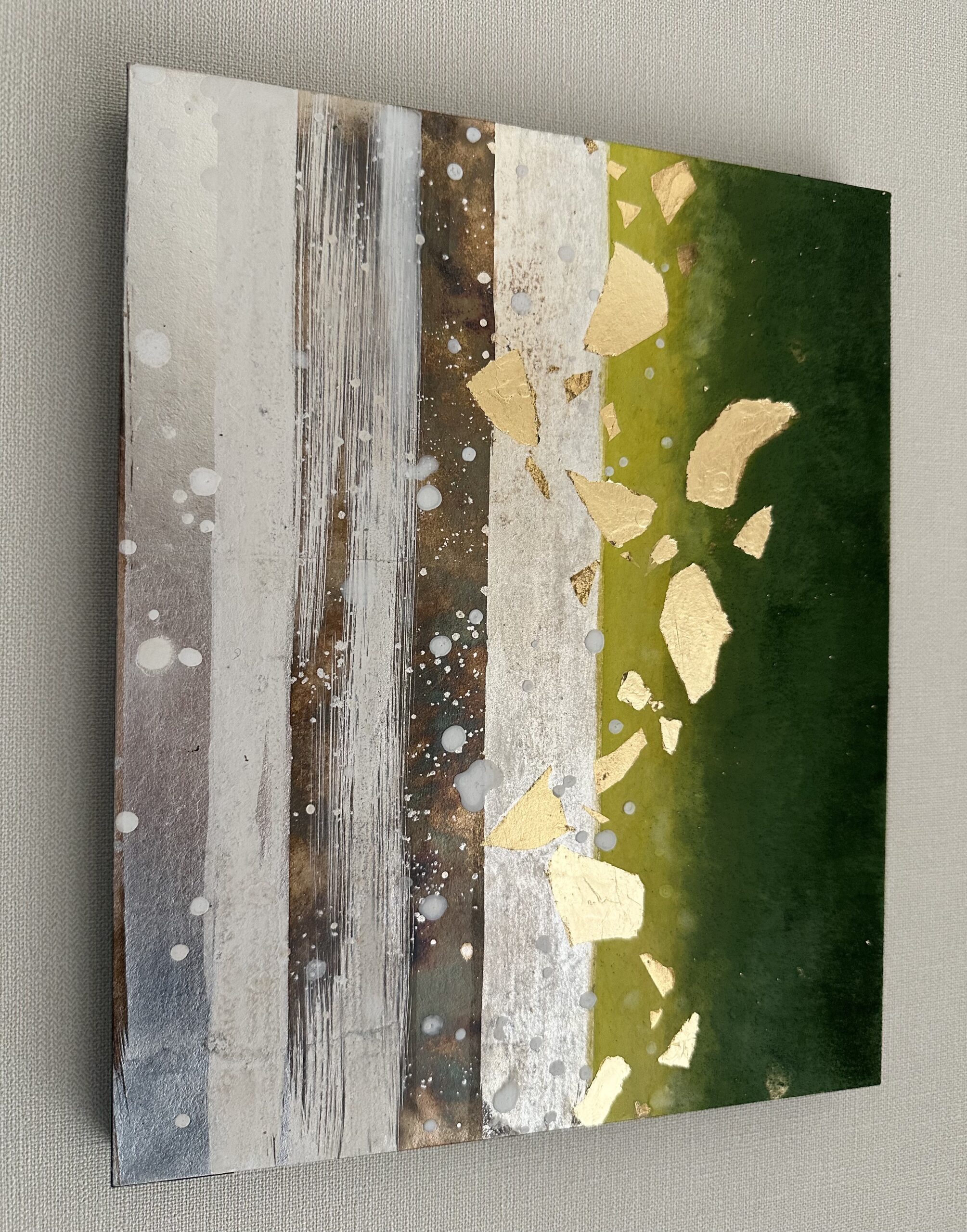 箔を使用した作品は、光のあたり方によって輝き方が変わります。日中の窓から入る自然光、夜の照明の光など、光の違いにより表情がかなり変わります。また、箔の変色を抑えるためのコーティングをしておりますが、時間経過とともに少しずつ色味が変化します。その変化もお楽しみいただけますと幸いです。