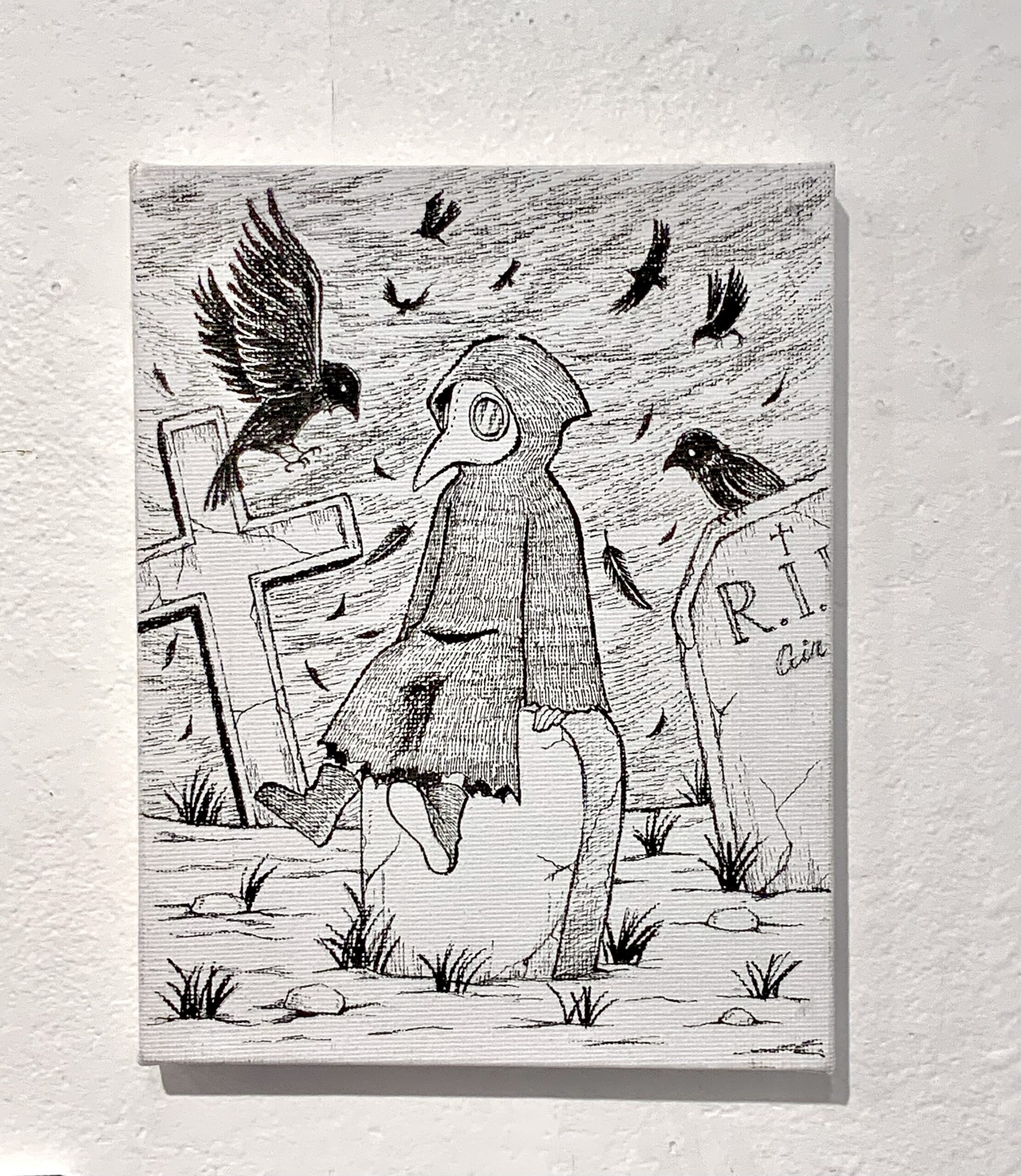 墓場で遊ぶペストマスクちゃんと友達のカラスたち