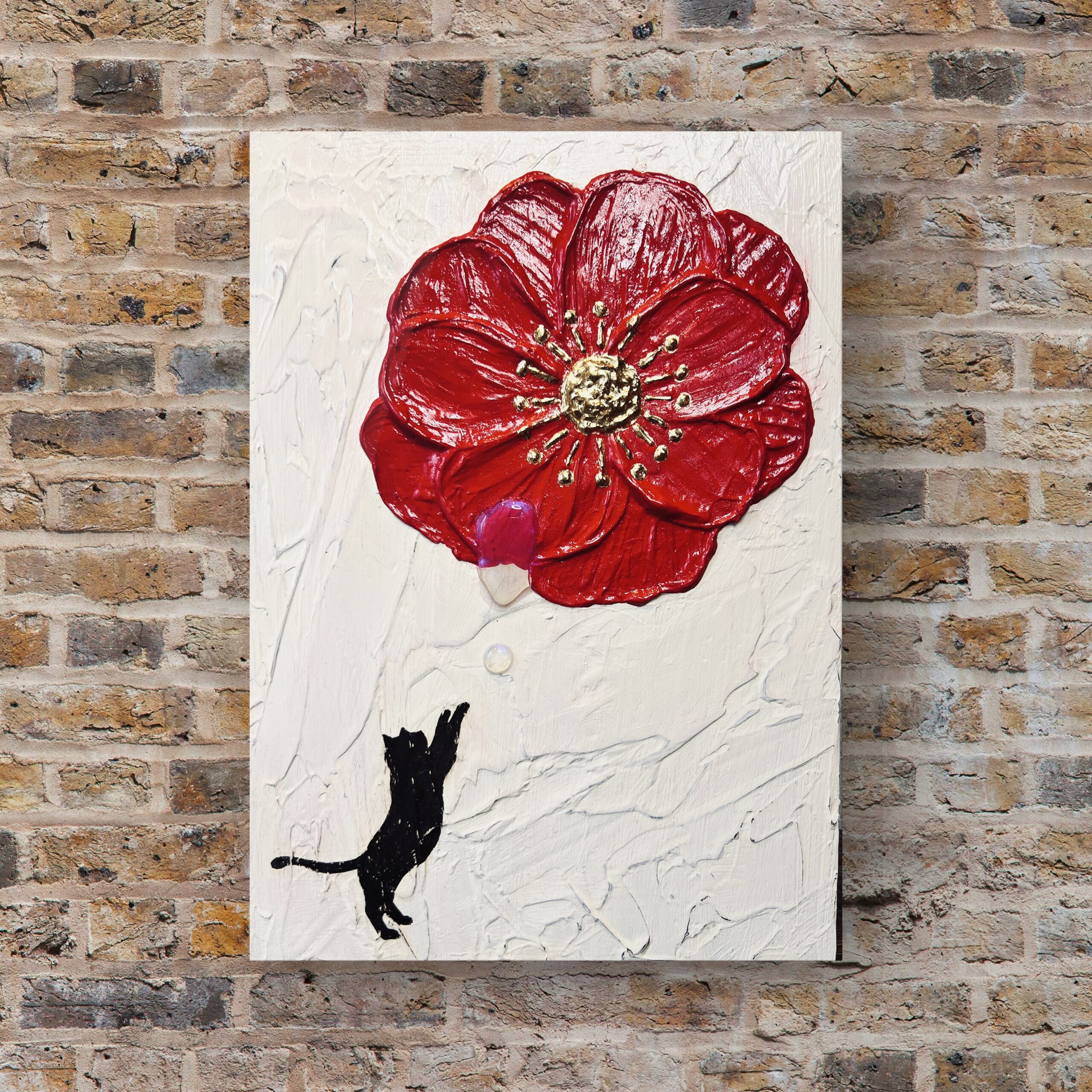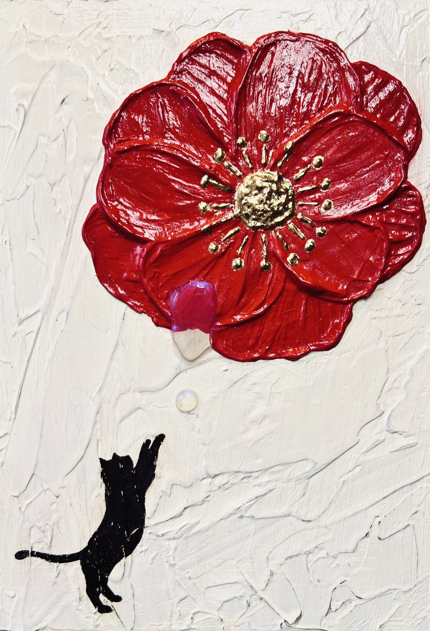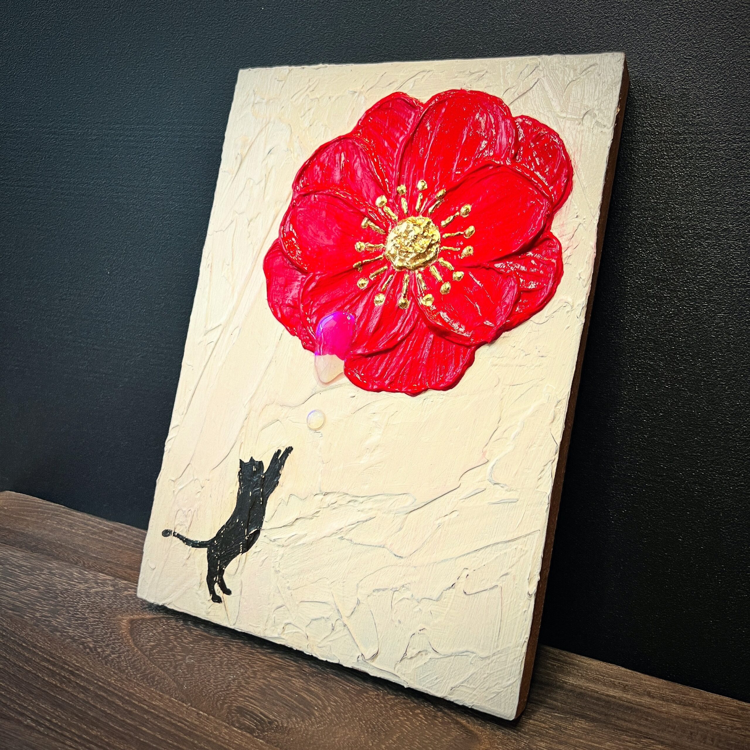 ひとつの物語を閉じ込めたような、温かさと不思議が同居する絵画作品に仕上がりました。 艶やかで凹凸のある赤い花は、まるで生命そのものを宿したようなリアルさ。 その下で小さな猫が見上げる姿には、花への憧れと少しの切なさがにじみ出ています。 猫と背景の白はマットな質感で描かれ、どこか懐かしさを感じさせるヴィンテージ感が漂います。 そして、この物語をさらに彩るのが、花からこぼれ落ちる水滴を模したレジン。 偏光パールが使われており、見る角度によって表情を変えるその輝きは、まるで猫の叶わぬ恋心を映し出しているかのようです。 小ぶりなサイズで、お部屋のどんな場所にもそっと寄り添うこの作品。 眺めるたびに、猫の気持ちや花の香りを想像し、小さな物語を思い浮かべたくなるような一枚です。