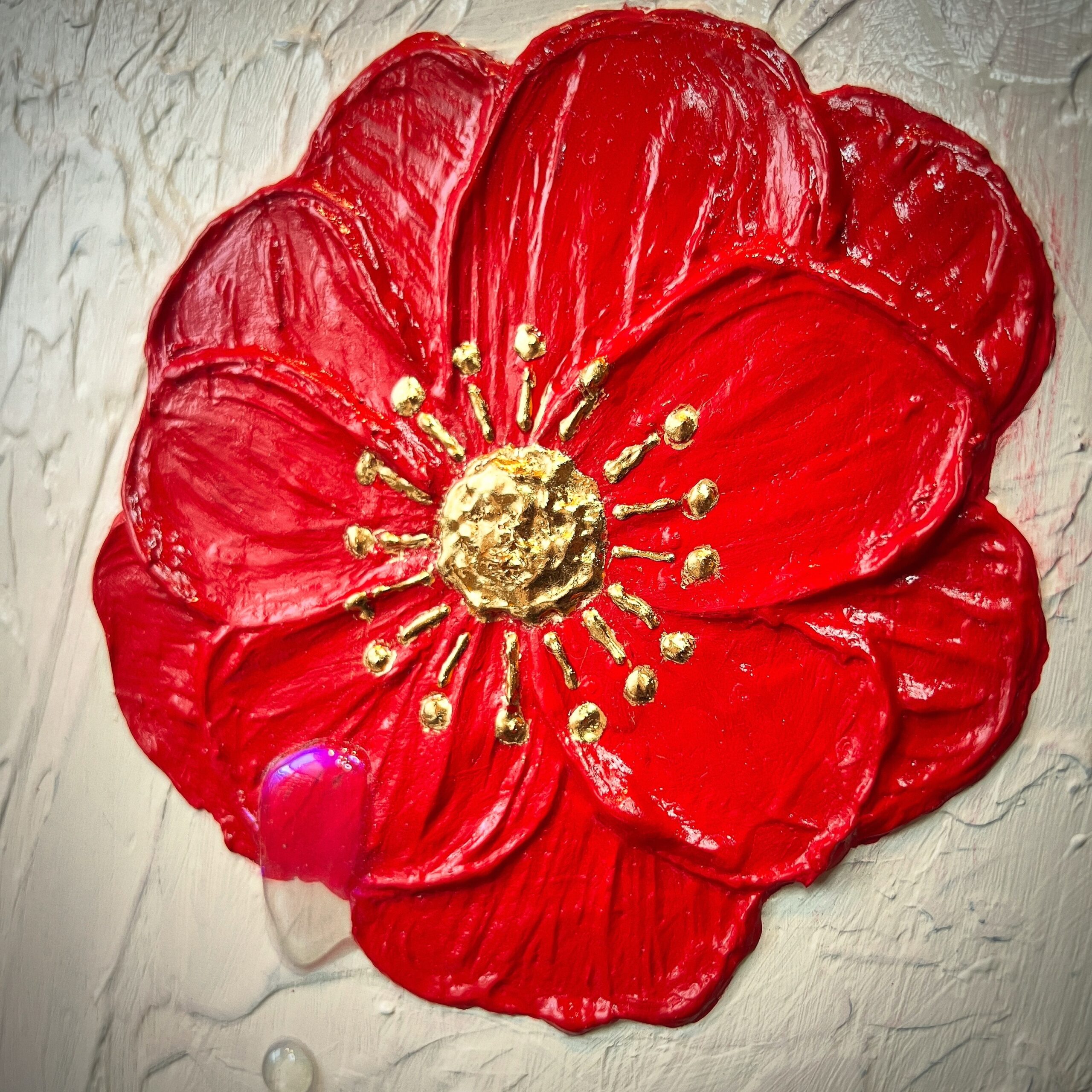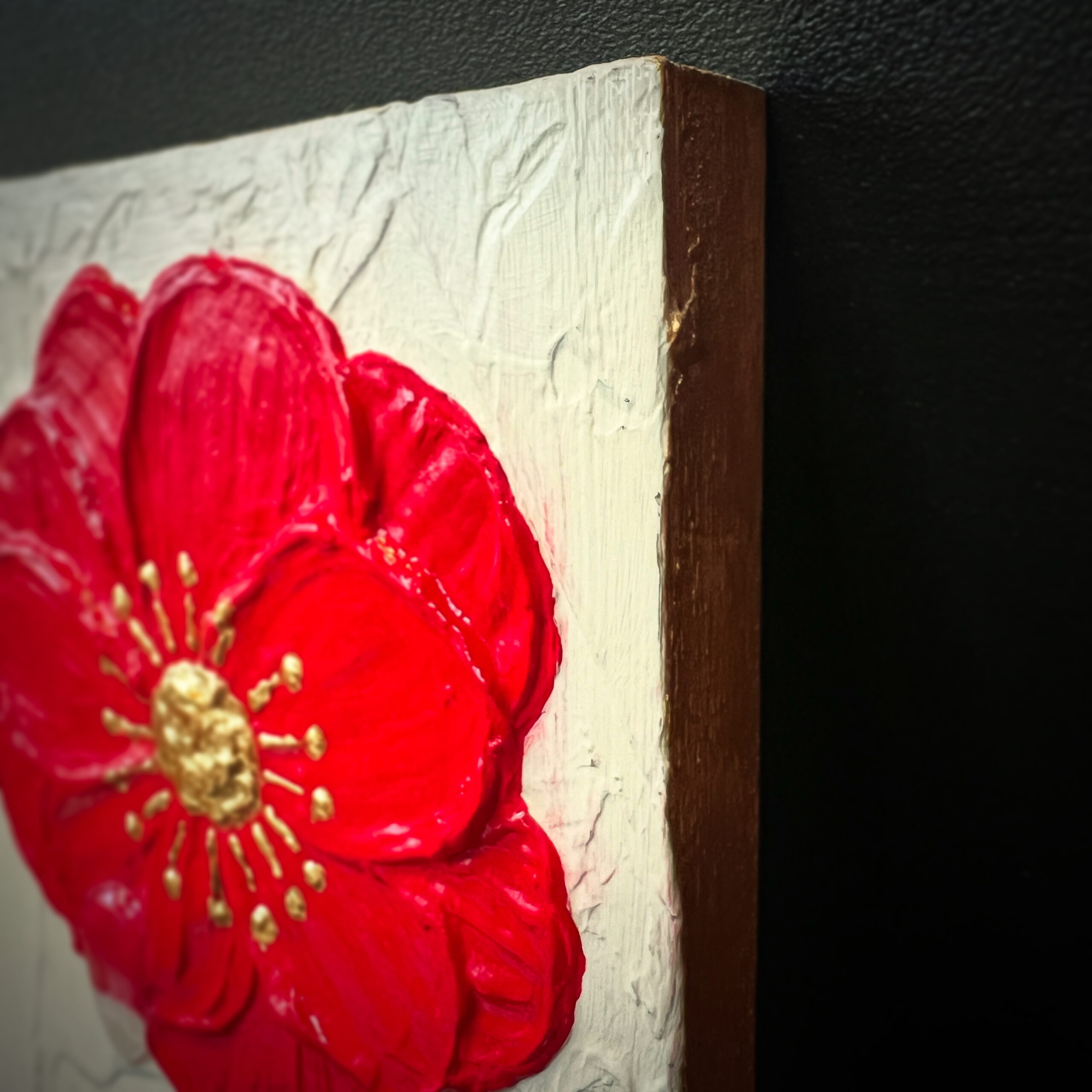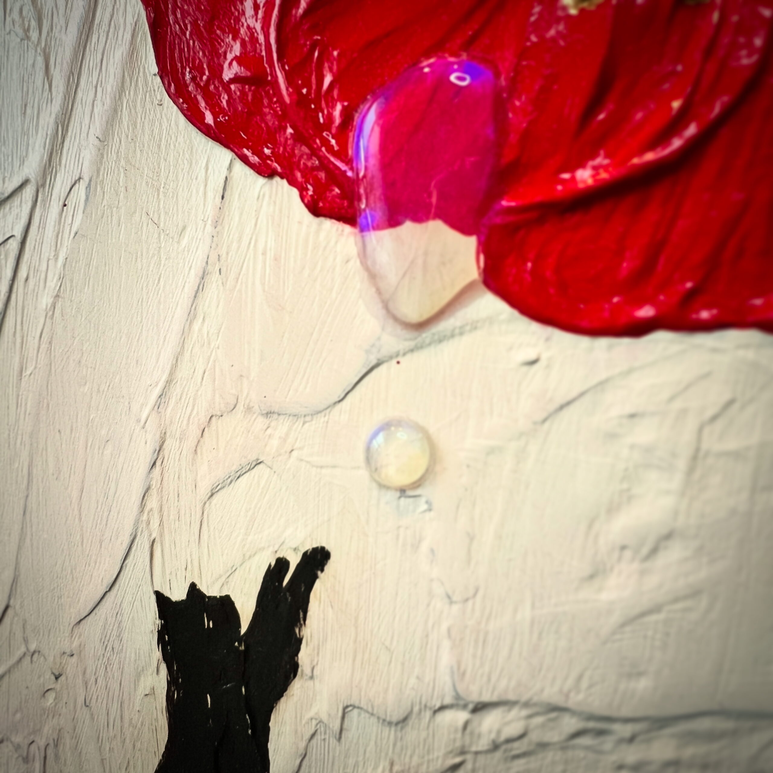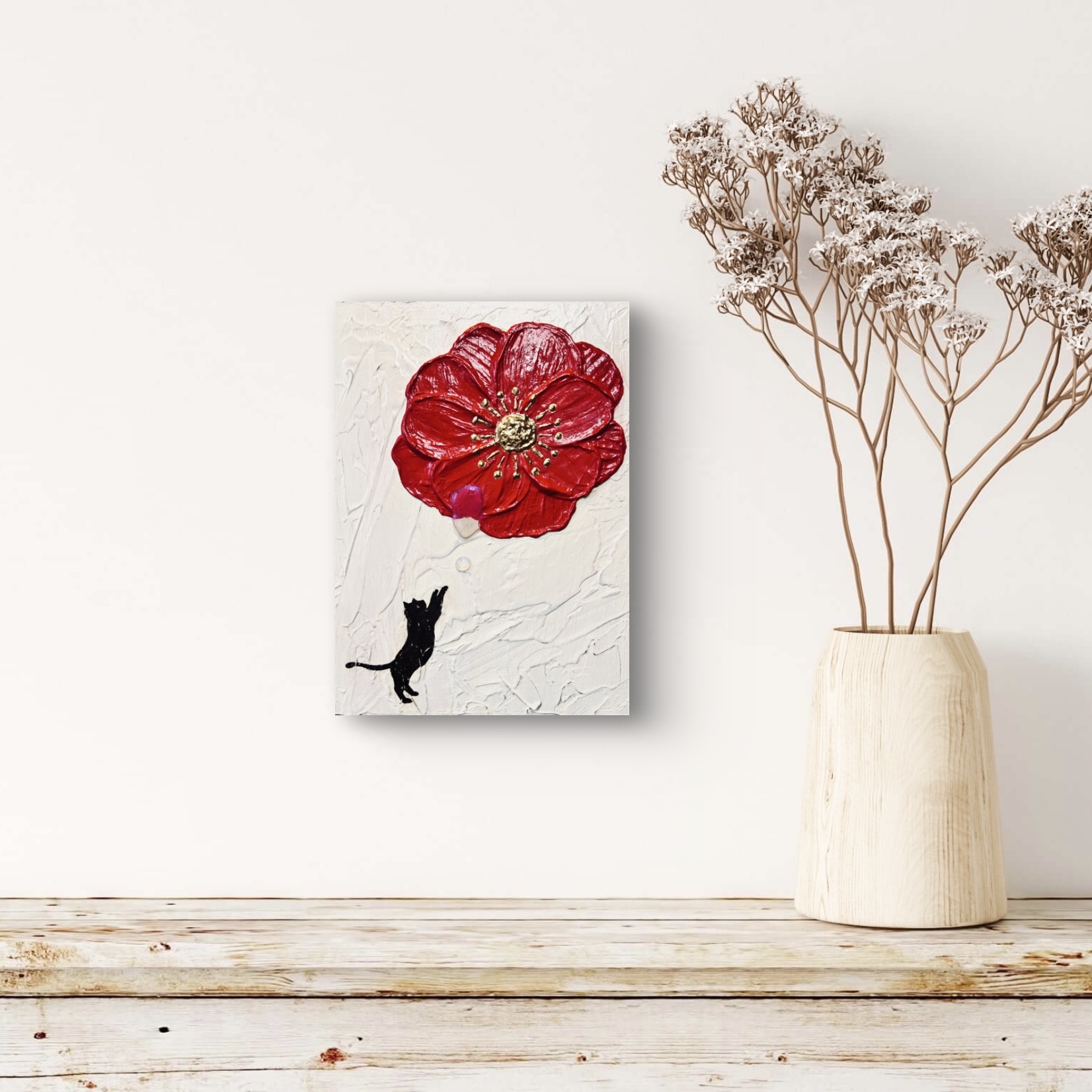 ひとつの物語を閉じ込めたような、温かさと不思議が同居する絵画作品に仕上がりました。 艶やかで凹凸のある赤い花は、まるで生命そのものを宿したようなリアルさ。 その下で小さな猫が見上げる姿には、花への憧れと少しの切なさがにじみ出ています。 猫と背景の白はマットな質感で描かれ、どこか懐かしさを感じさせるヴィンテージ感が漂います。 そして、この物語をさらに彩るのが、花からこぼれ落ちる水滴を模したレジン。 偏光パールが使われており、見る角度によって表情を変えるその輝きは、まるで猫の叶わぬ恋心を映し出しているかのようです。 小ぶりなサイズで、お部屋のどんな場所にもそっと寄り添うこの作品。 眺めるたびに、猫の気持ちや花の香りを想像し、小さな物語を思い浮かべたくなるような一枚です。
