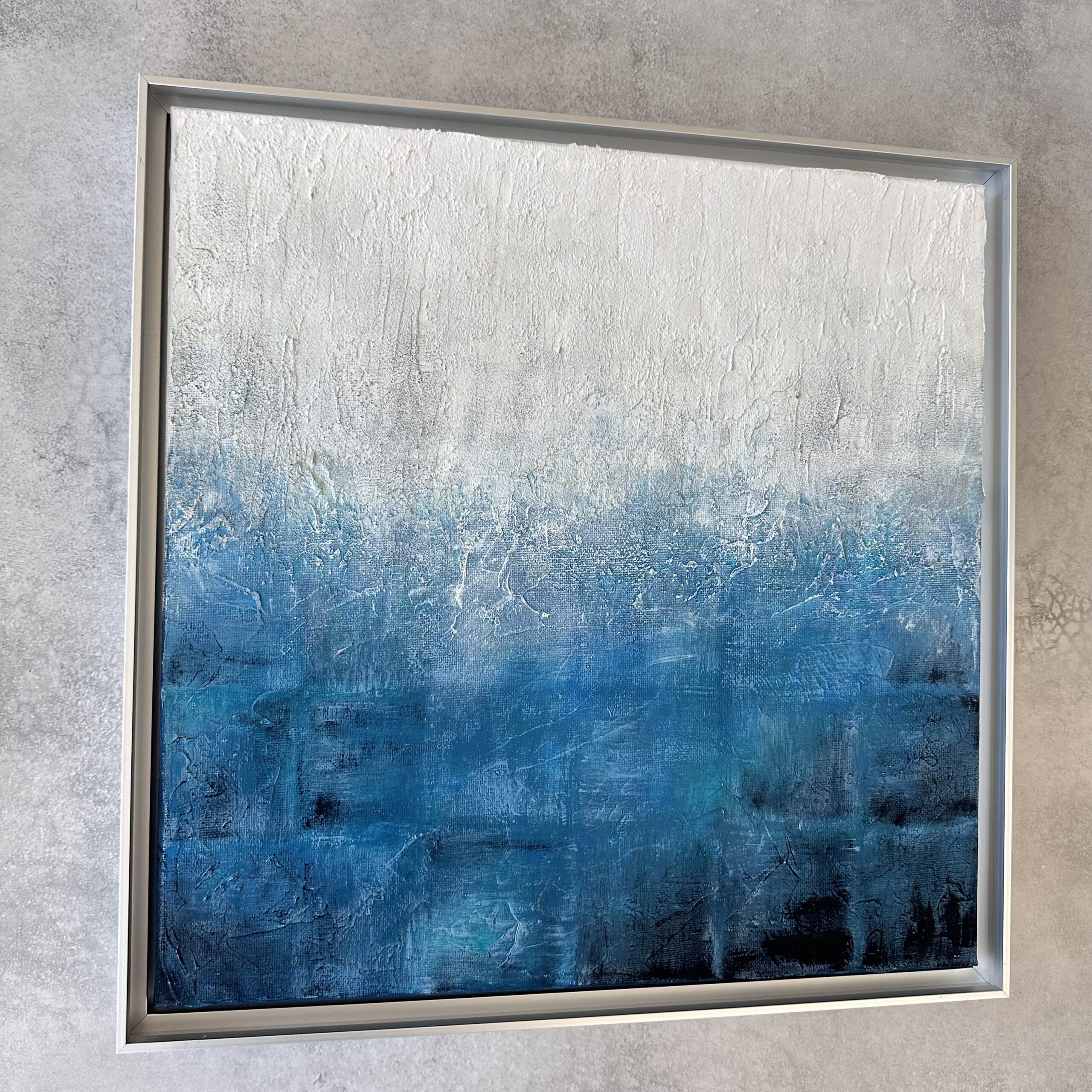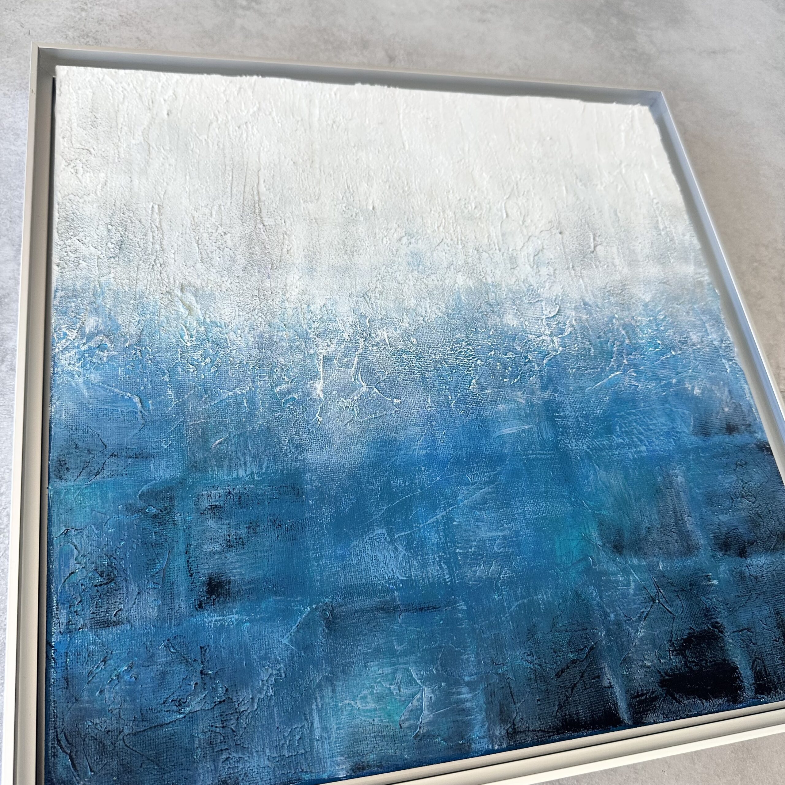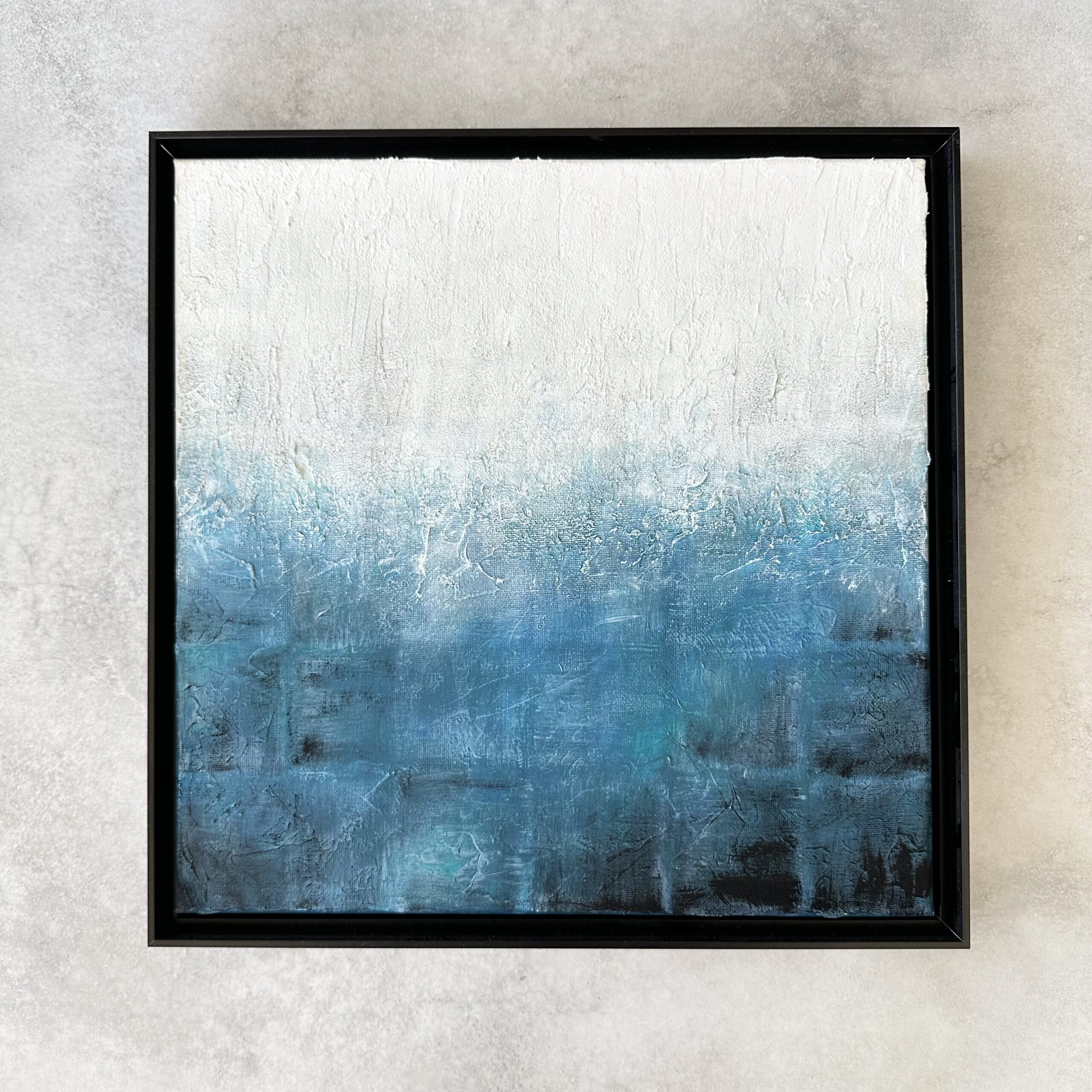 青と白のシンプルな構図ですが、モデリングペーストや砂で表情をつけてあり、深みが感じられる作品です。
