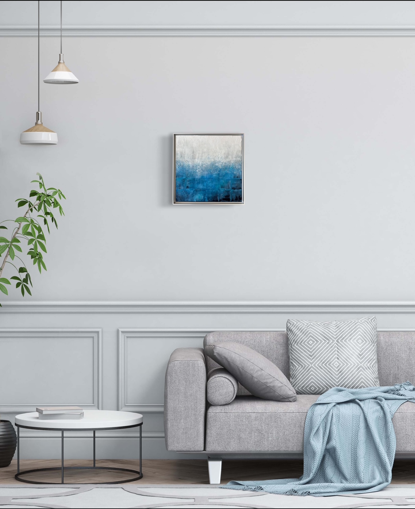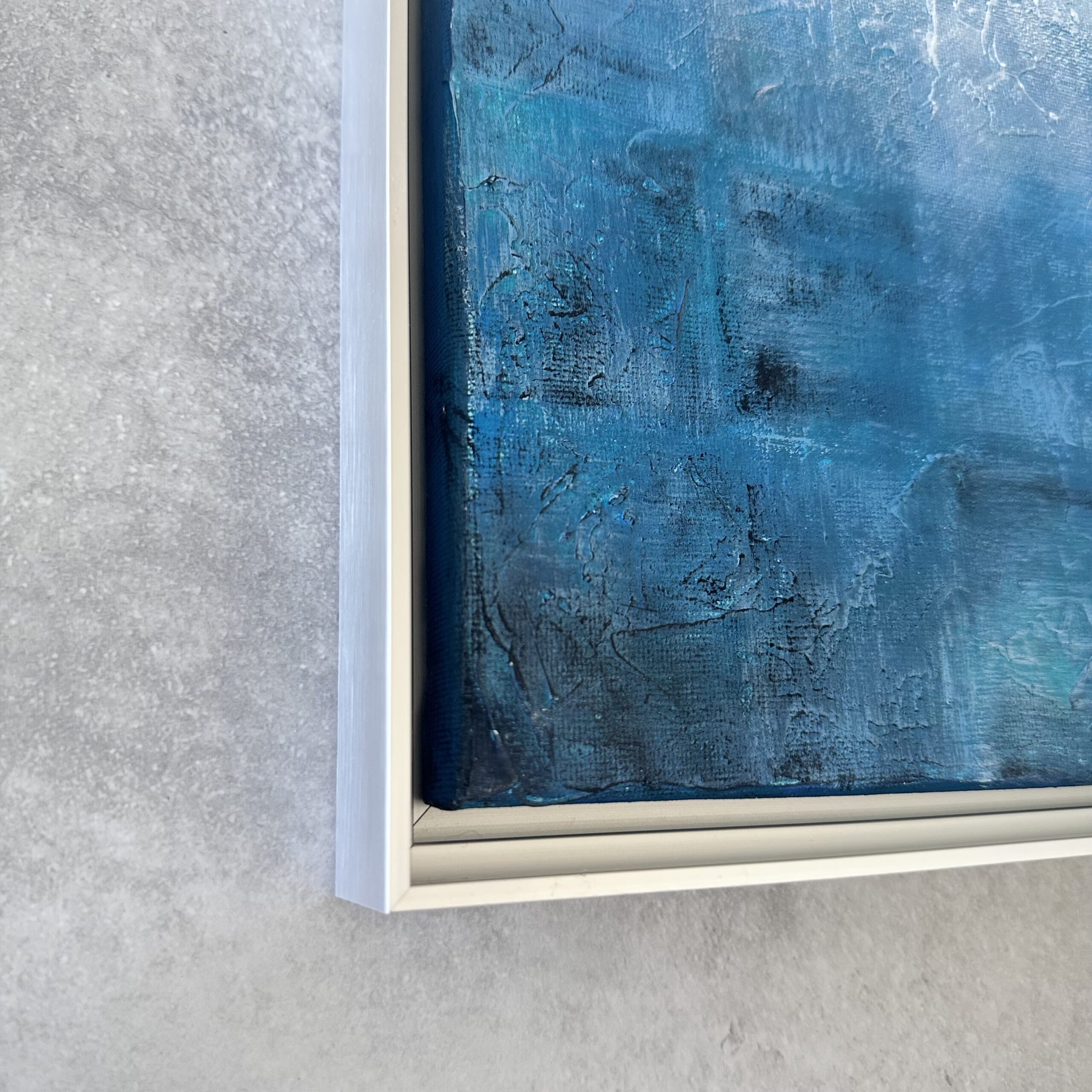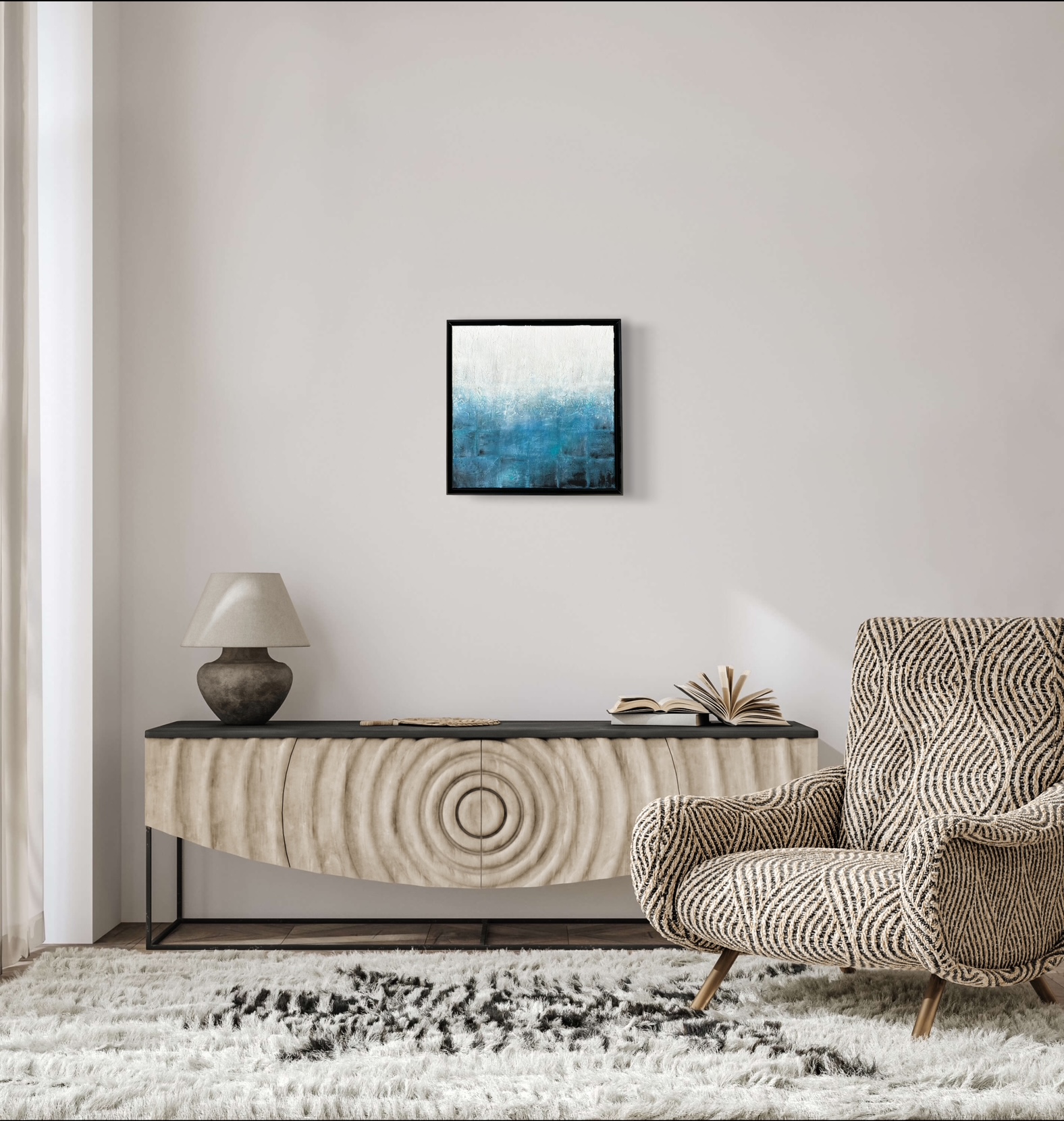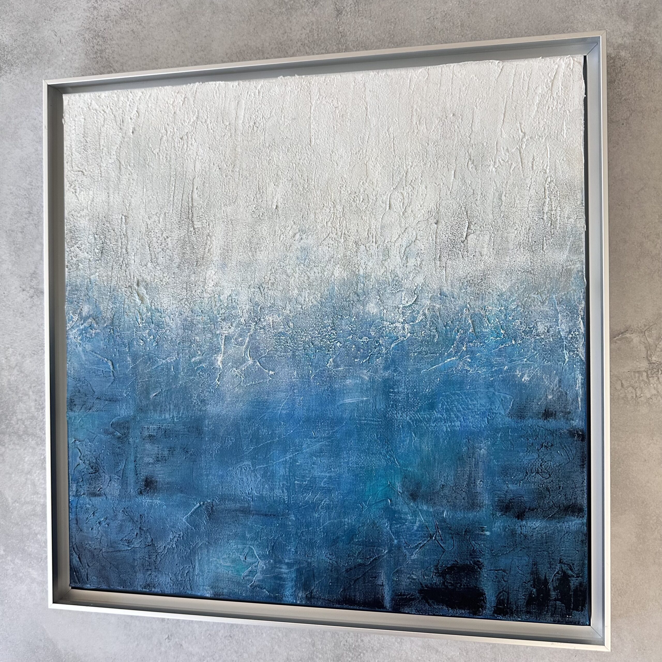 青と白のシンプルな構図ですが、モデリングペーストや砂で表情をつけてあり、深みが感じられる作品です。