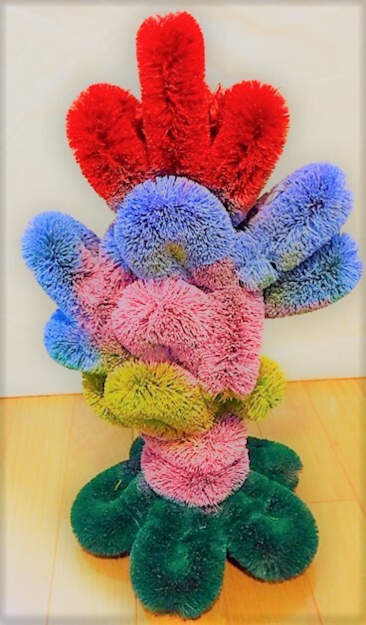 亀の子だわしを逆回転で折りなおして、円形木製構造プレート+構造角材を樹木型に組み立て取り付けし、インテリアグリーンとして構築 <レインボーカラー&グリーン>に対応