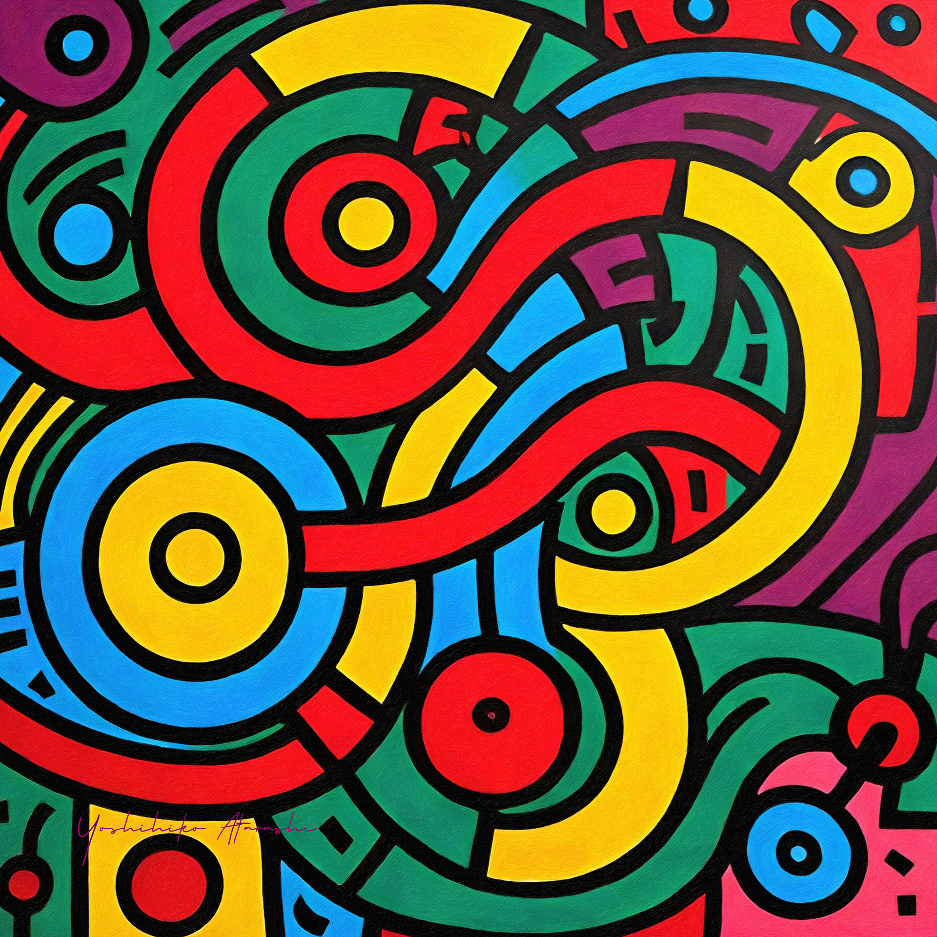 この絵は、私の心の奥底にある感情を、形、色、そして線で表現しました。幾何学的な形は、秩序と安定感を、一方で、鮮やかな色彩は、感情の激動を象徴しています。これらの要素が複雑に絡み合い、見る人に様々なイメージ(君の行く道)を呼び起こすことを願っています。