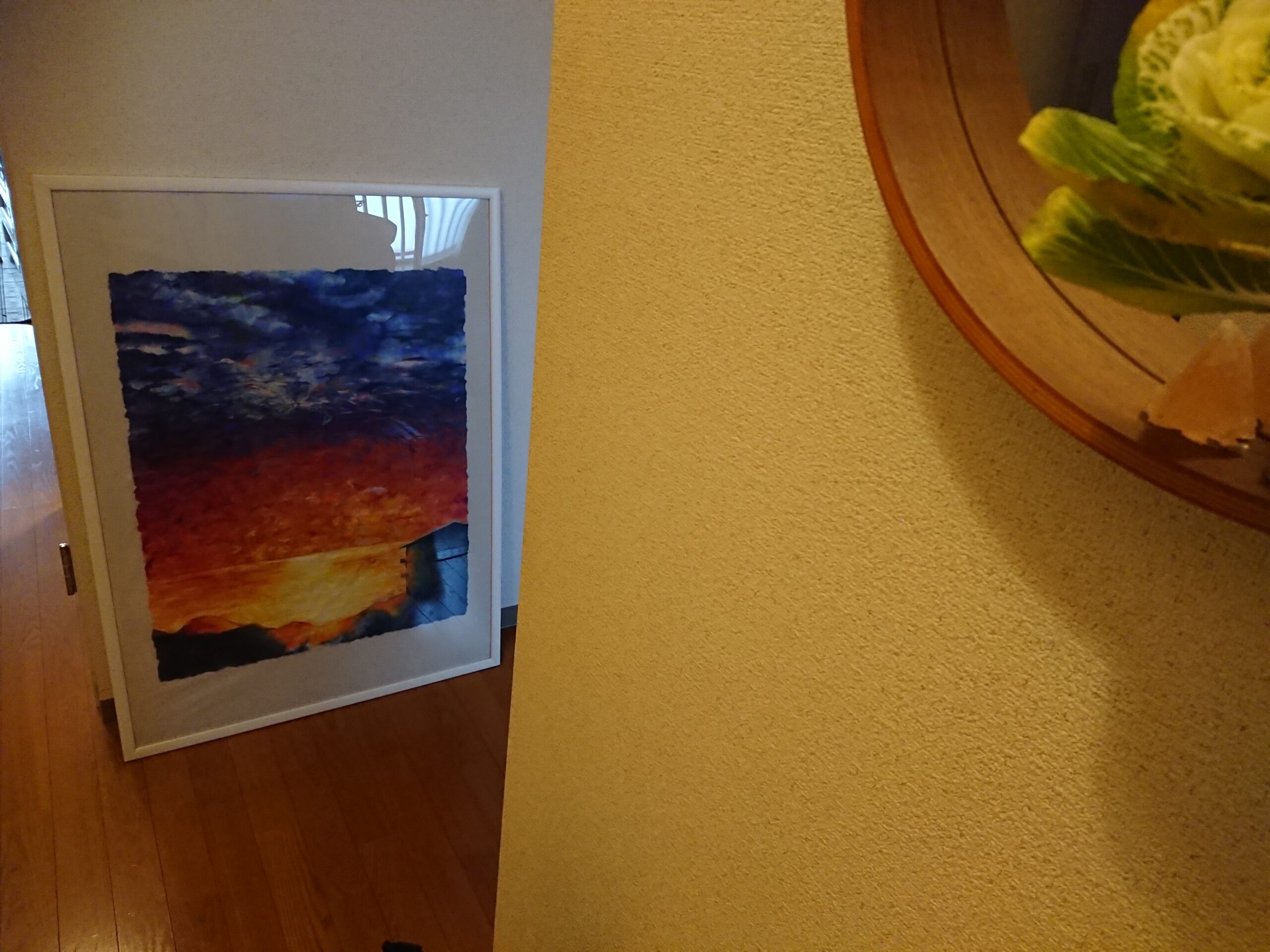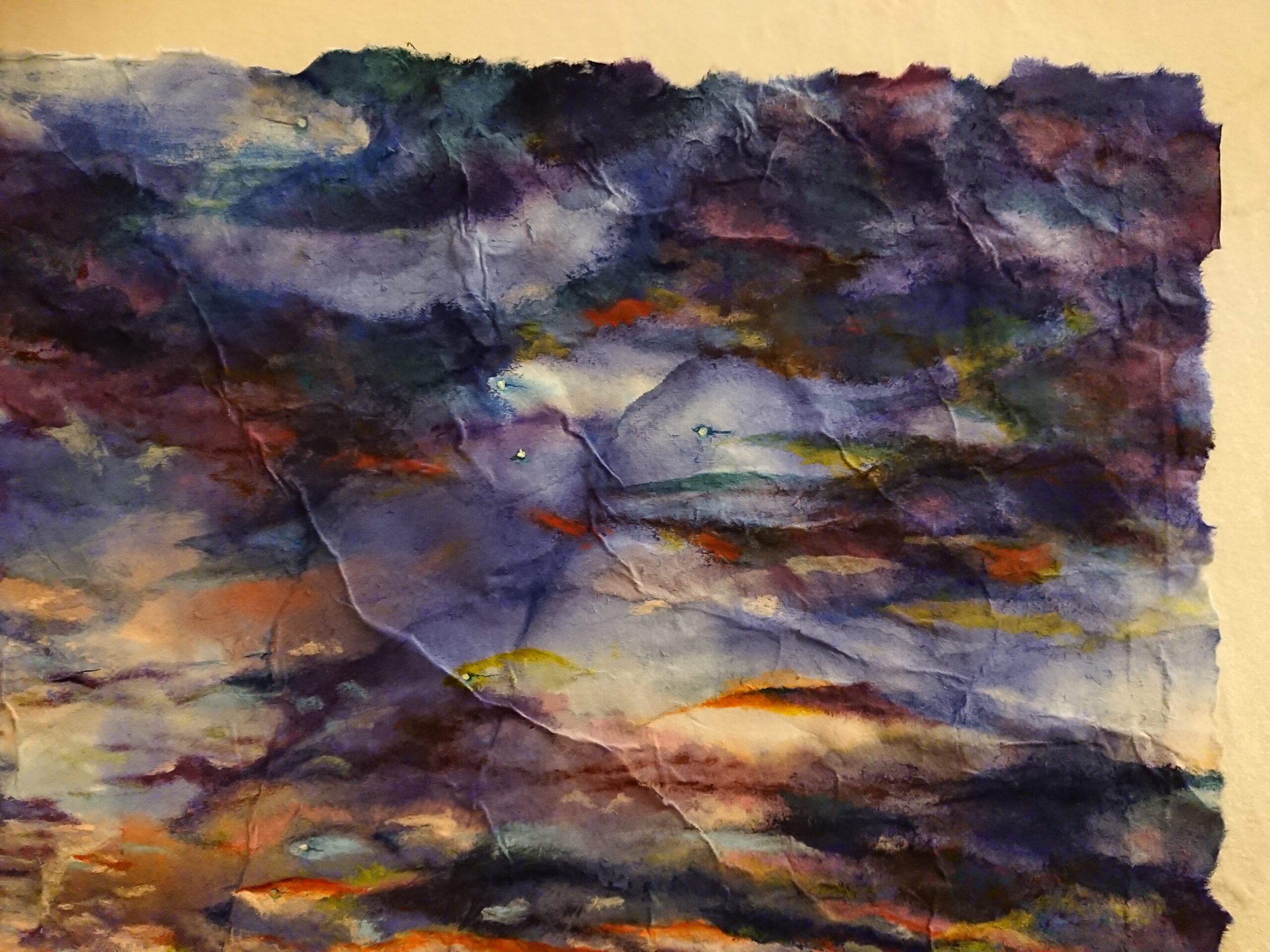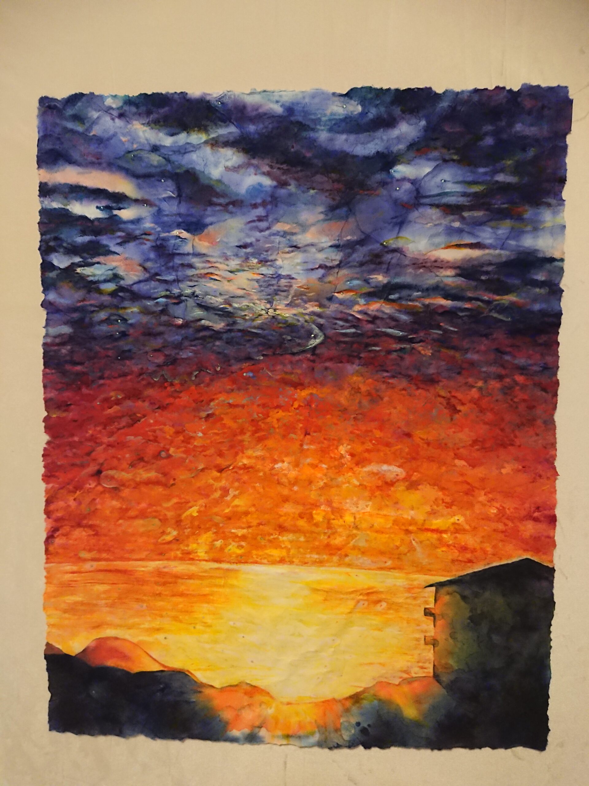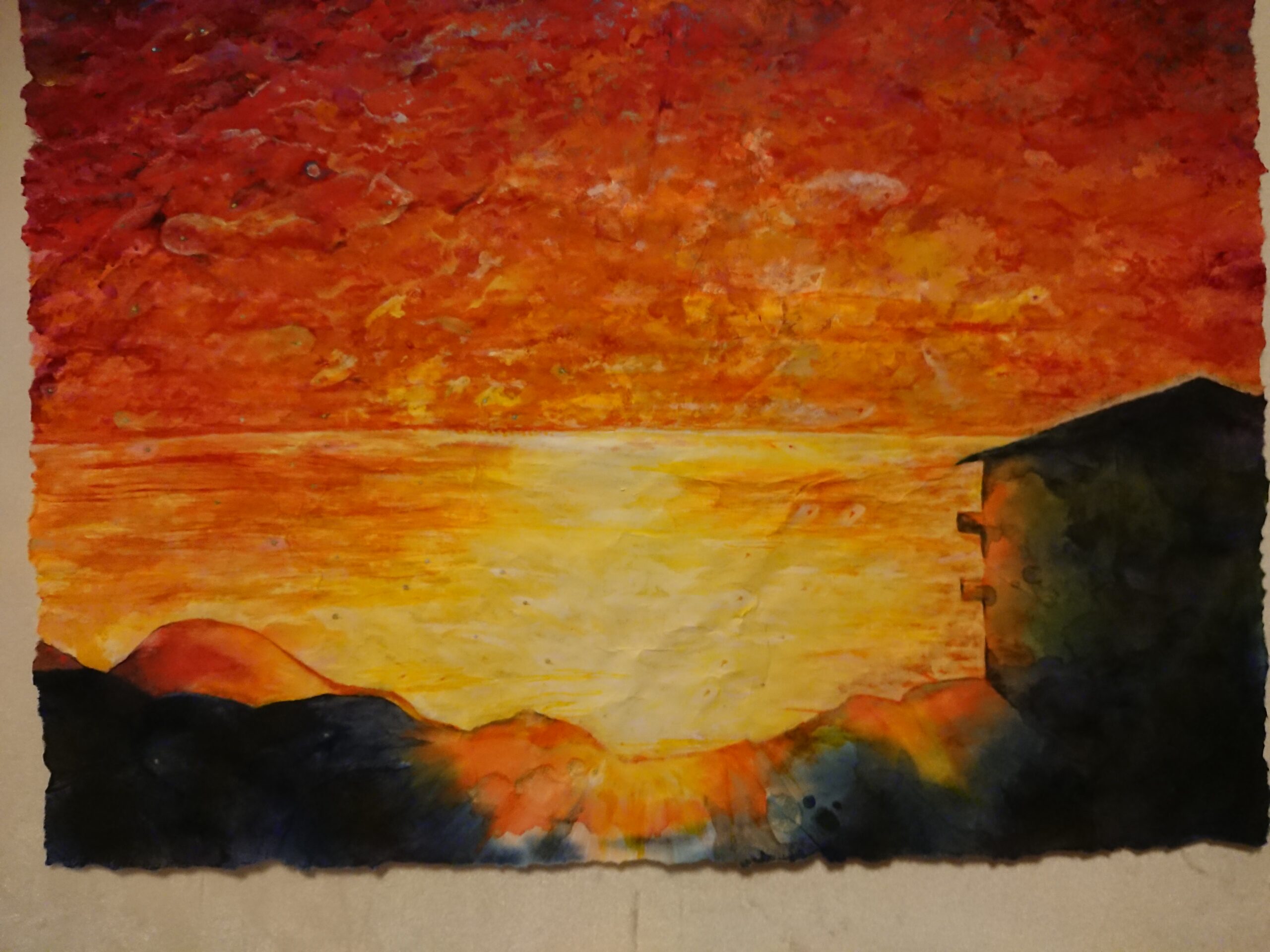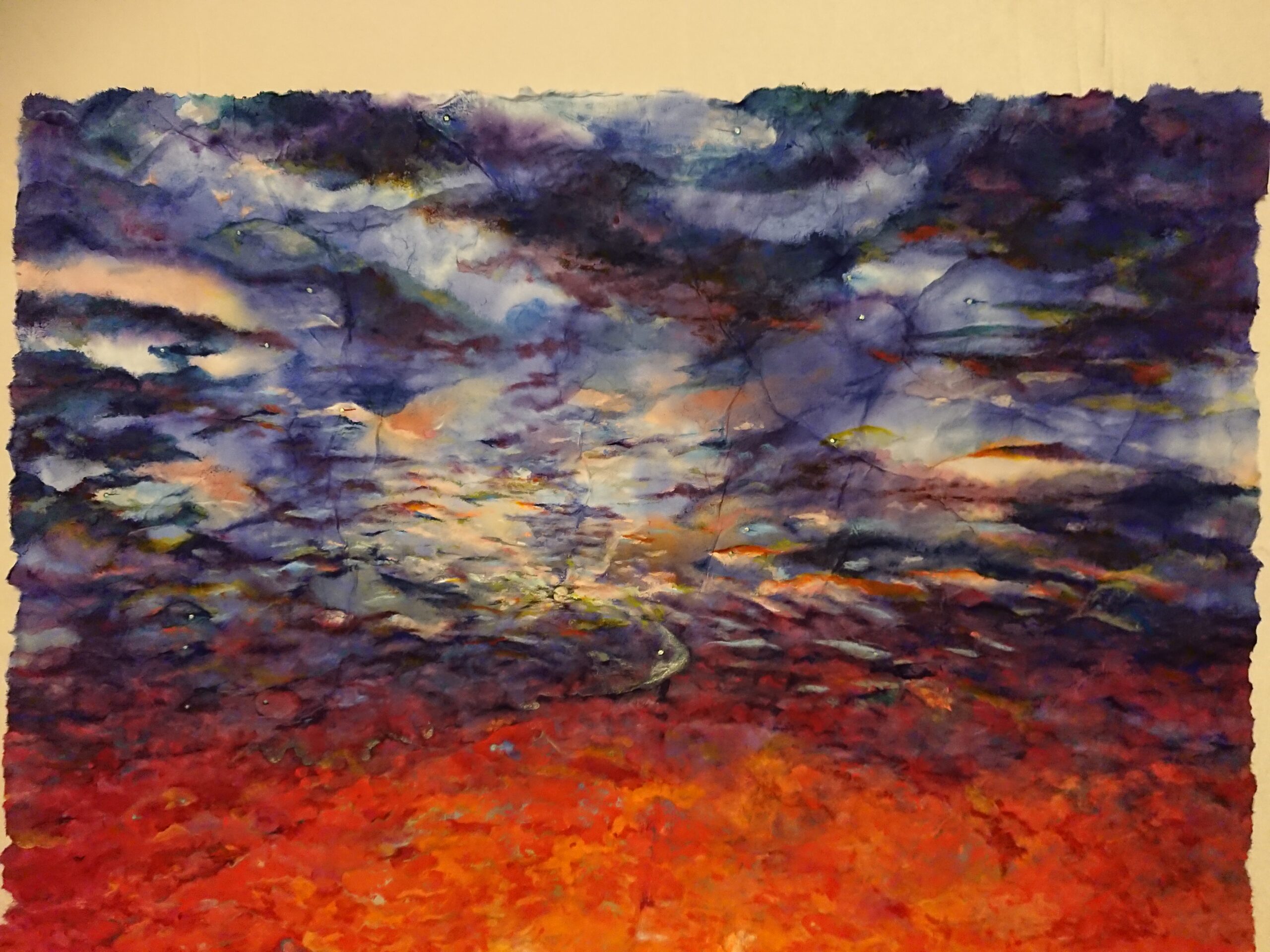 月と太陽が共存する朝焼けの中で、見えるか見えないか微妙な生き物が描かれています。和紙の自由な繊維の染み込みやシワによって、明暗が生まれ、その生き物は見る人によって異なって見えるかもしれません。毎回見るたびに新たな生命感が輝いてくる朝焼けの風景です。