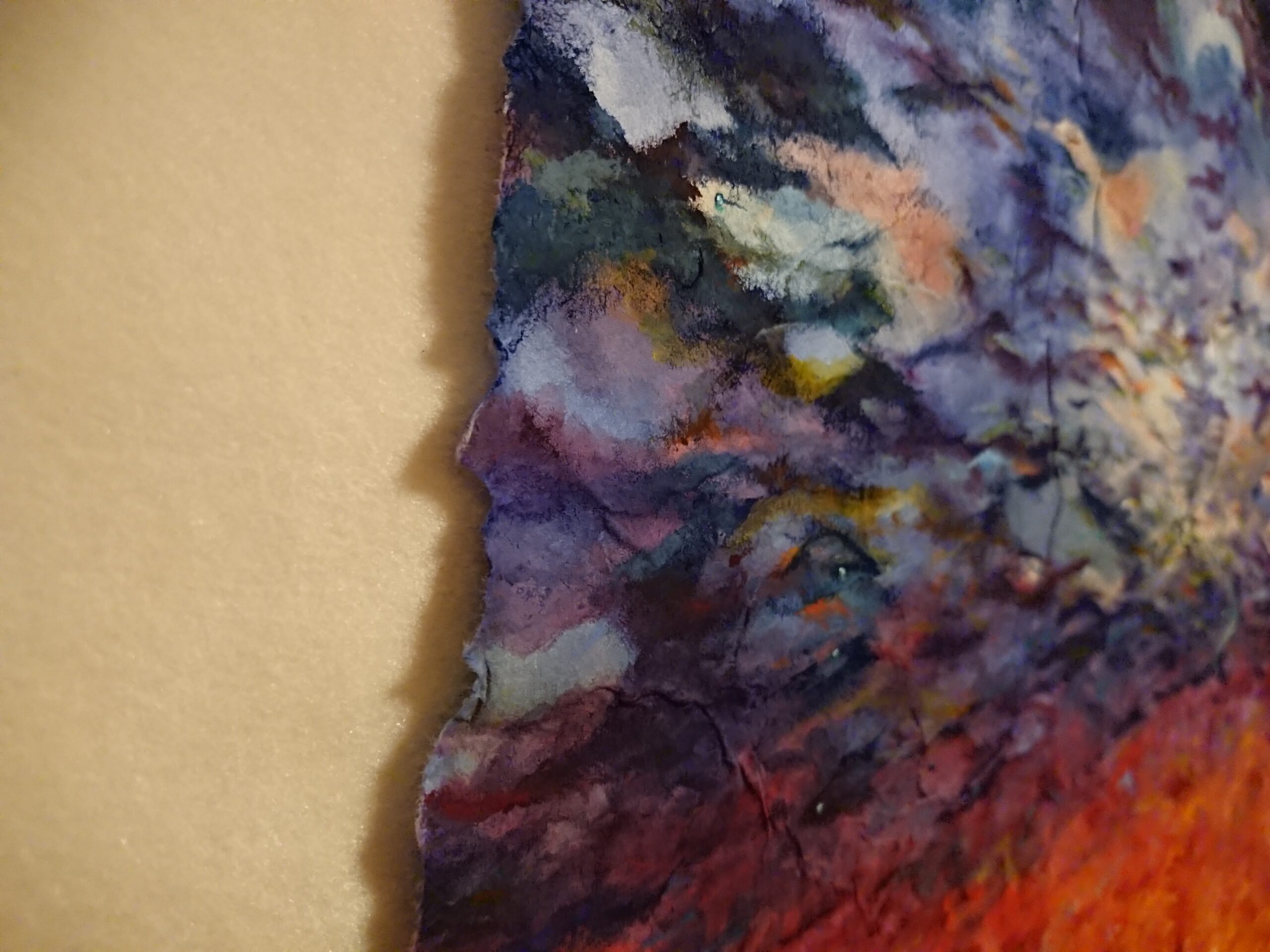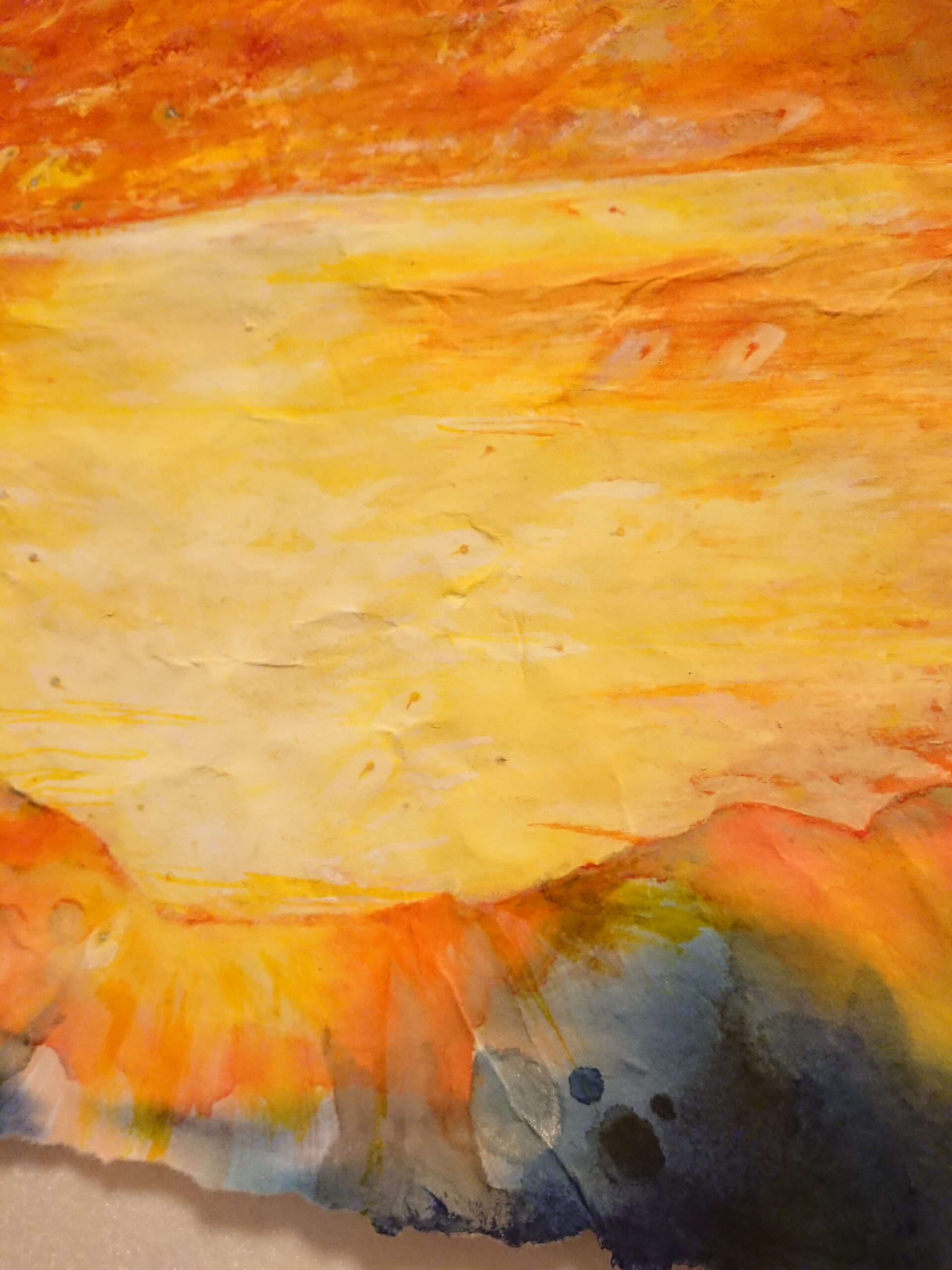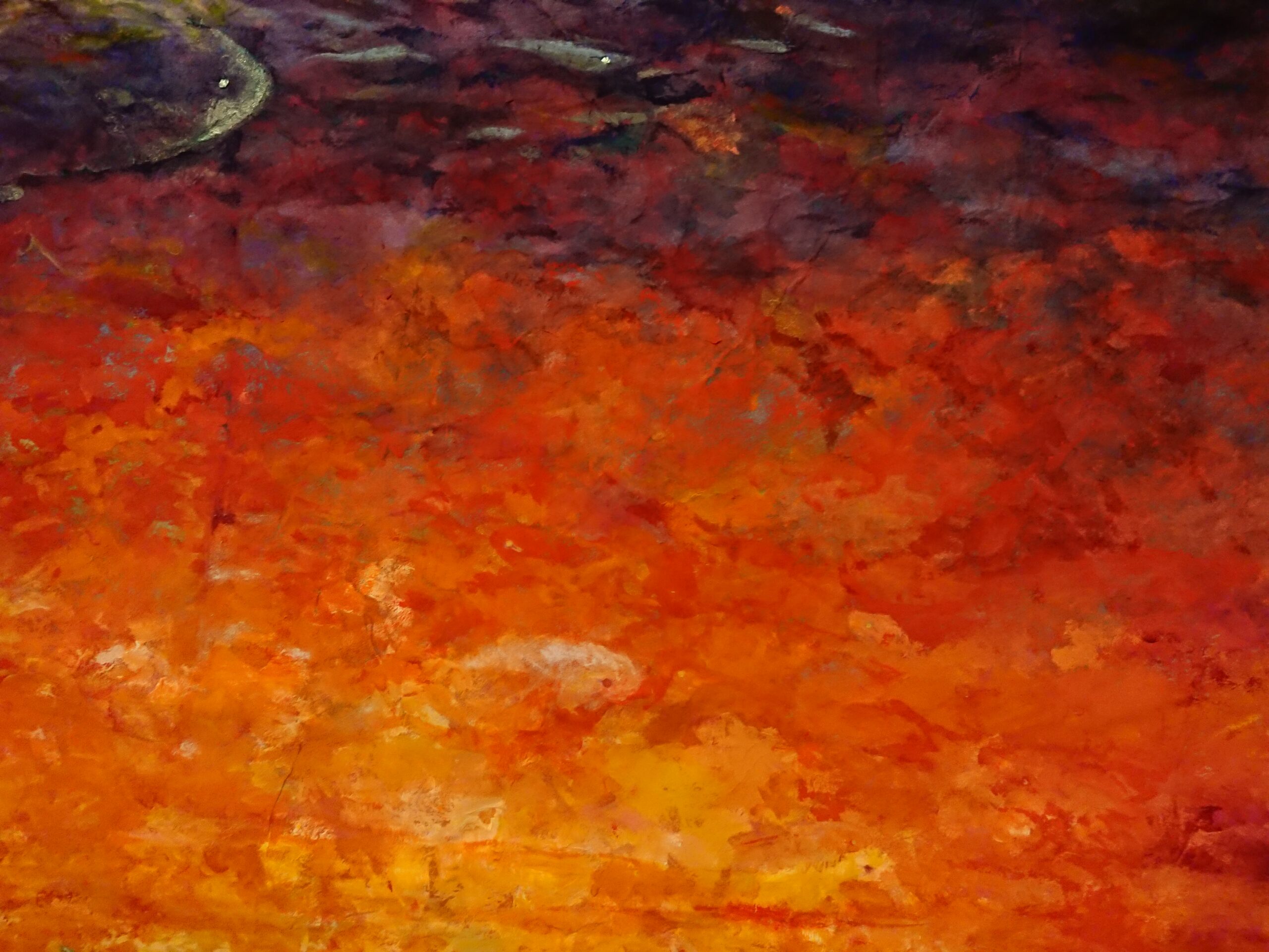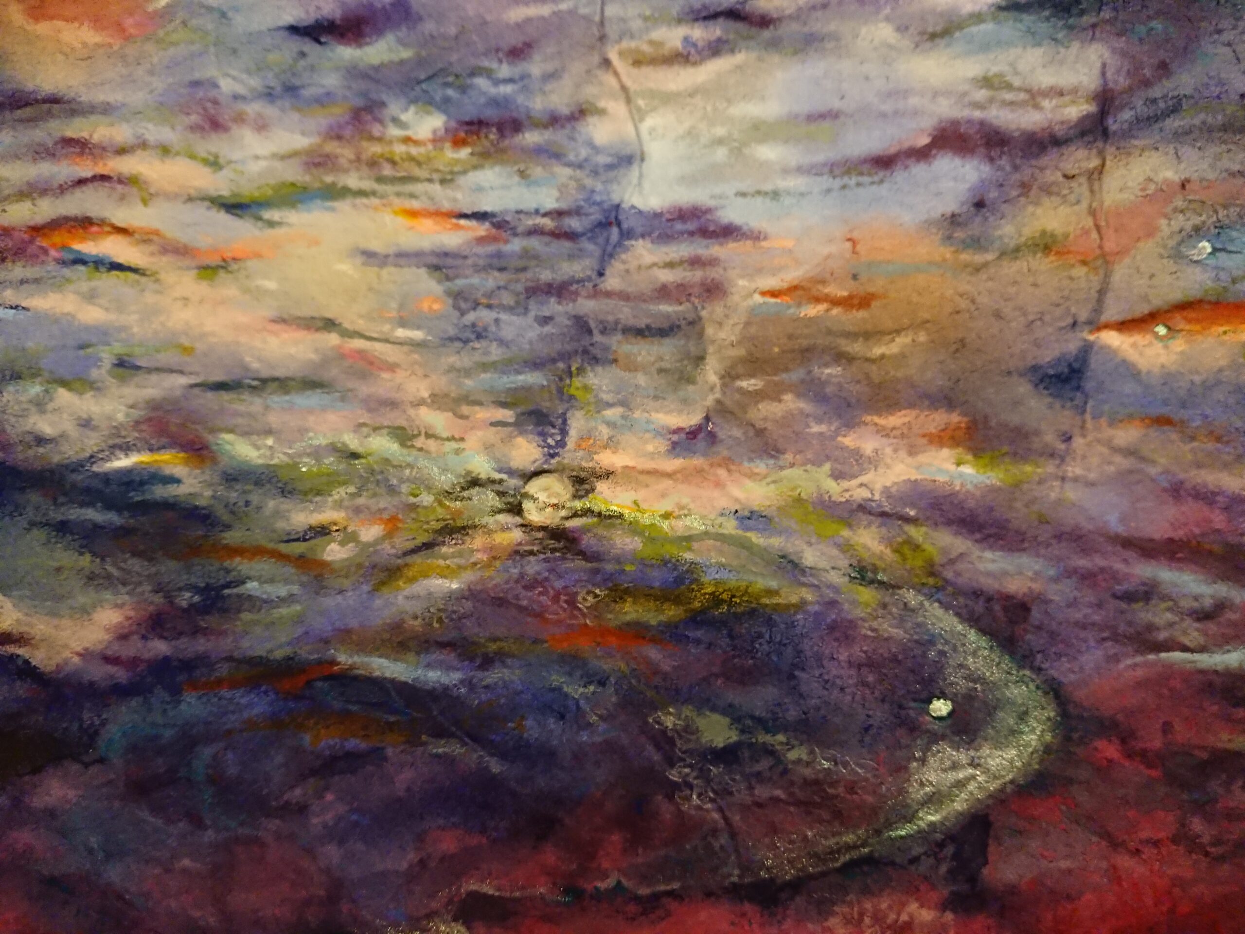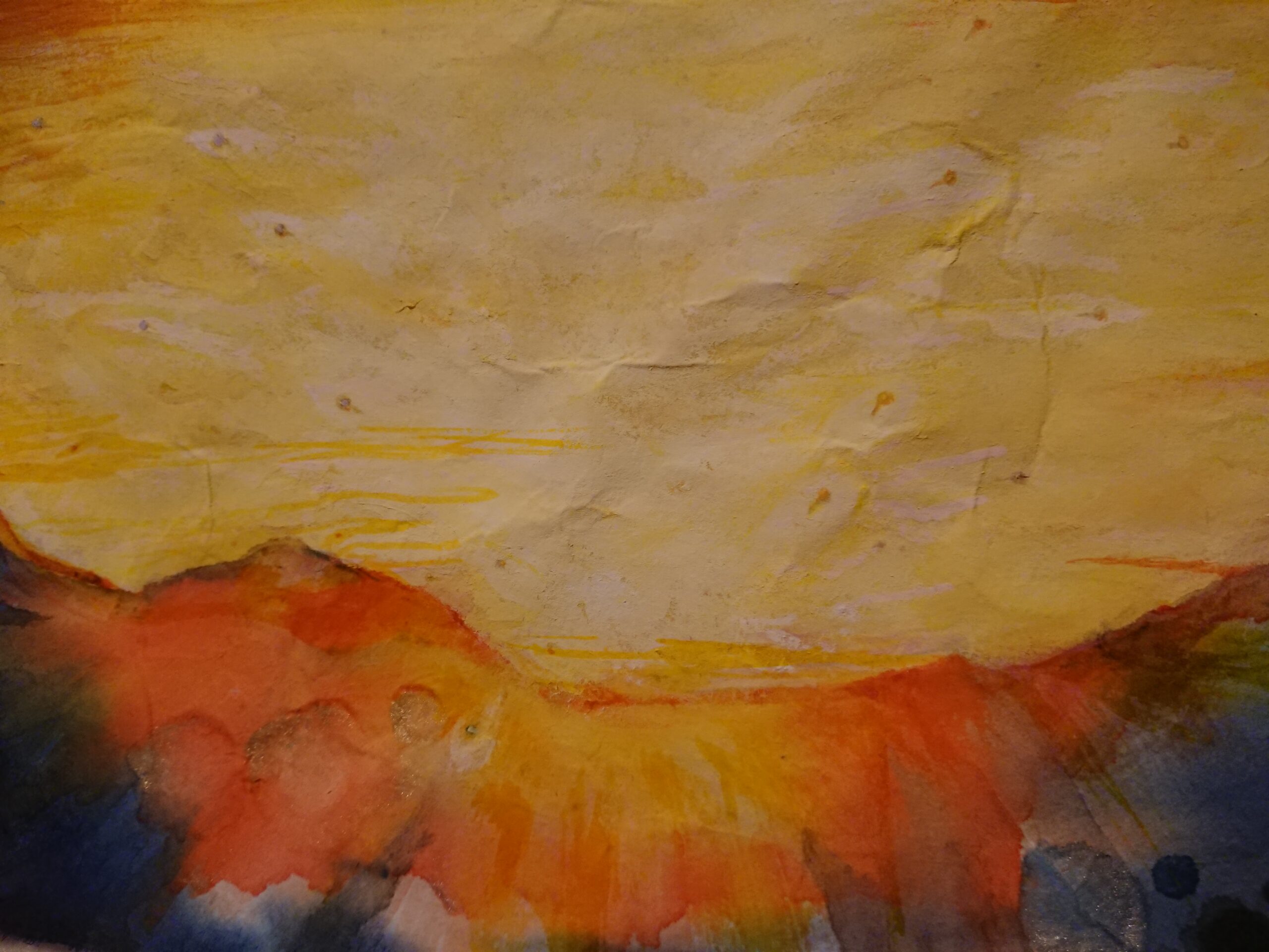 月と太陽が共存する朝焼けの中で、見えるか見えないか微妙な生き物が描かれています。和紙の自由な繊維の染み込みやシワによって、明暗が生まれ、その生き物は見る人によって異なって見えるかもしれません。毎回見るたびに新たな生命感が輝いてくる朝焼けの風景です。