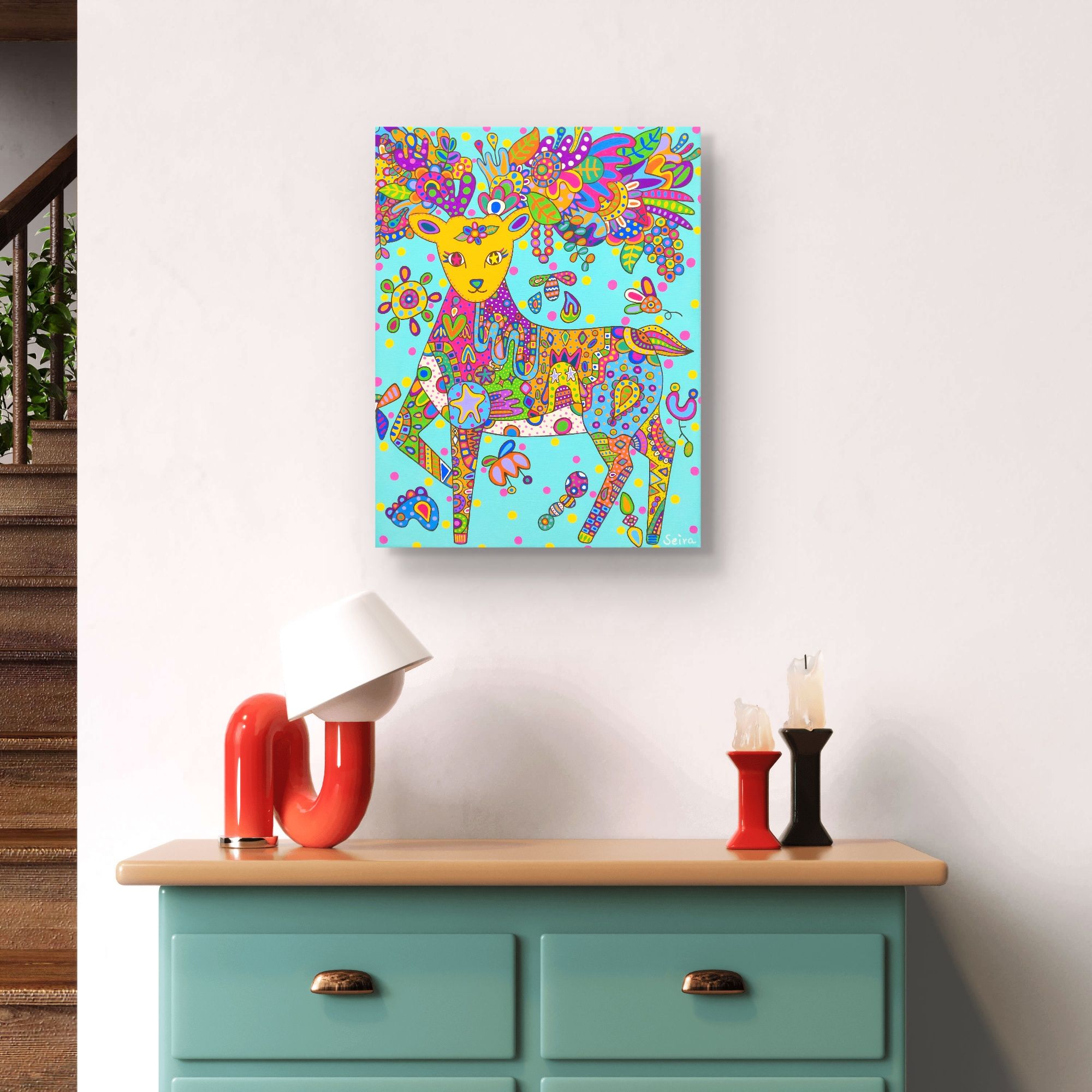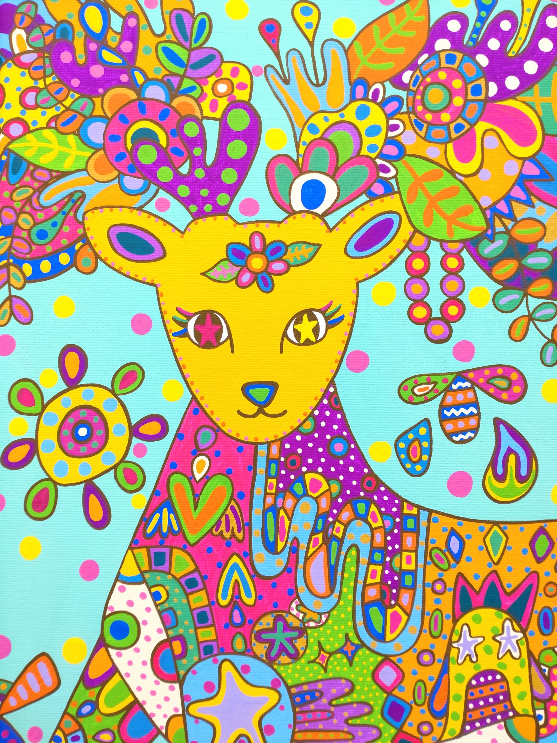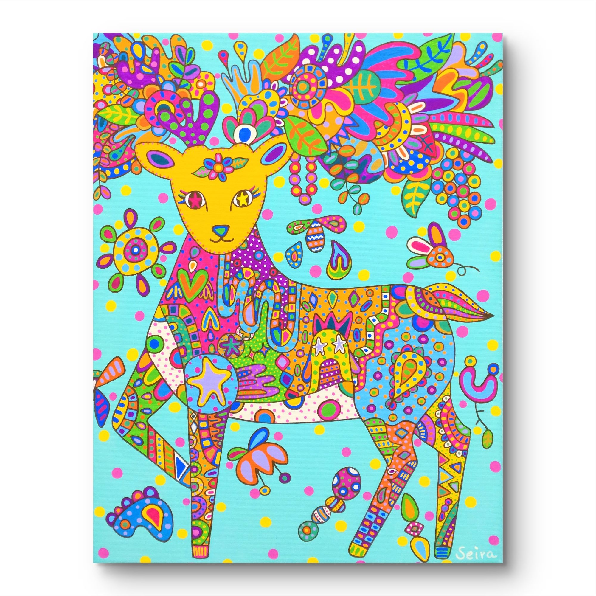 鹿がお好きな方、お花がお好きな方、カラフルな動物アートをお探しの方、ギフトアートをお探しの方におススメです。