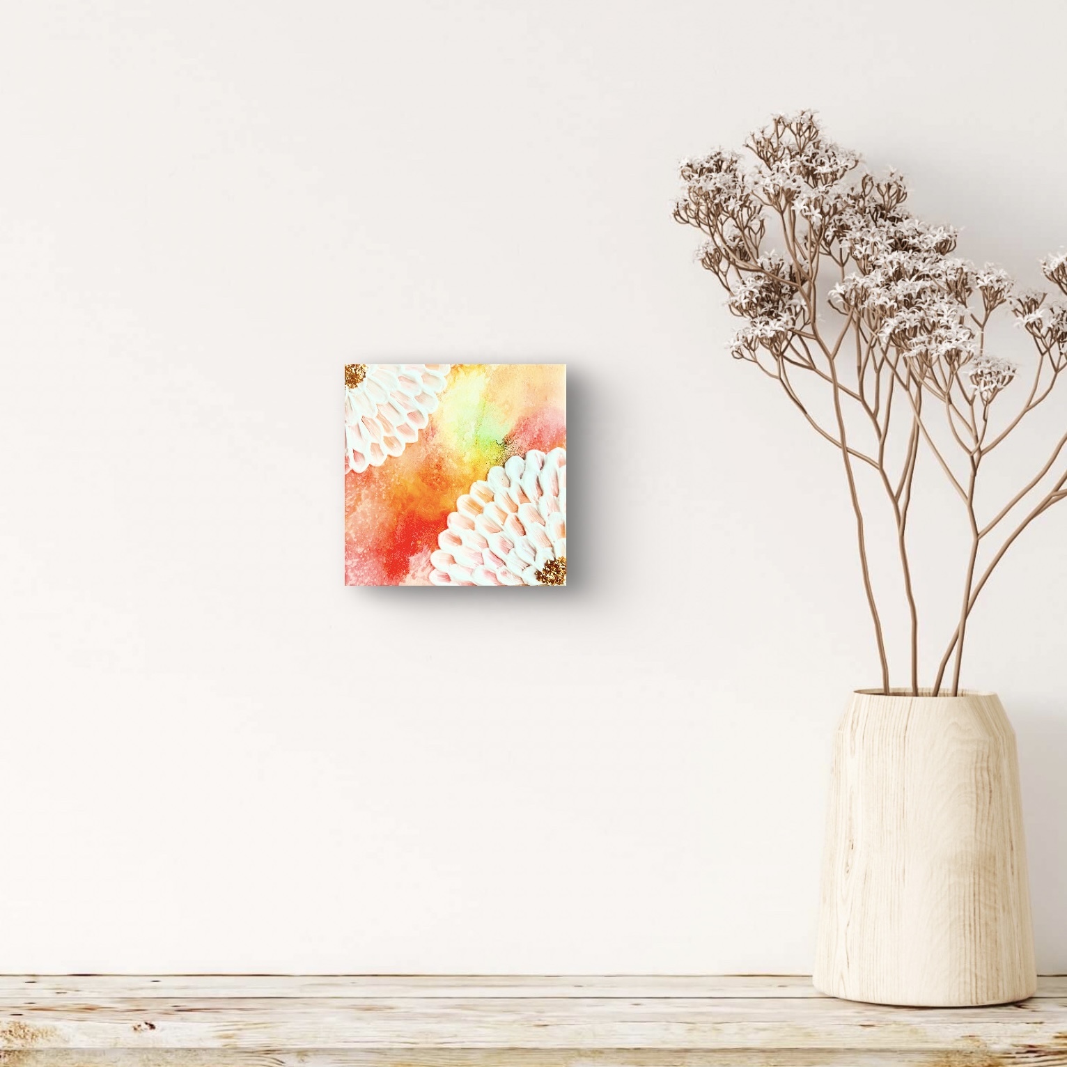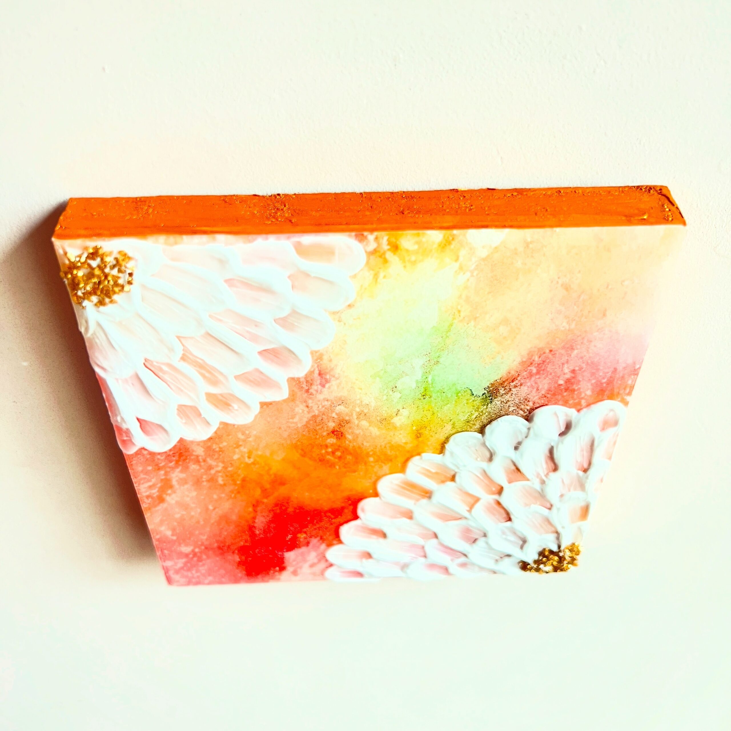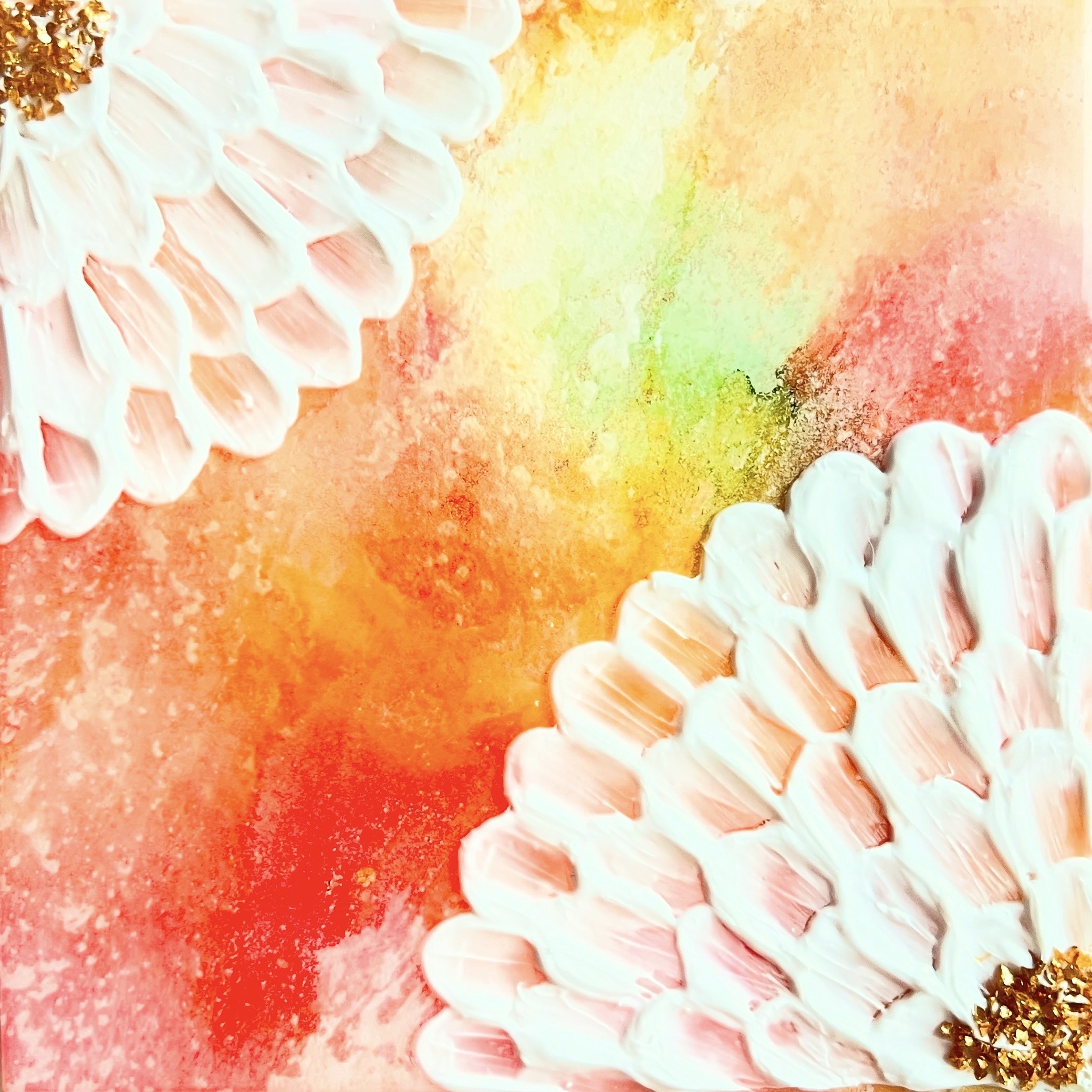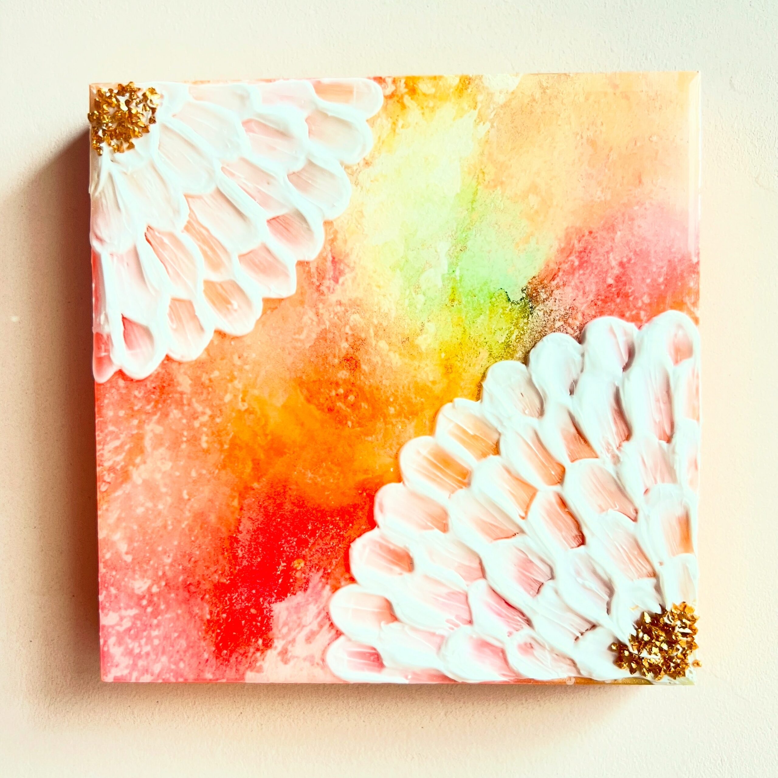 春のやわらかな風が、新しいページをめくるように、心をくすぐる季節。 そんな優しい季節の訪れを、モデリングペーストで描いた立体的な花で表現しました。 新しいスタートを切る方、新しい季節の訪れを心待ちにしている方、お部屋に春の温もりを取り入れたい方におすすめです。 ★下地と花の中心部に散りばめたゴールド色、そしてレジンコーティングが陽の光を浴びて輝く様子は、動画でもご覧いただけます↓ https://youtube.com/shorts/crZhFiOMFn8?feature=share 朝、目覚めた時にこの絵を見ると、一日を明るい気持ちで始められるでしょう。 リビングや寝室、玄関など、どこに飾っても優しく馴染み、春の訪れを告げる光を届けてくれます。 この作品には、新しい季節への希望や喜び、そして人生の門出を祝福する想いを込めました。 花咲く季節の特別な時間を感じていただけたら嬉しいです。 希望の花があなたの未来を明るく照らし、希望へと導いてくれますように。 ☆木製パネルのサイズ:横130mm 縦130mm 厚さ18mm (約80g) ☆そのまま(またはイーゼルに)立て掛けたり、だるまピンに引っ掛けるようにして、簡単に飾ることができます。 ☆主な使用画材:アクリル絵の具、アルコールインク、メタルパーツ、レジン ***ご購入前にご確認ください*** ・写真撮影の状況、ご使用のモニターの環境設定などにより実際の色と見え方が異なる場合がございます。 ・細心の注意を払って制作しておりますが、細かいホコリの混入やレジンの細かな気泡、歪み・凹凸などがみられる場合がございます。 特に原画自体に凹凸のあるテクスチャーアートの場合、必然的にレジン表面にも凹凸が生じる点、あらかじめご了承ください。 ・原画表面を強く擦らないようご注意ください。色移りのほか、塗料やパーツが落ちる場合がございます。 (移送途中にわずかに花中心部のパーツが取れる場合がございます、ご了承ください) ・耐光対策を施しておりますが、紫外線が強く当たる場所や温度・湿度の高い場所はできるだけお控えください。 ・裏面に絵の具の付着がある場合がございます。