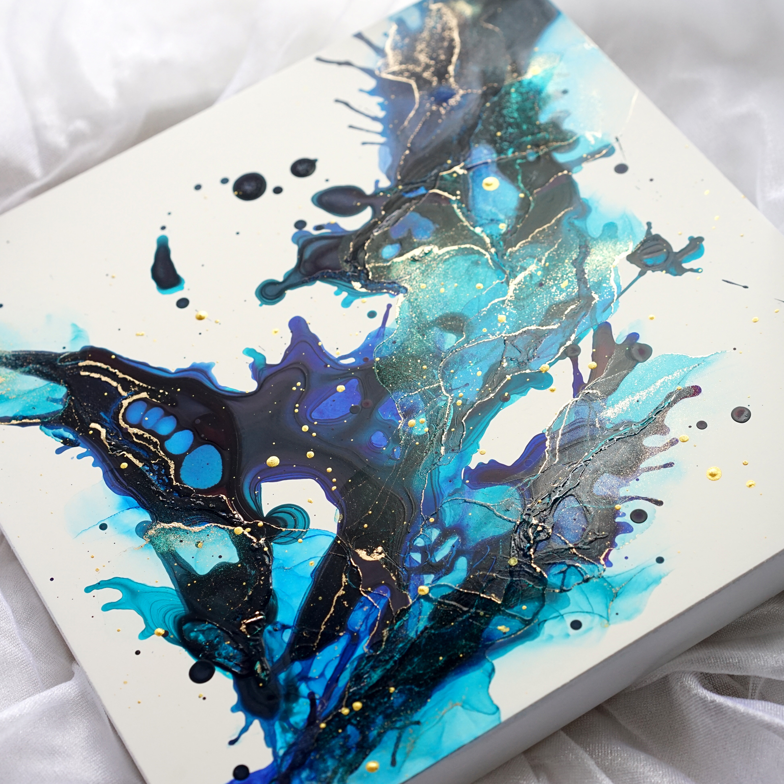 アルコールインクアートは色の混ざり方やそこから生み出される模様が毎回異なるのが魅力。