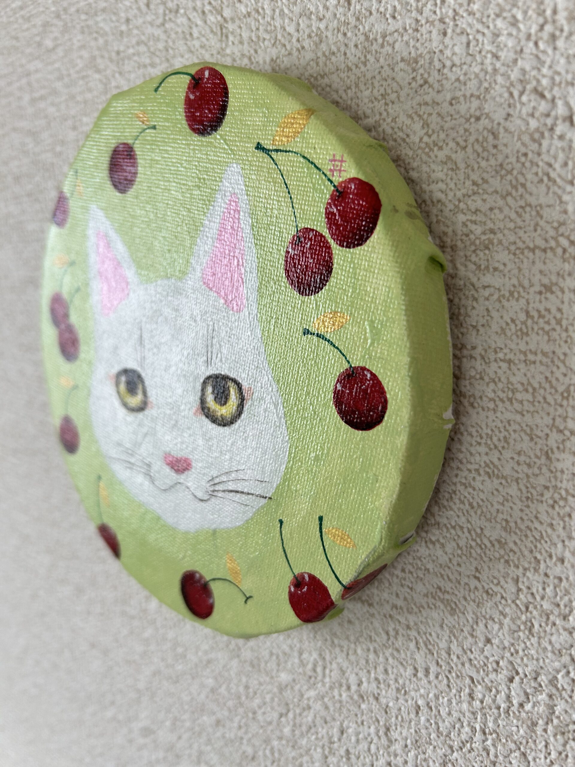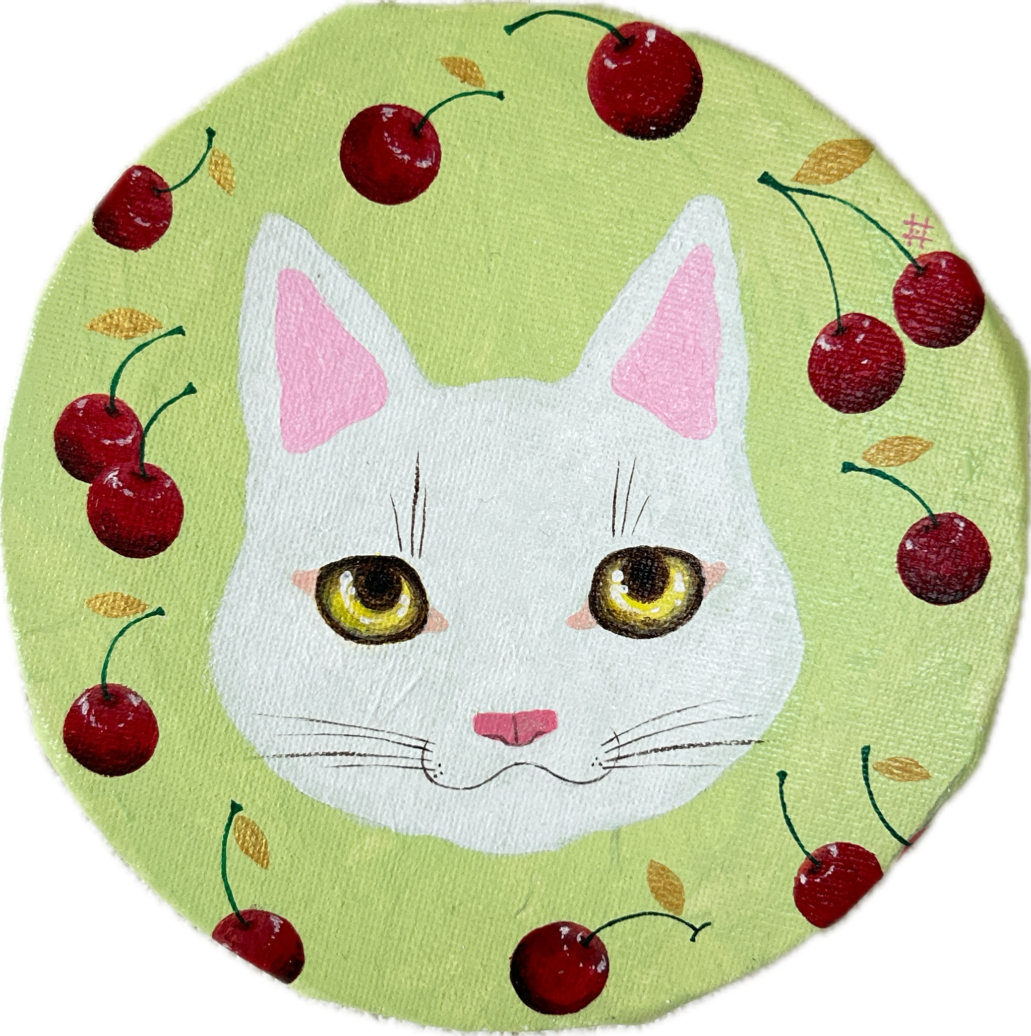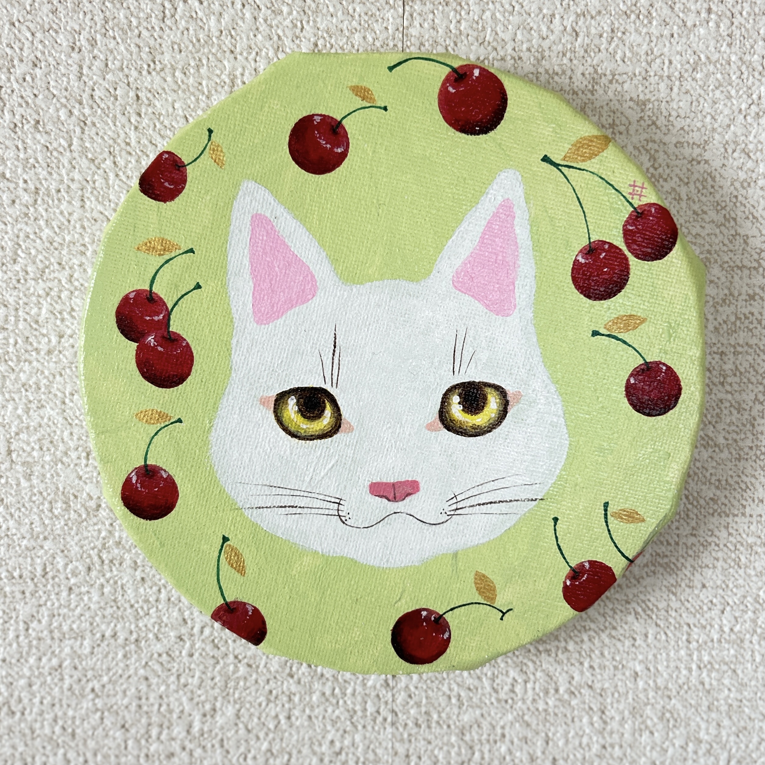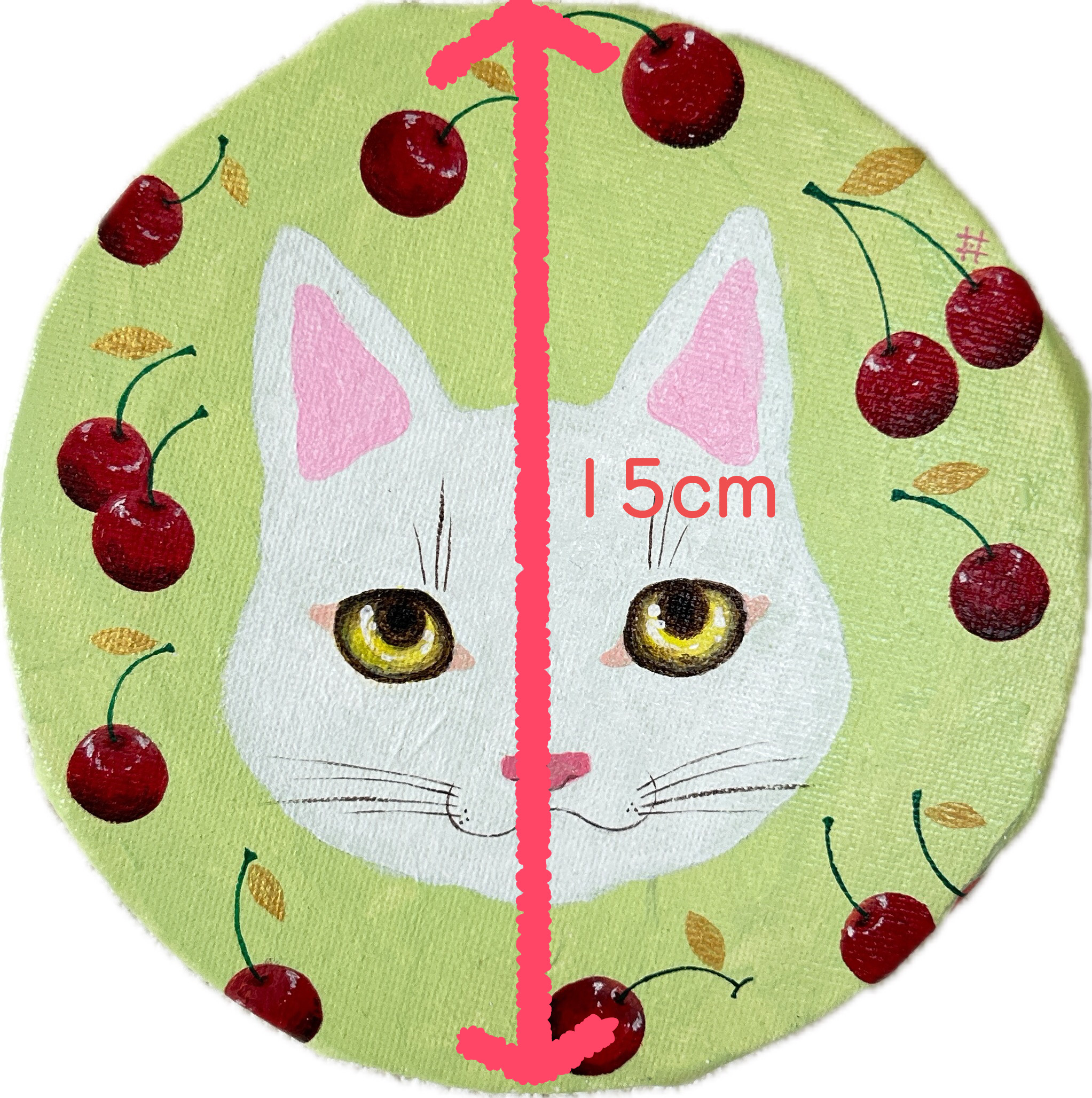 15cmの円形キャンバスに、白猫を描きました。