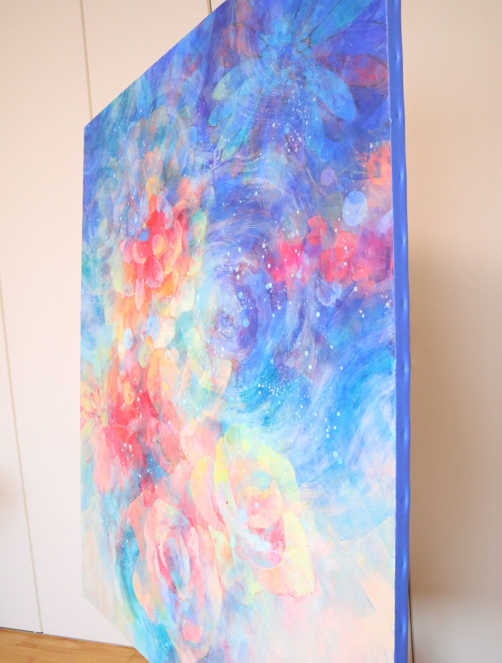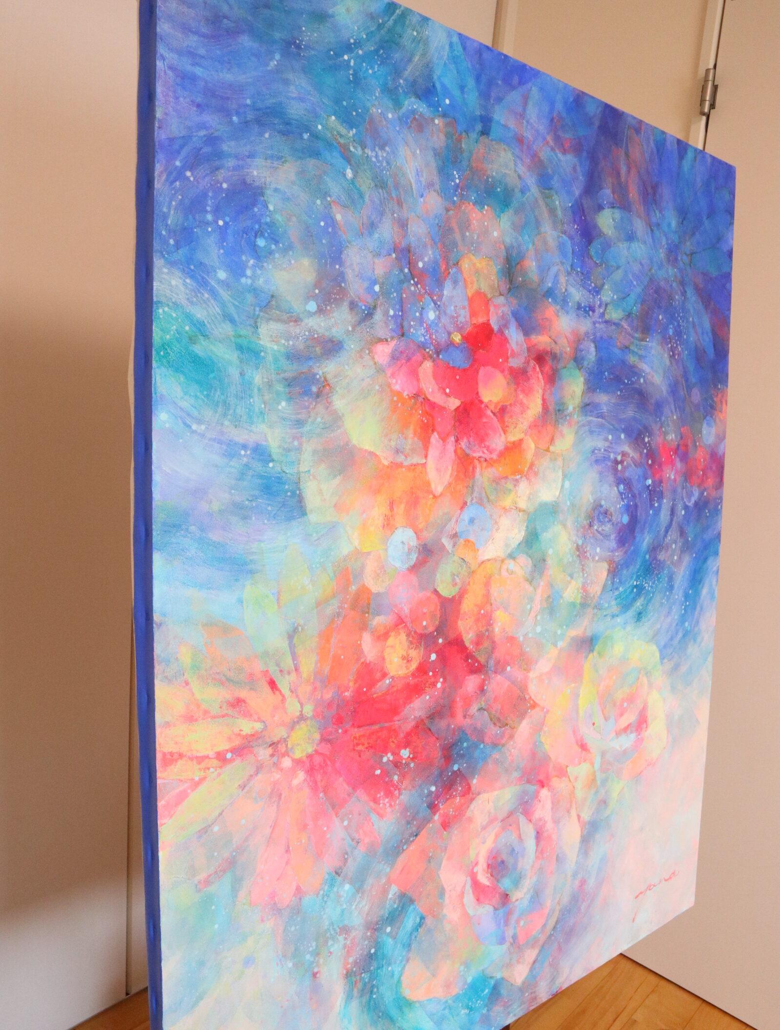 神社で見た花手水をイメージして描きました。薄く溶いた油絵具を何層にも重ねて描き、最後にローラーを使い色を重ねて深みを出しました。色の重なりの美しさを感じていただけたら、嬉しいです。