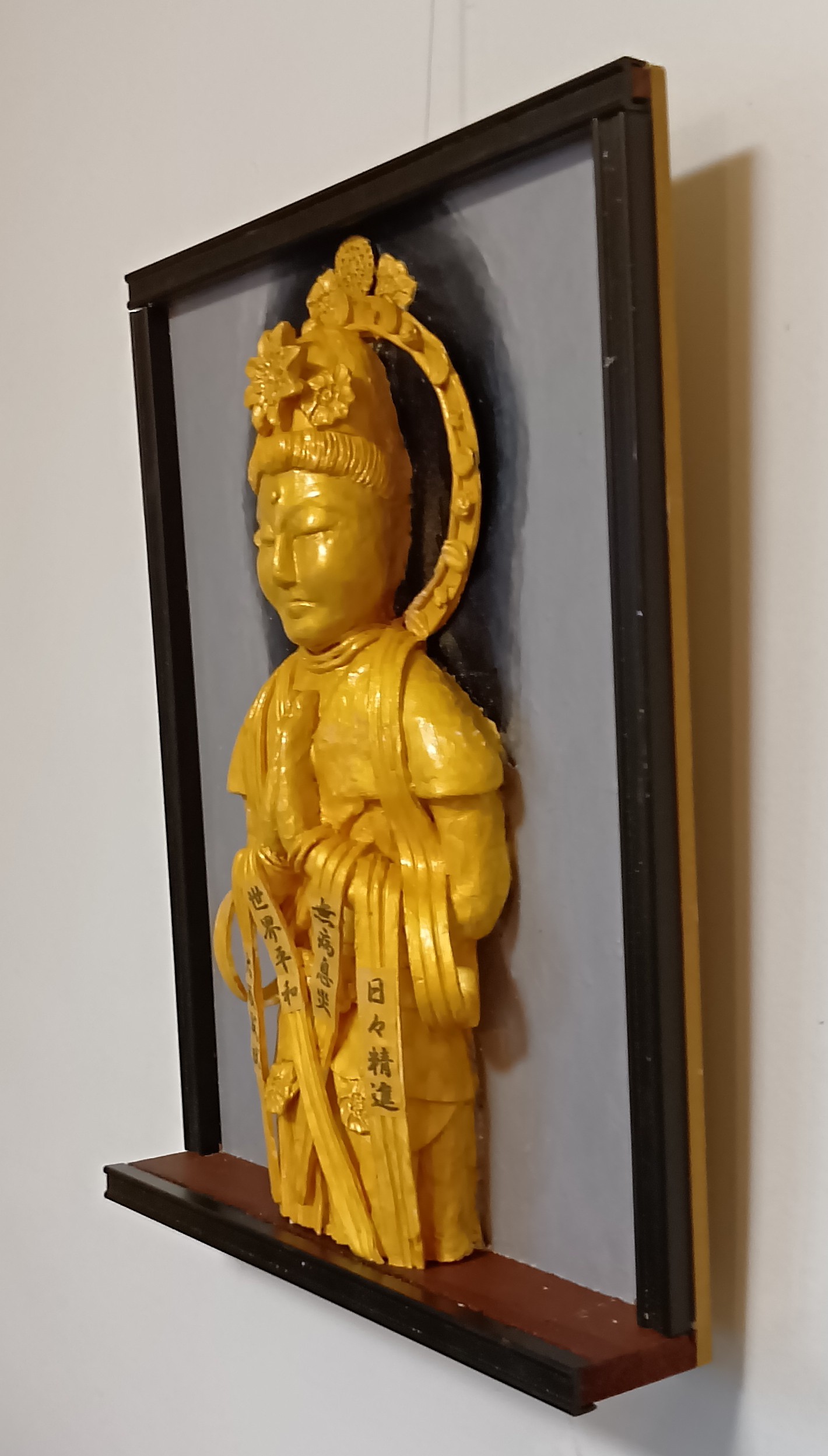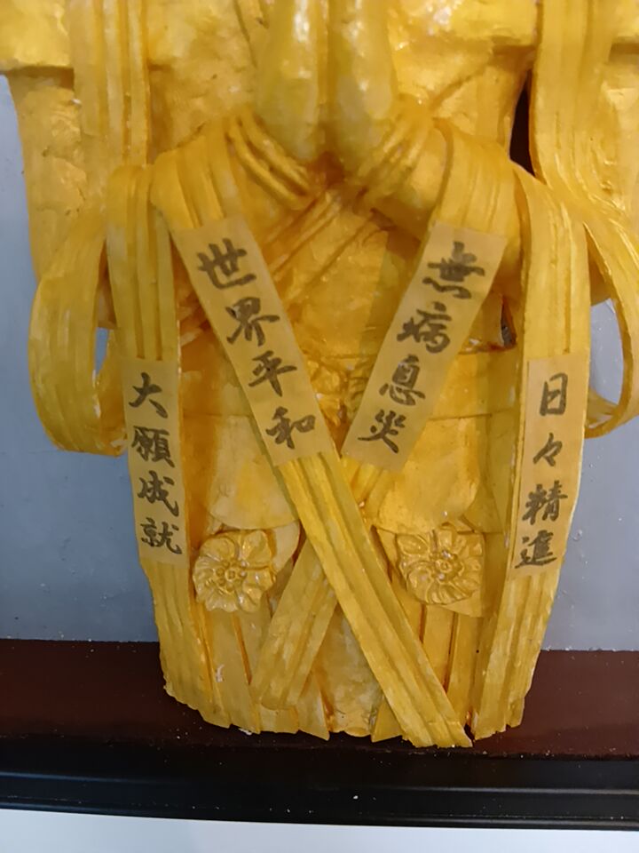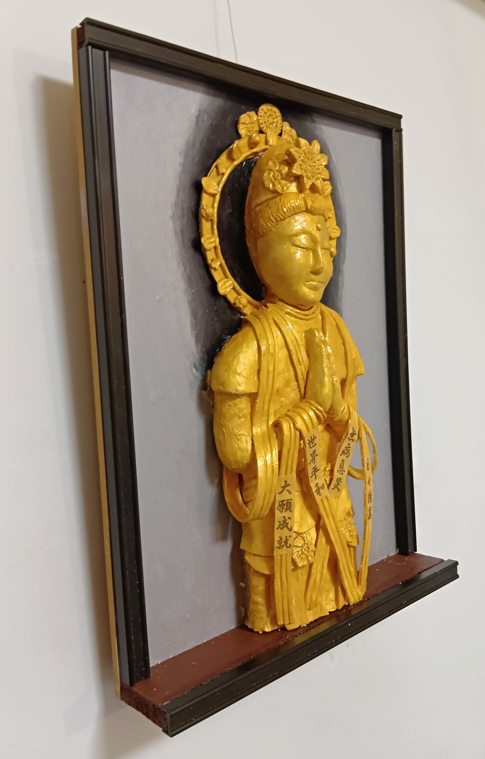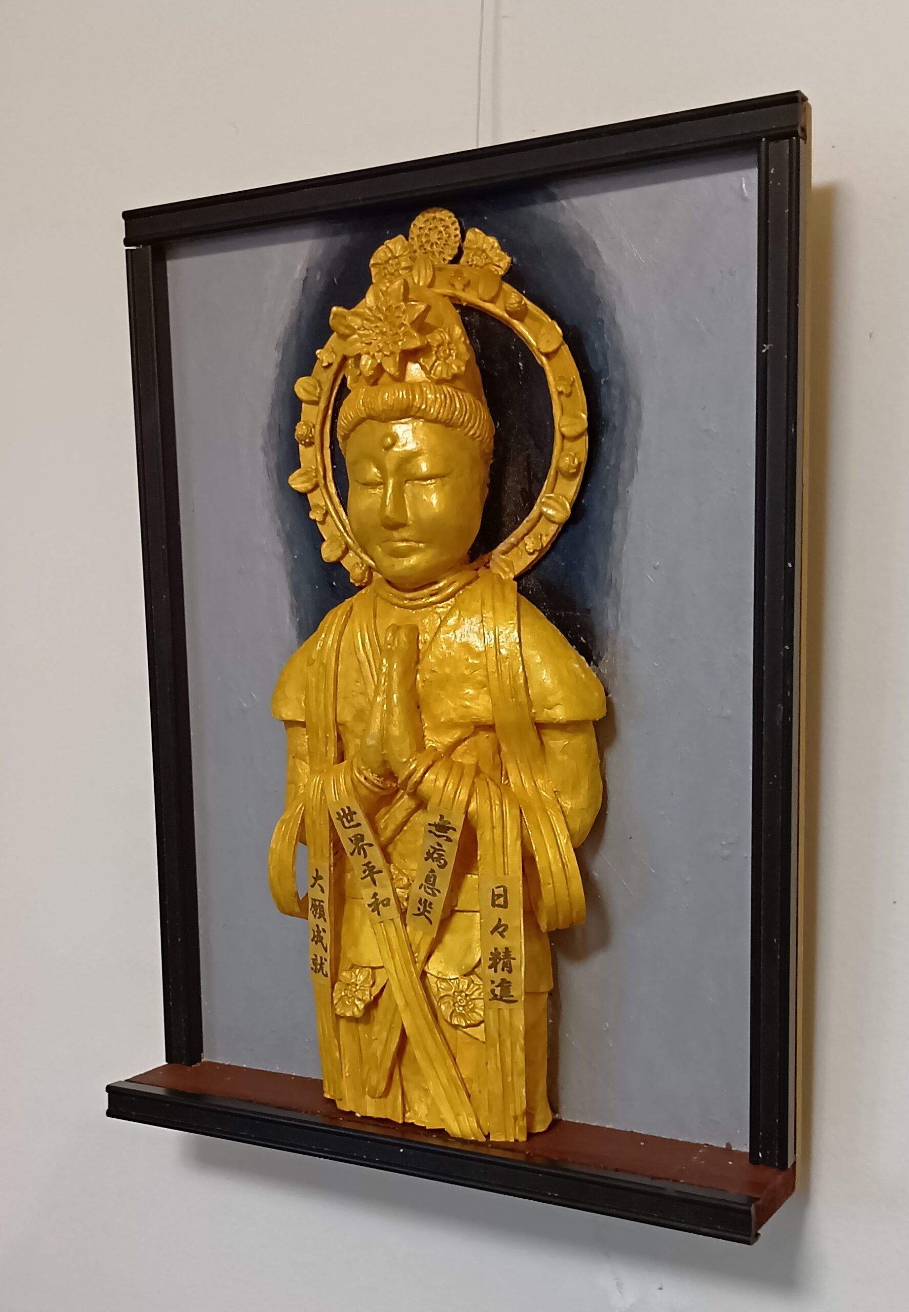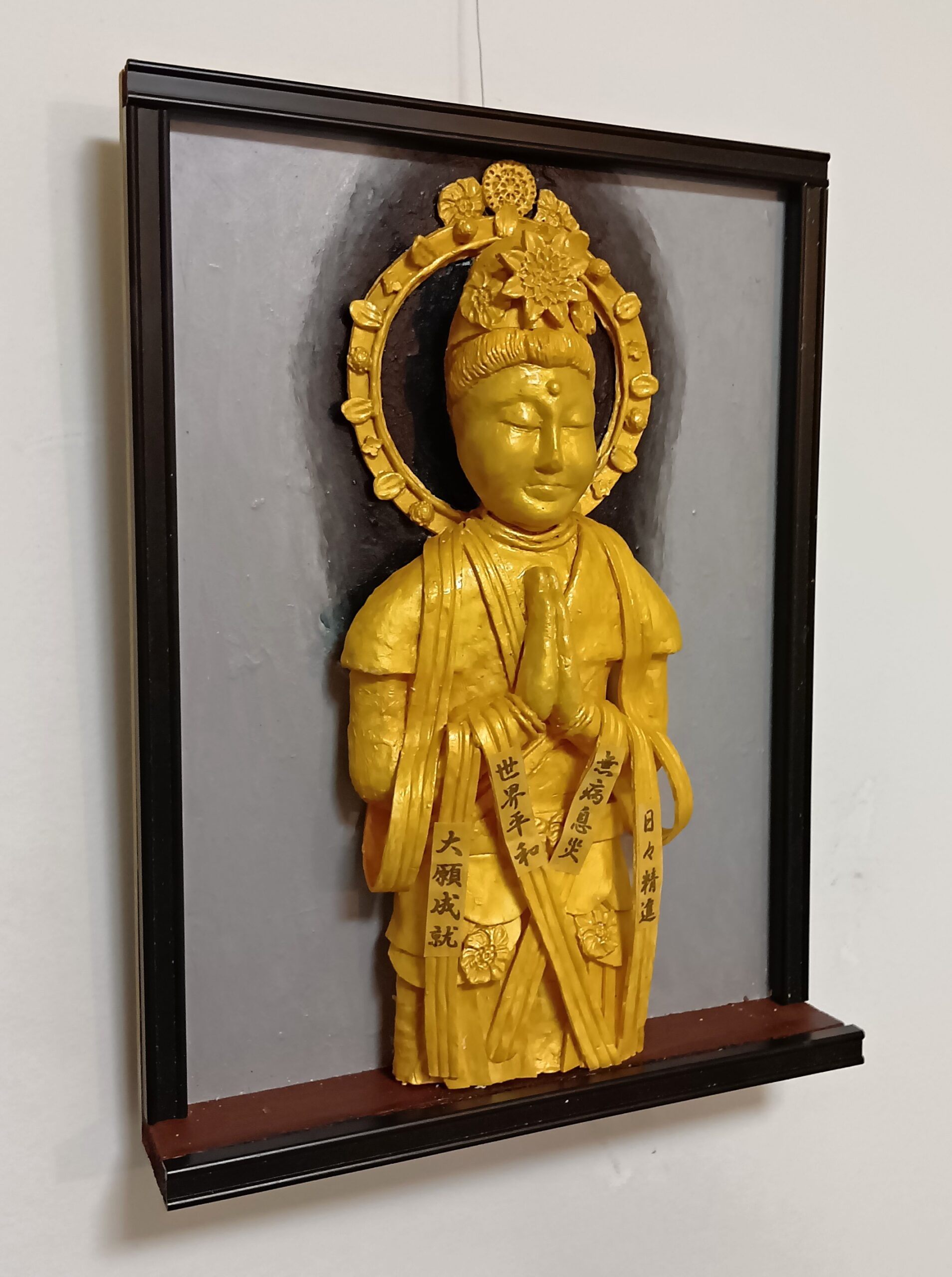 この作品は天衣に「世界平和」と、「無病息災」、「大願成就」、「日々精進」の文字を描いて、救世観音菩薩が祈祷。場所を取らない壁掛けの立体絵画にして祈願しやすくしました。