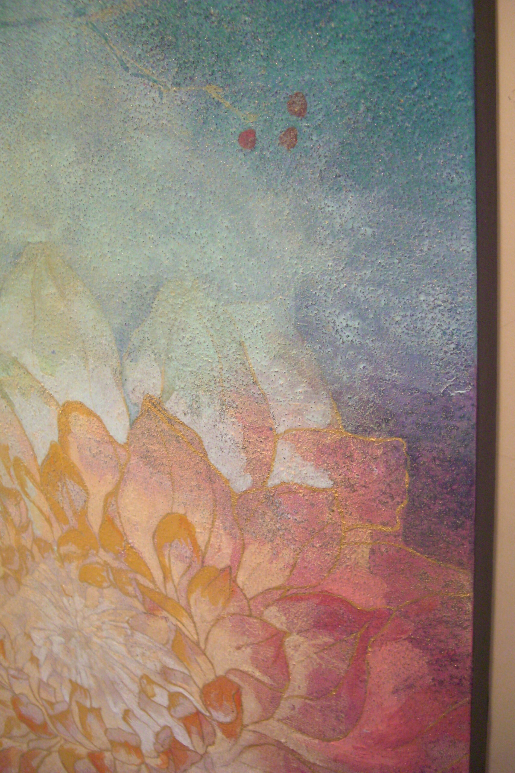 また光の当たり方で見え方が変化する画材を使用したり、縦長のサイズで余白をとることで、空間や時間帯によって見え方が変化するよう心がけ制作しました。