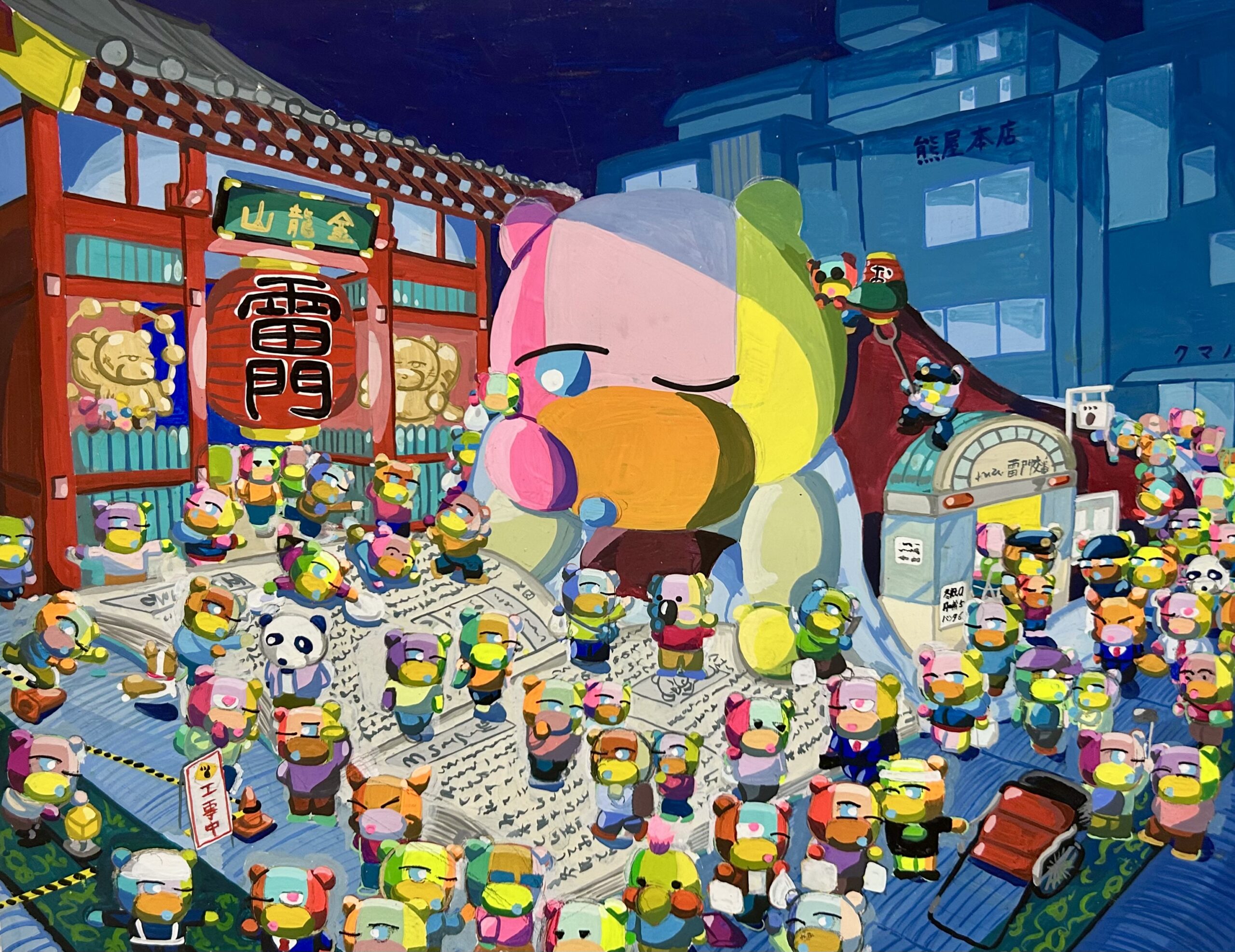 浅草雷門の提灯の明かりで読書をしているクマの様子を描きました。交番では迷子の子供を預かっています。