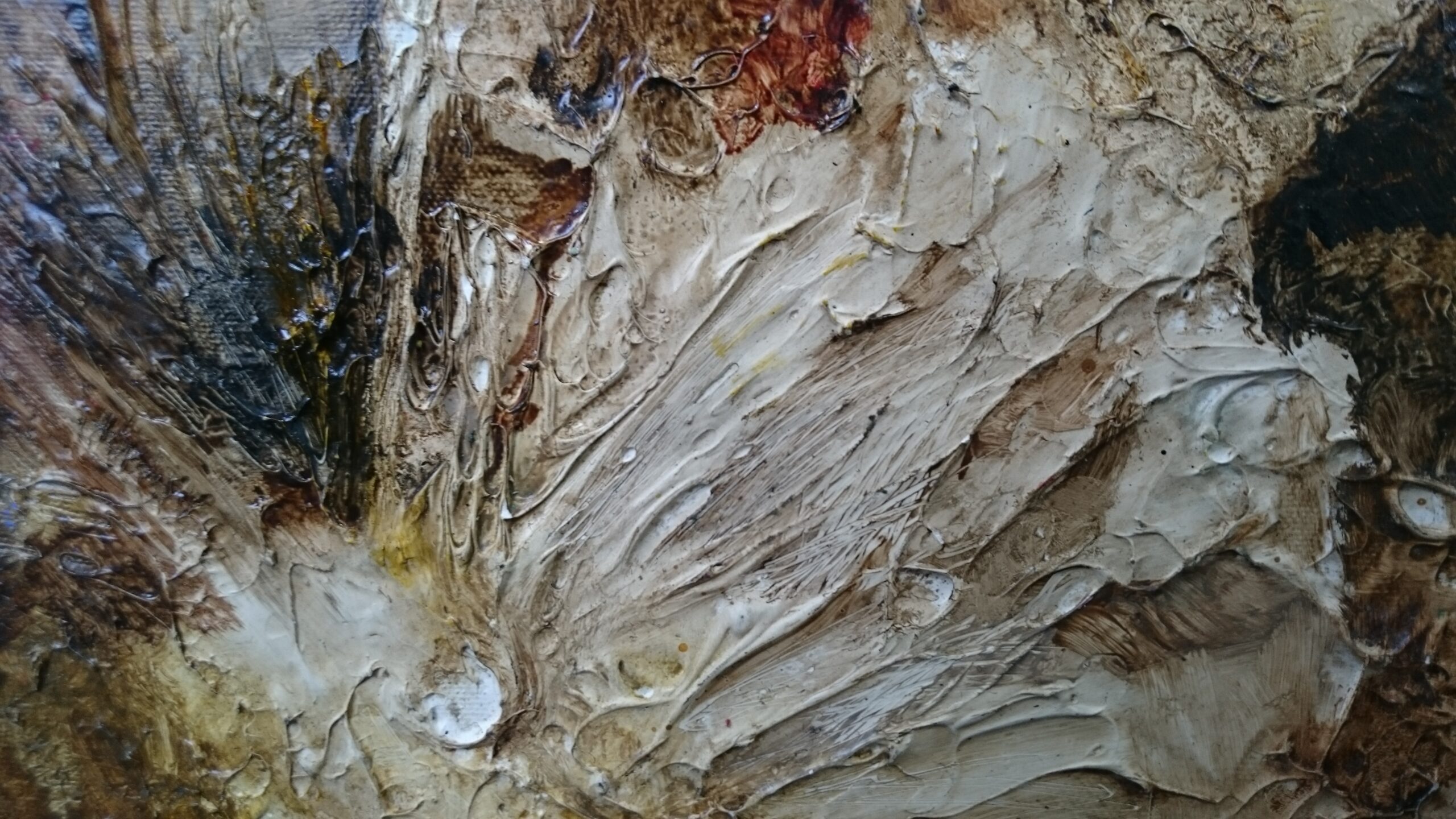 月面のクレーターをイメージして制作しました。ジェッソのマチエールと透明色がポイントです。
