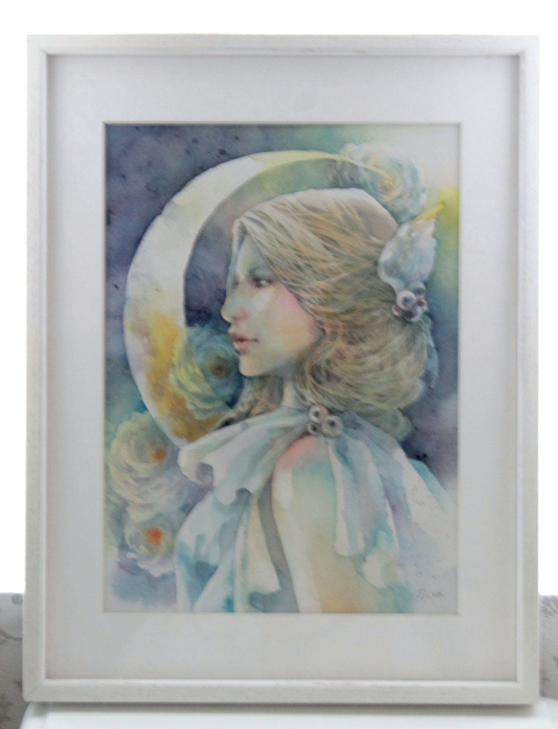 月と狩りの女神ディアーナ、その横顔。 強く美しくしなやかな女性性を併せ持ったローマ神話の女神をモチーフにした人物画。額装済みですのでお届け後すぐに飾って頂けます。 シャビー感のある白い木製額(太子)に入っています。